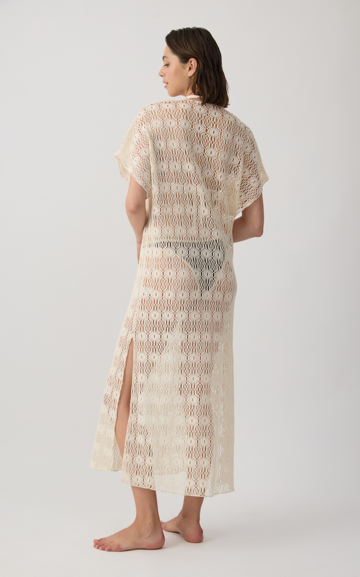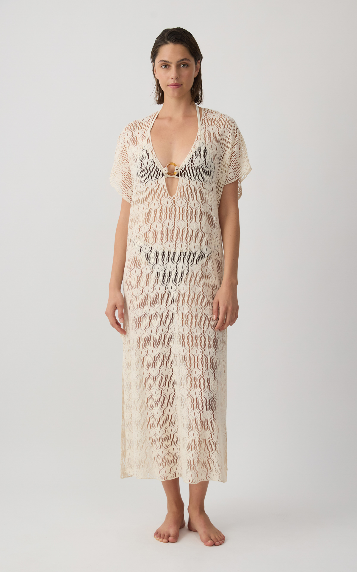 • Μακρύ Γυναικείο Κοντομάνικο Φόρεμα με Δαντελωτή Ύφανση & κρίκο