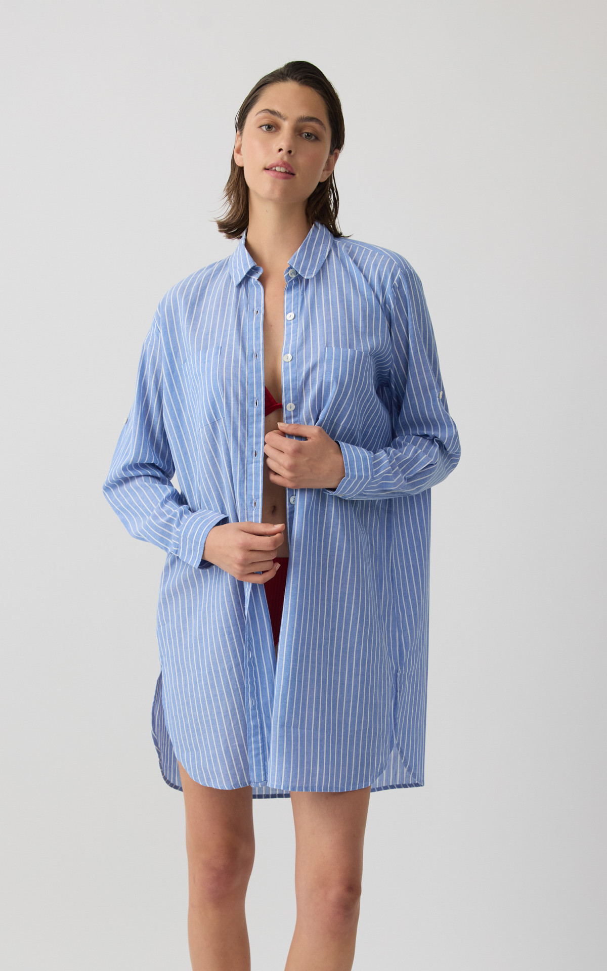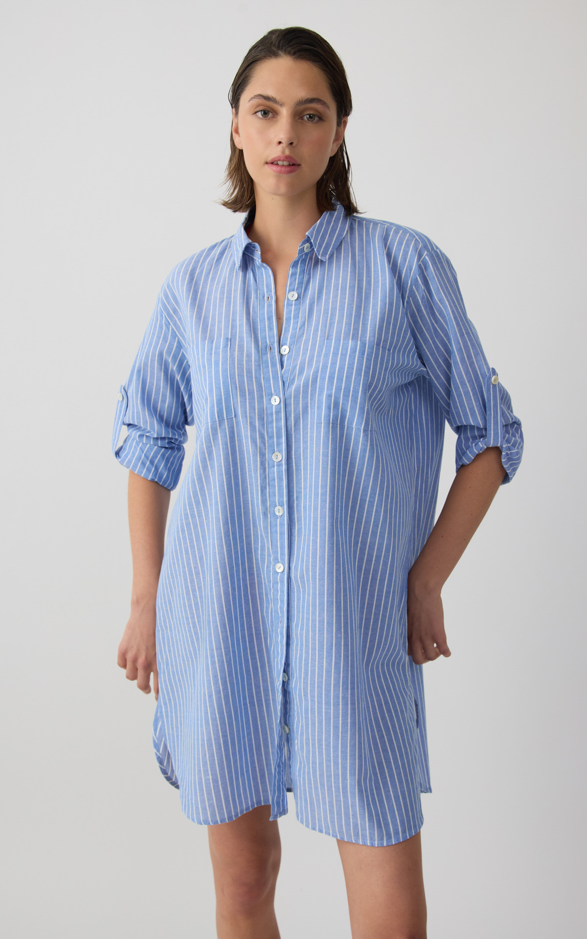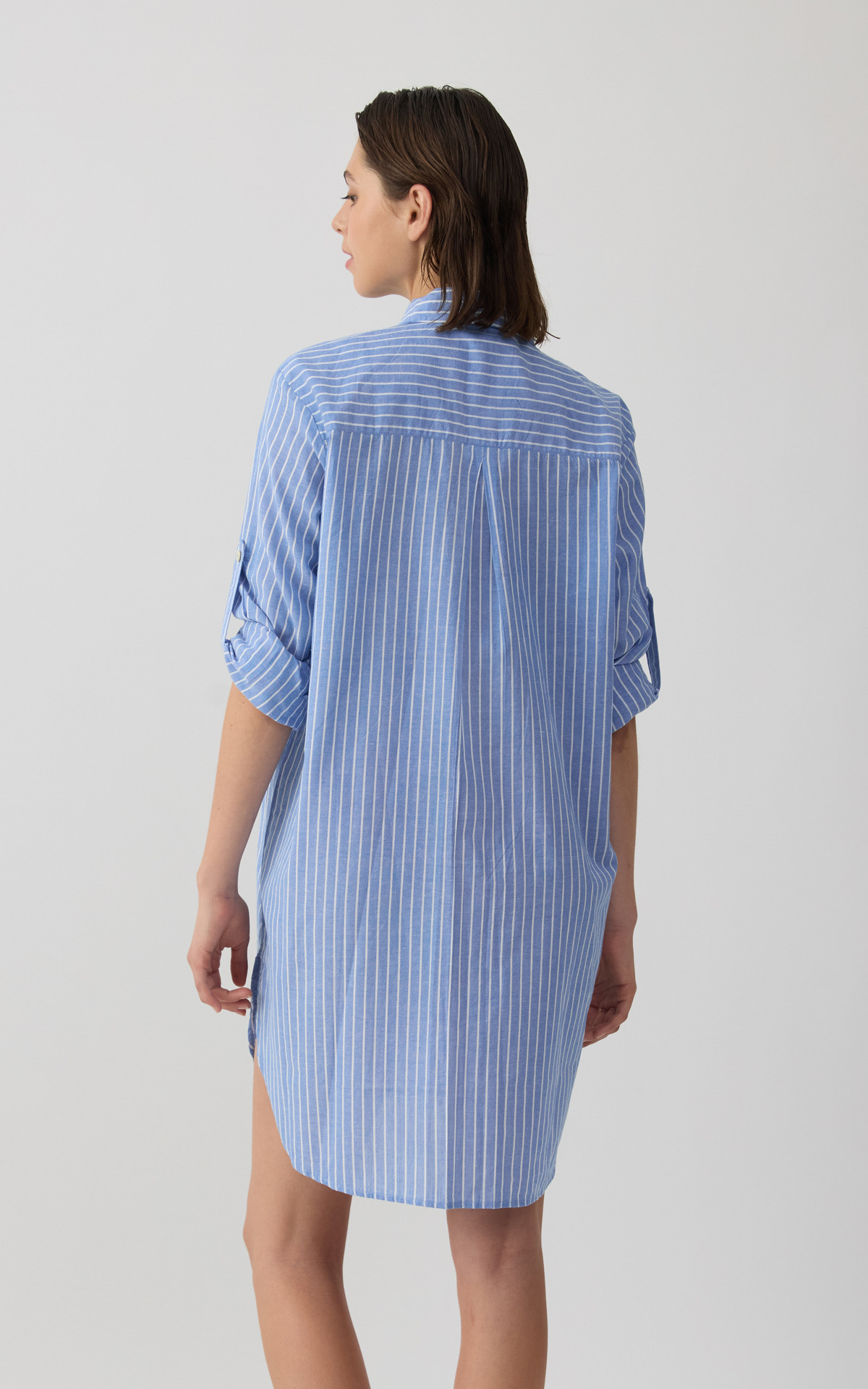 • Ριγέ Γαλάζια Γυναικεία Μακριά Πουκαμίσα