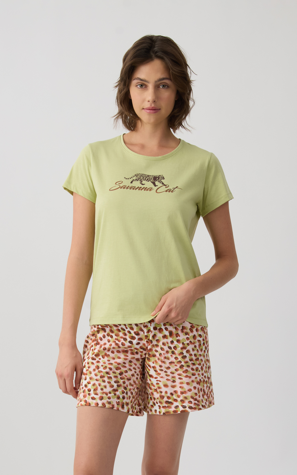 Pyjama set made from 100% premium-quality cotton, offering a soft feel and comfortable wear during sleep. The set includes a solid-colored short-sleeve top with a decorative chest print, paired with printed short shorts featuring an elastic waistband for a comfortable fit.