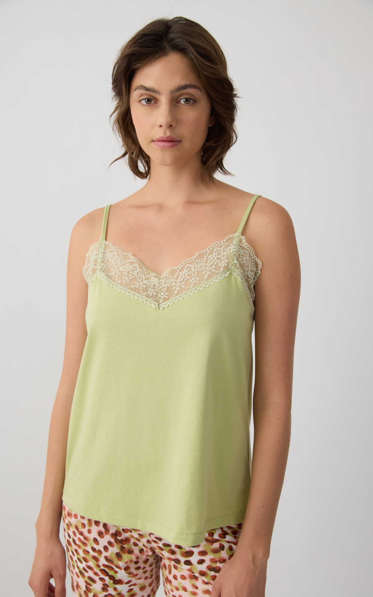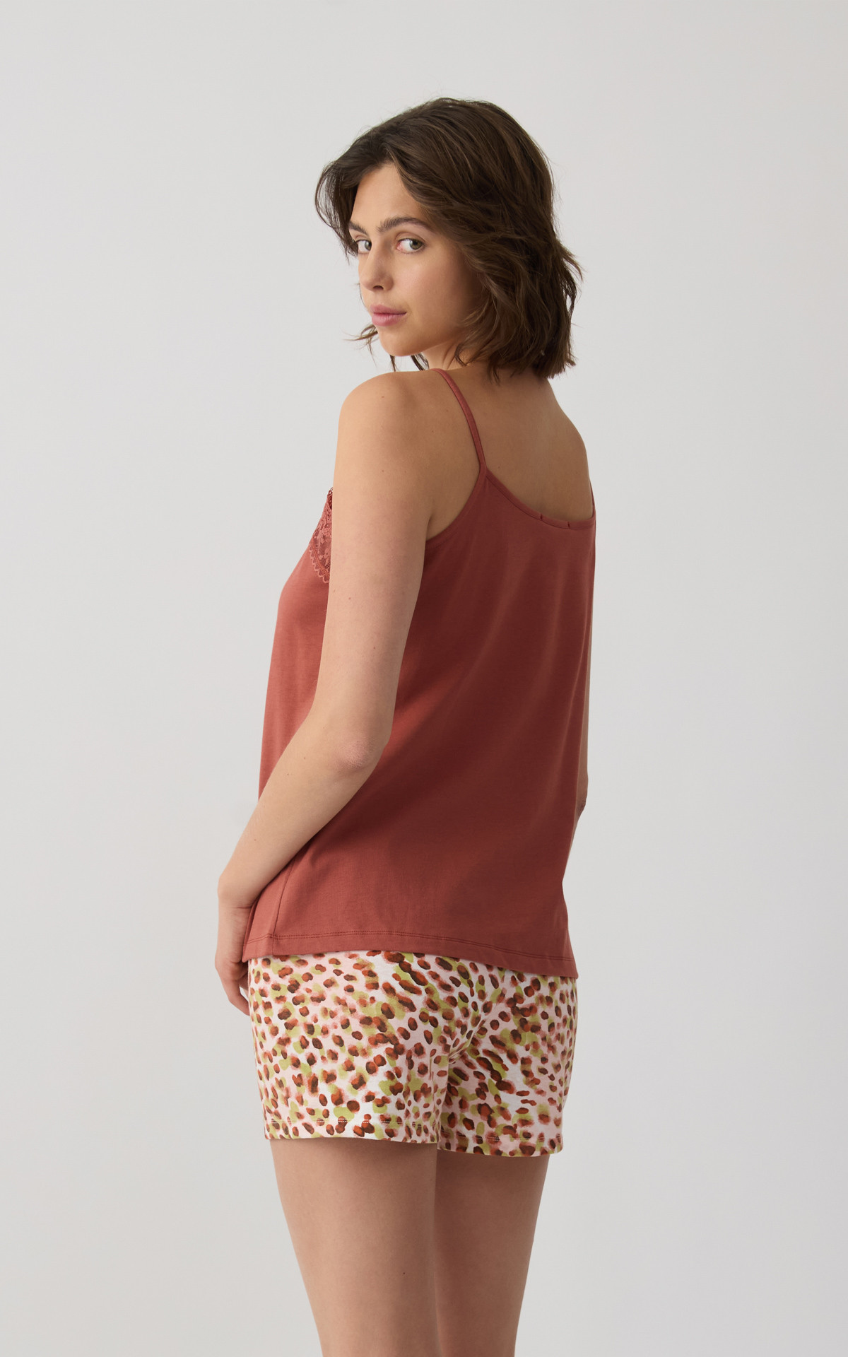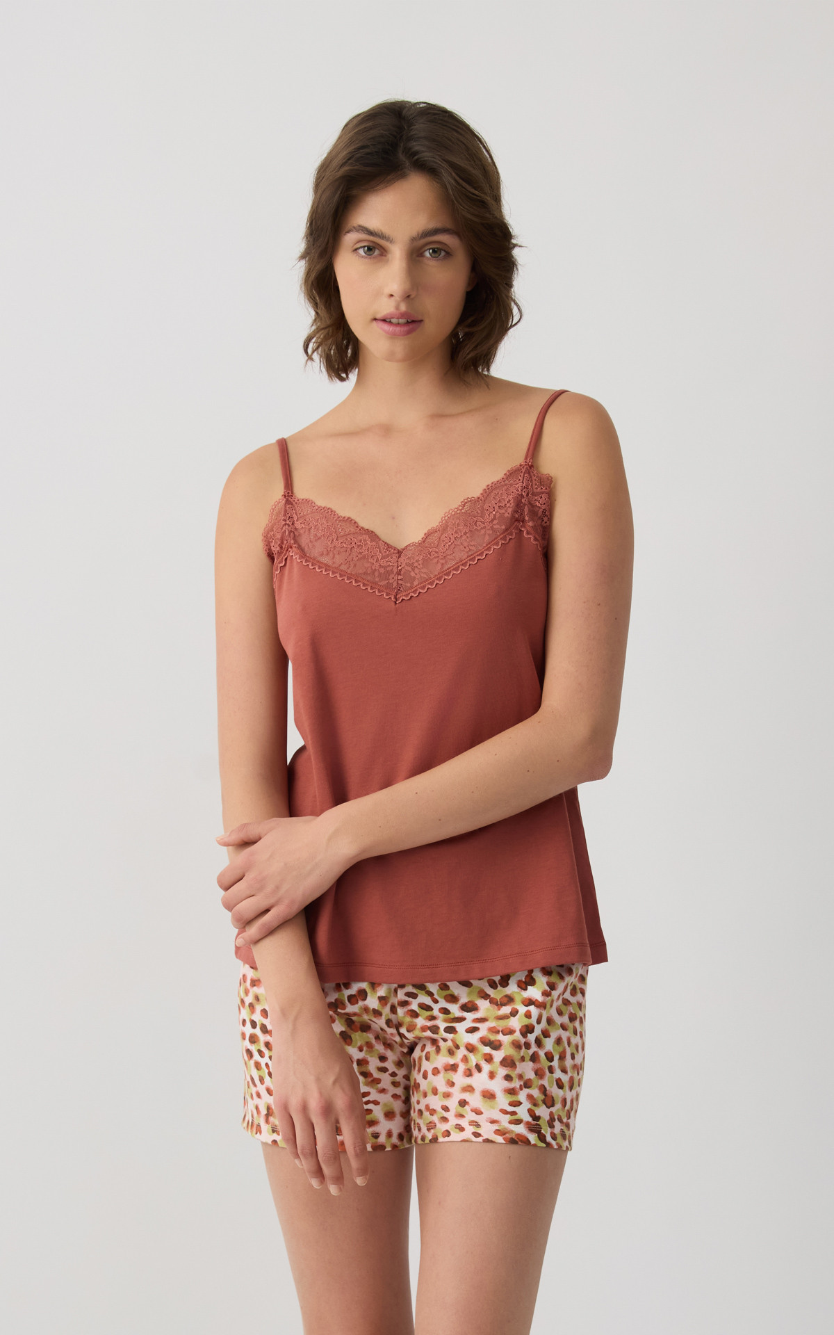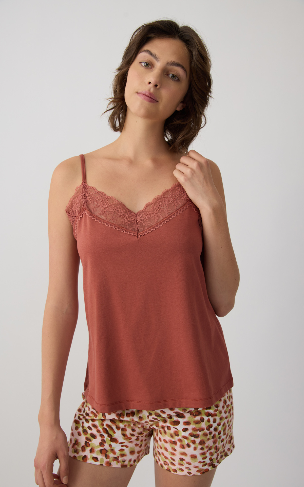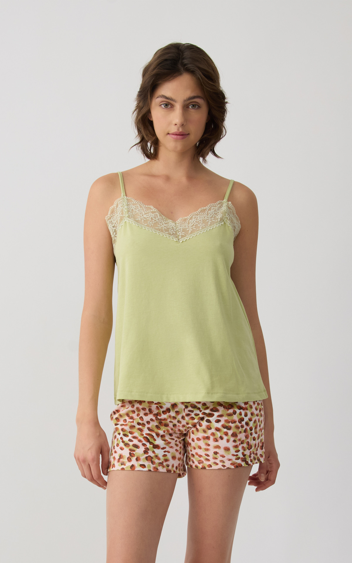 Pyjama set made from 100% premium-quality cotton, offering a soft feel and comfortable wear during sleep. The set includes a solid-colored camisole top with thin straps and delicate lace detailing at the neckline, paired with printed short shorts featuring an elastic waistband for a comfortable fit.
