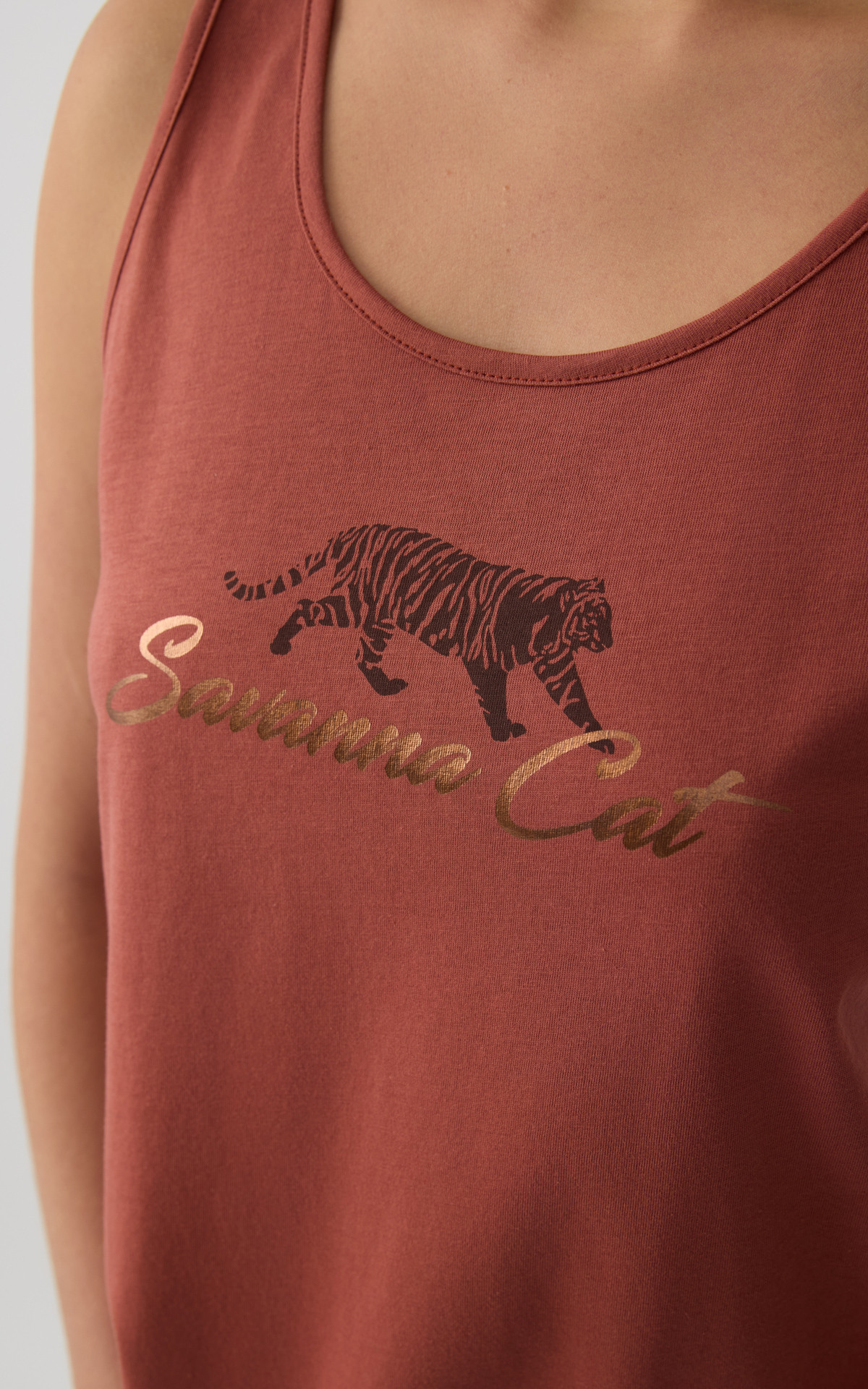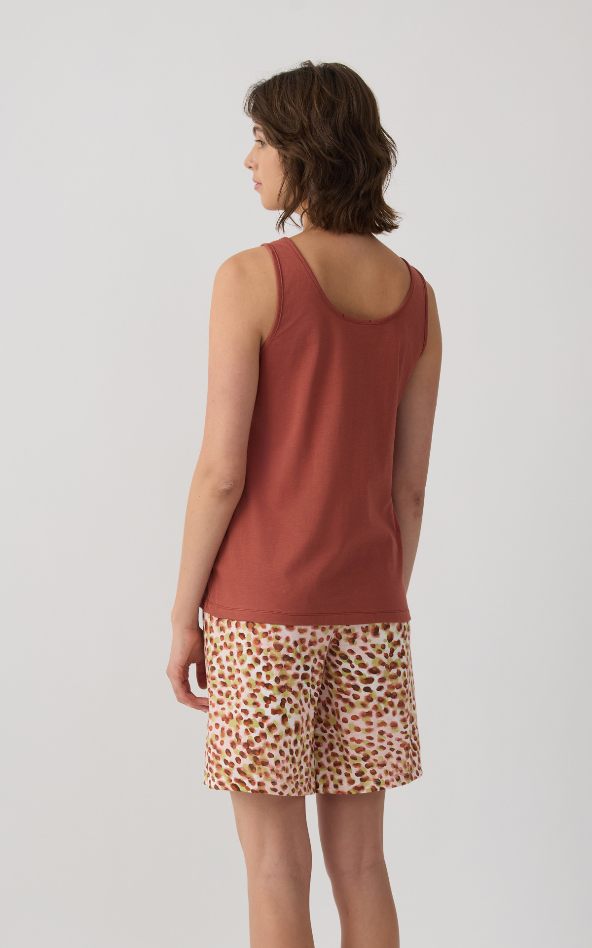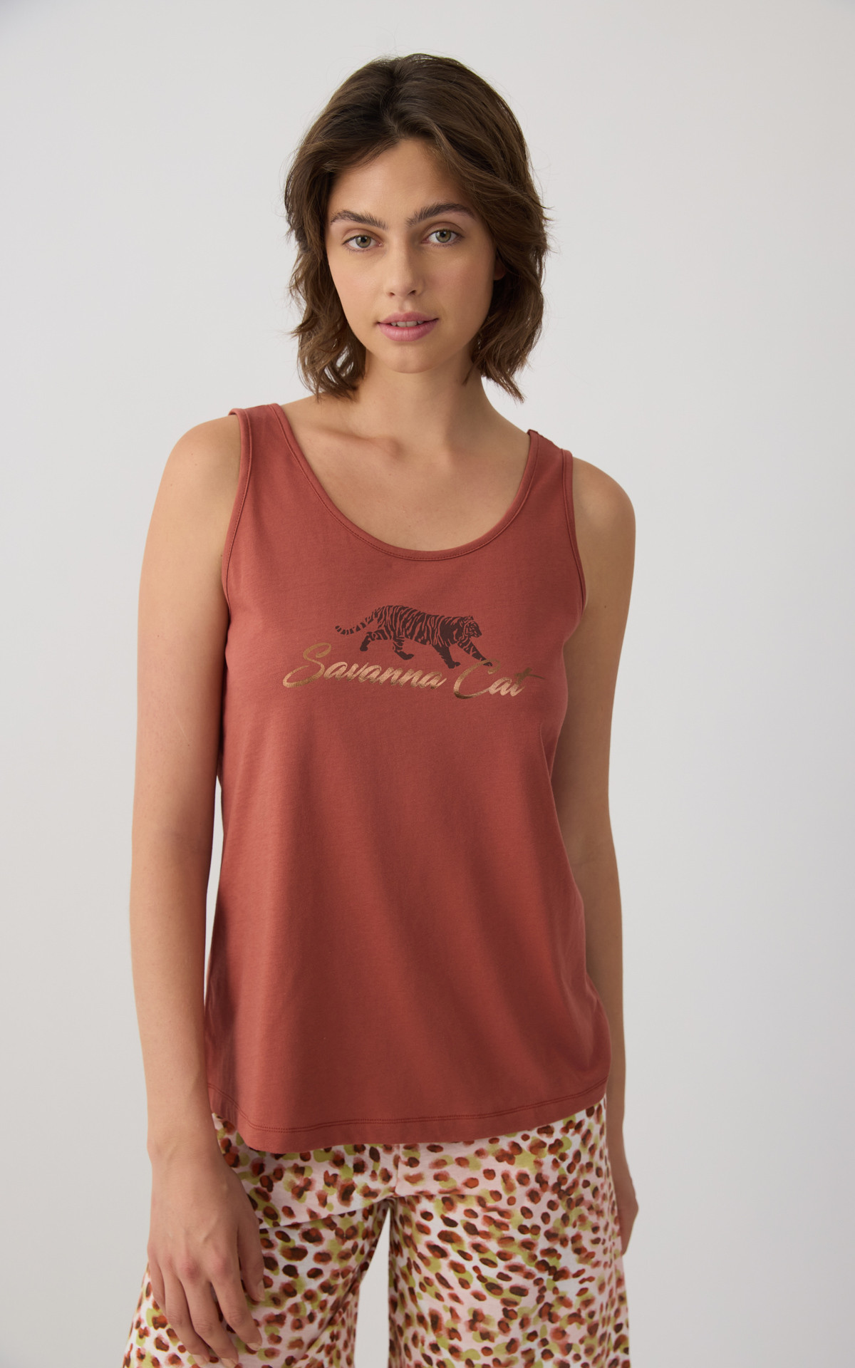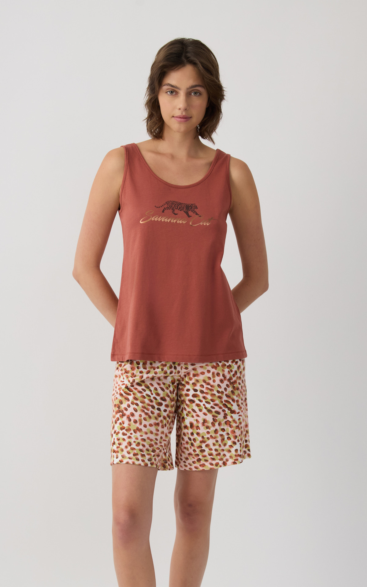 Pyjama set made from 100% premium-quality cotton fabric, offering a soft feel and breathable comfort. The set includes a sleeveless top with a decorative chest print, paired with printed short shorts featuring an elastic waistband for a comfortable and secure fit.