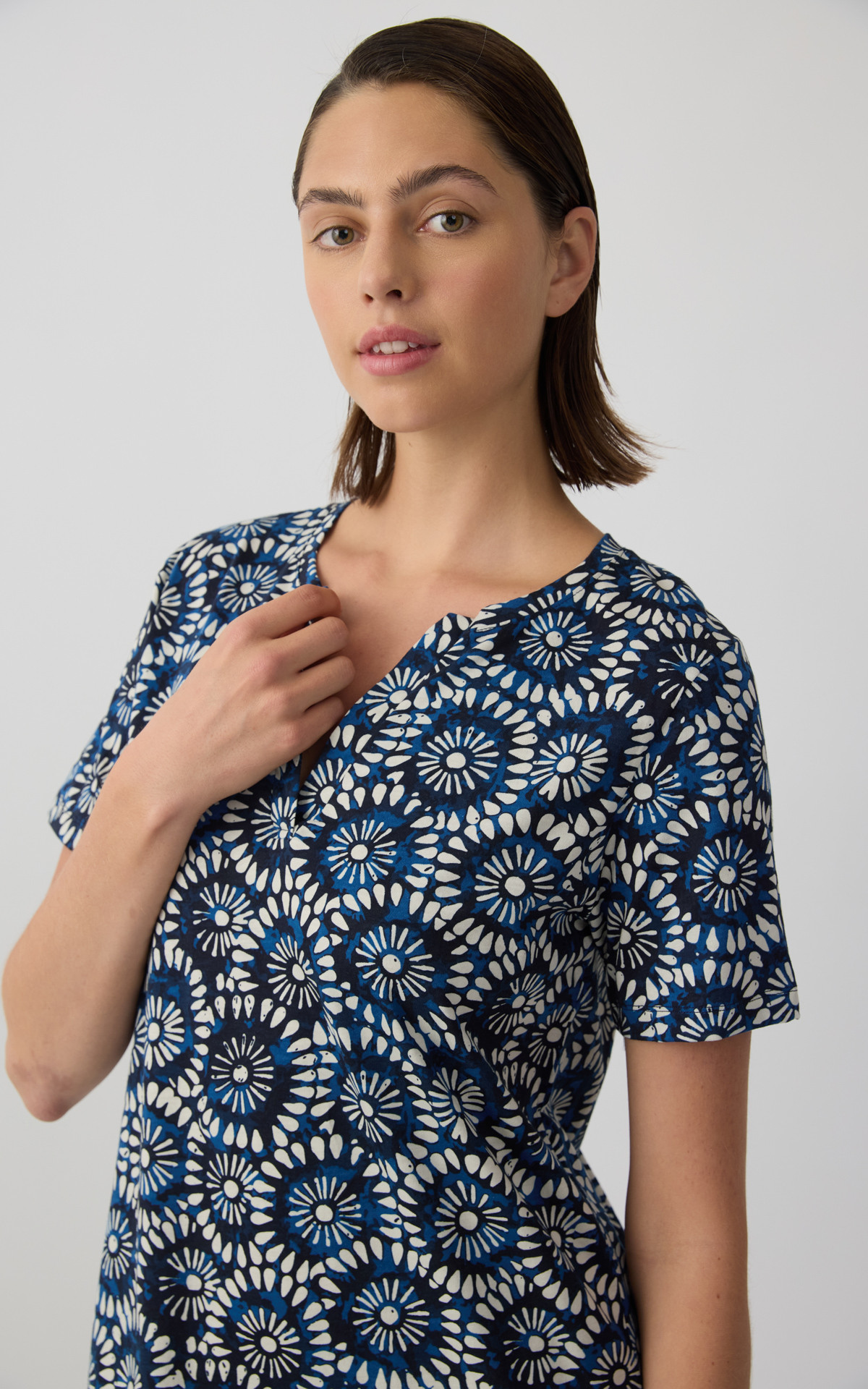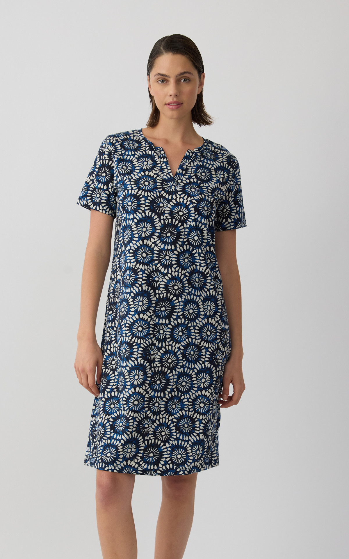 Short-sleeve nightdress with an elegant all-over print that adds a modern and feminine touch. Made from 100% premium-quality cotton fabric, it offers a light and breathable feel for comfortable sleep.