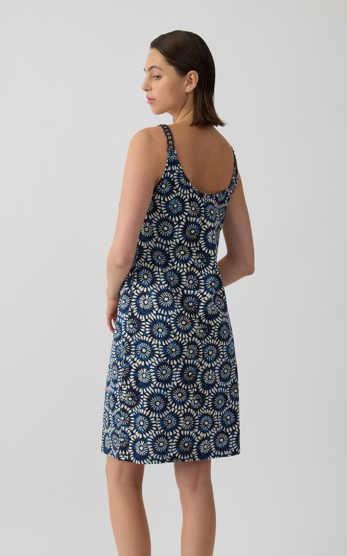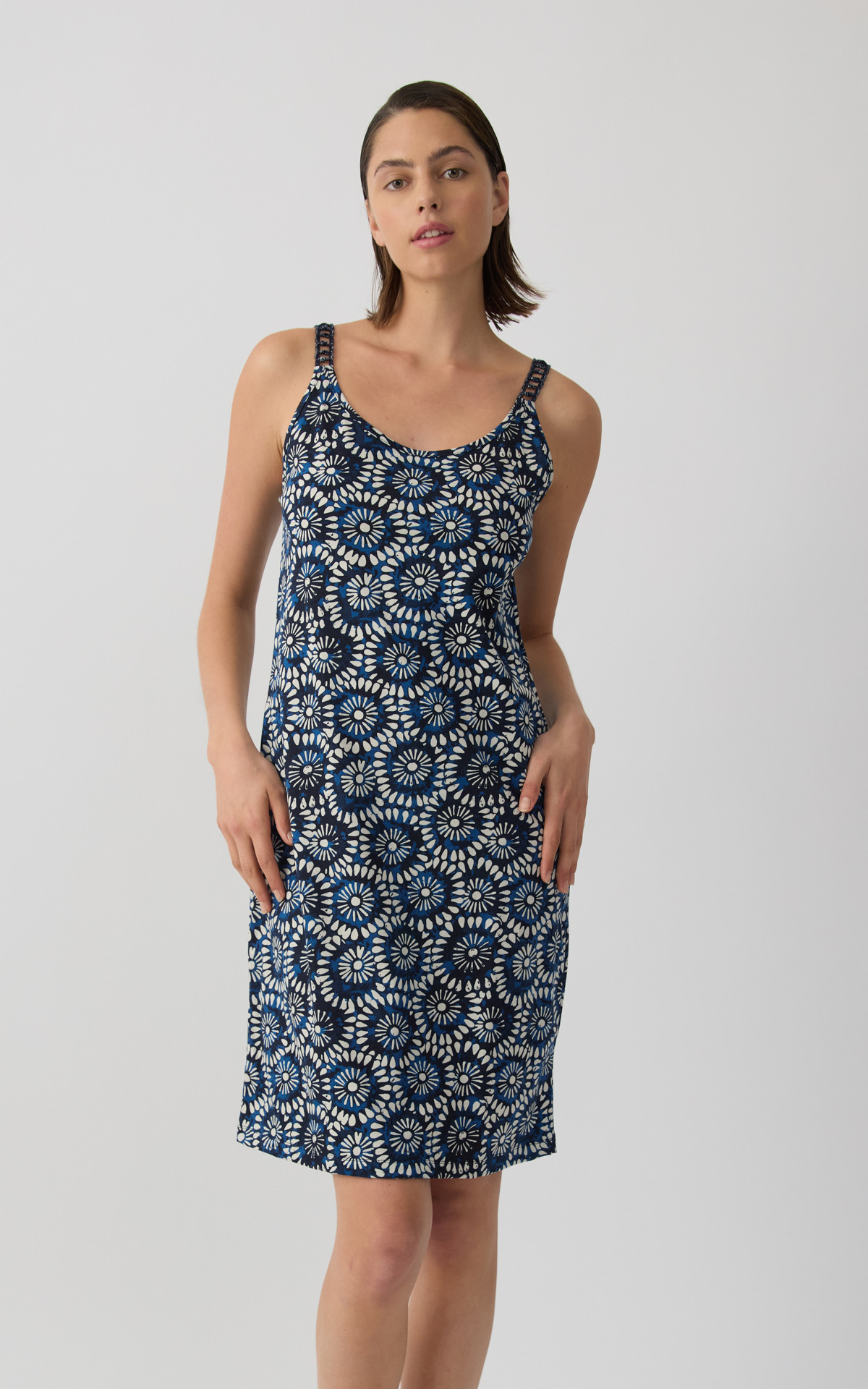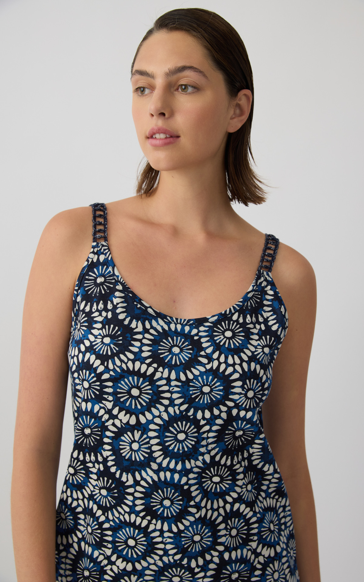 Sleeveless nightdress with straps and an elegant all-over print that adds a feminine and summery style. Made from 100% premium-quality cotton fabric, it offers a light and comfortable feel throughout the night.