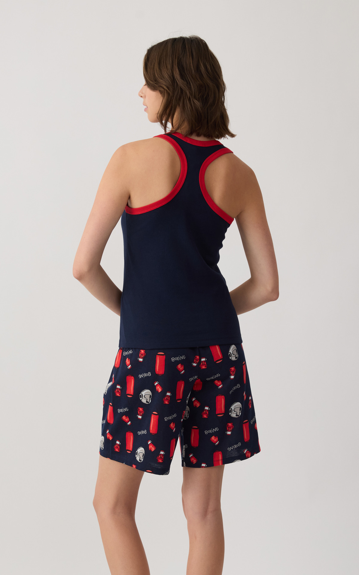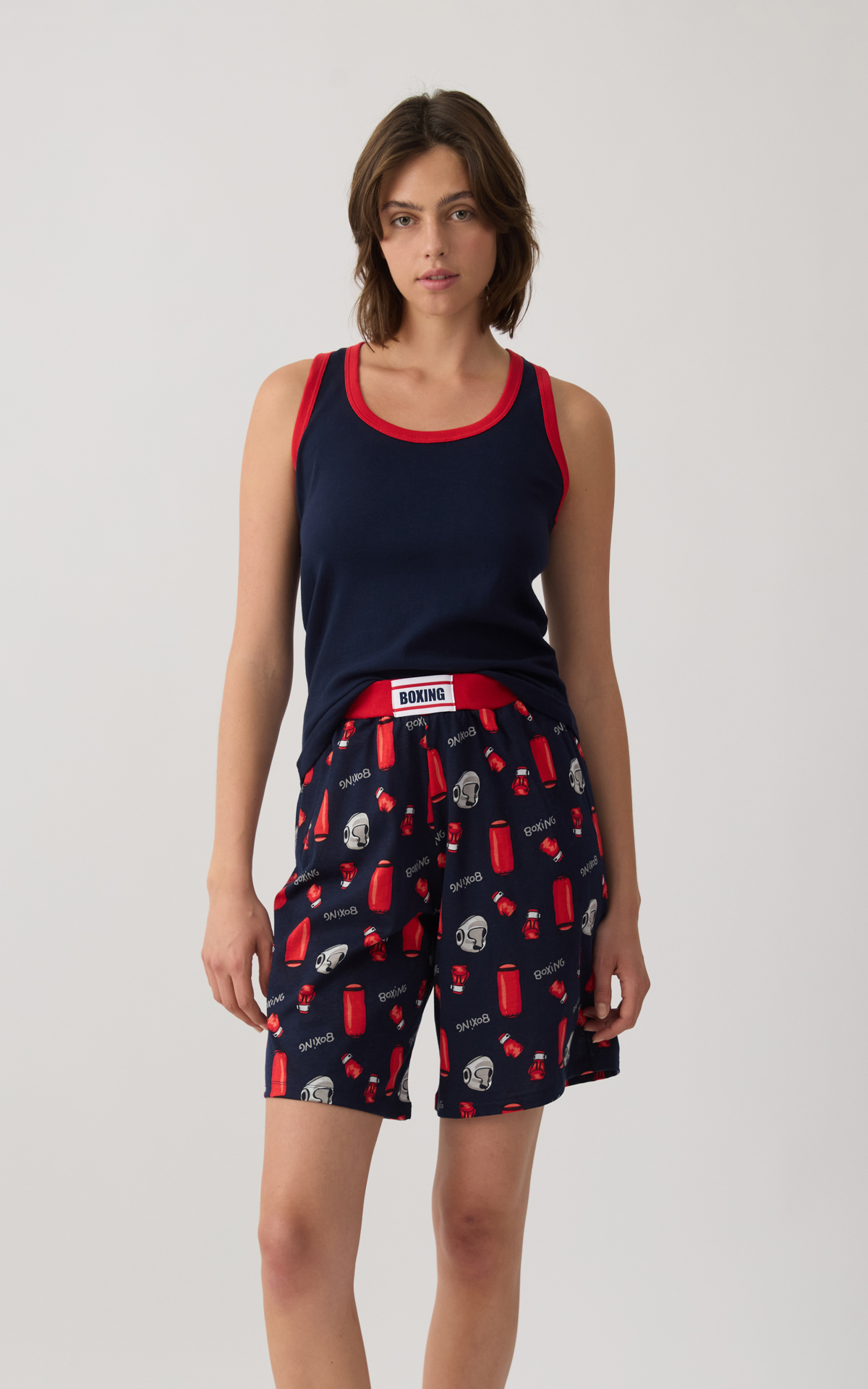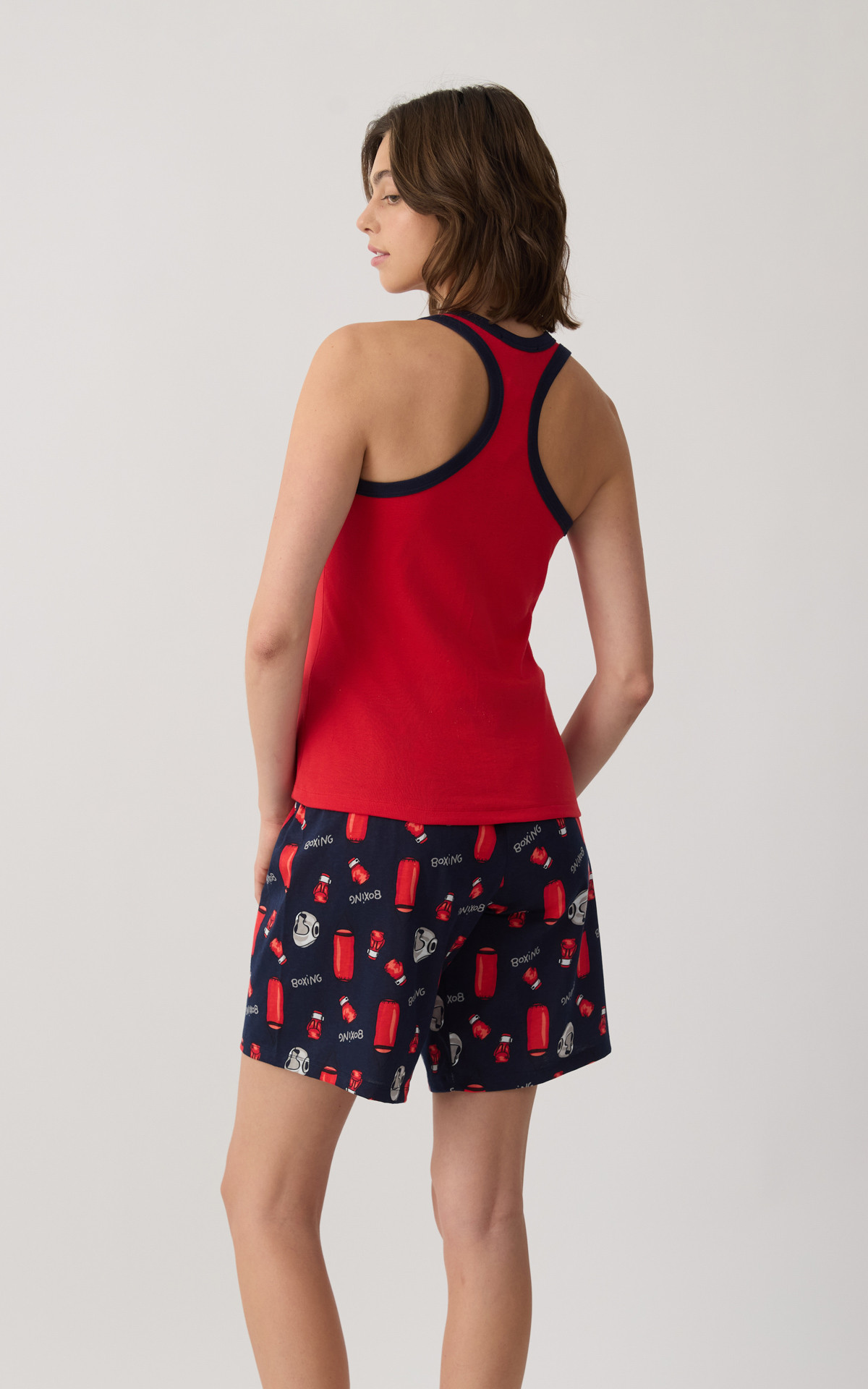Women's pajamas made from 100% premium-quality cotton for a soft feel and all-day comfort. The set includes a sleeveless athletic-style top and long printed shorts with a wide elastic waistband for a secure and comfortable fit. Ideal for restful sleep and relaxing moments at home.