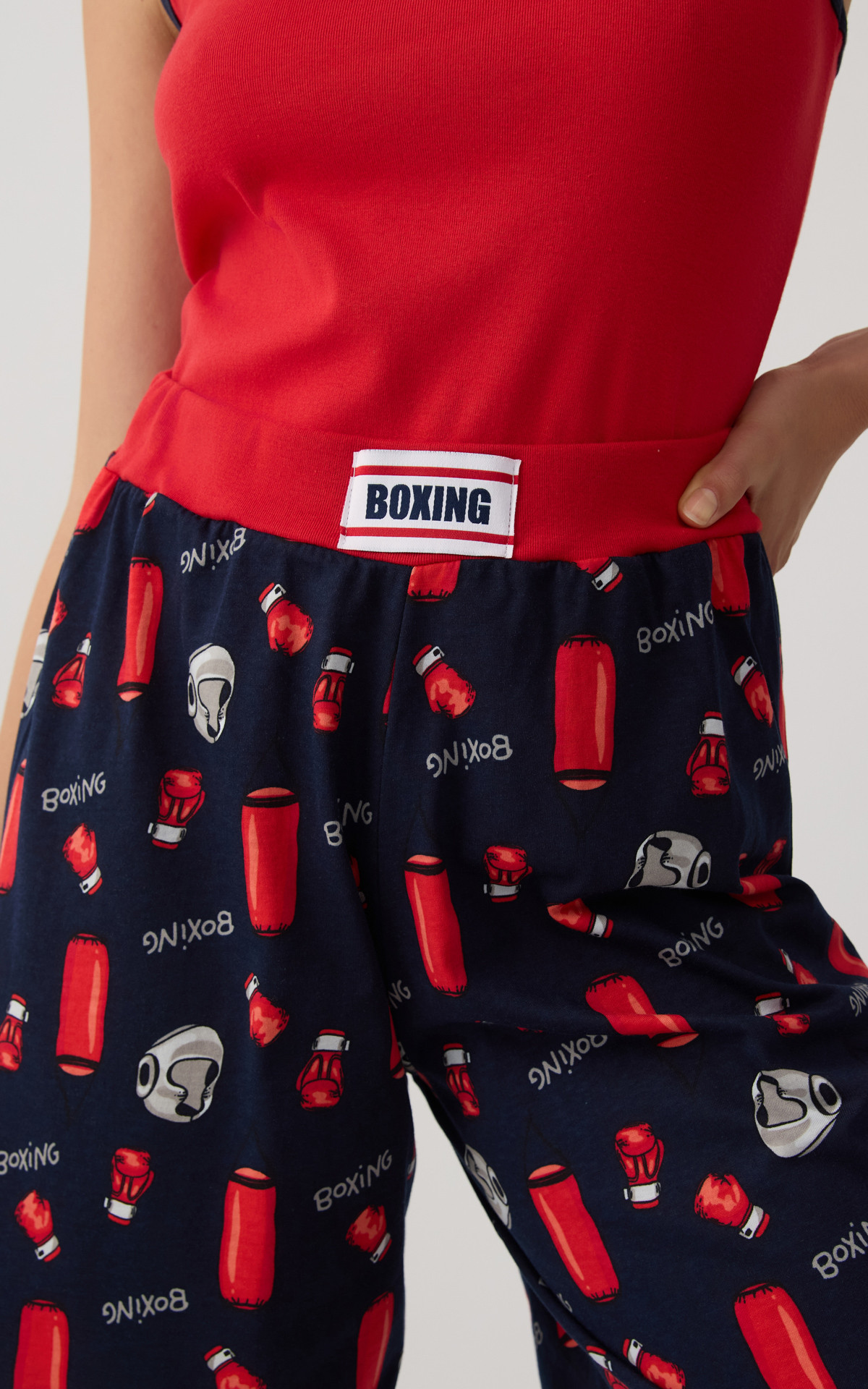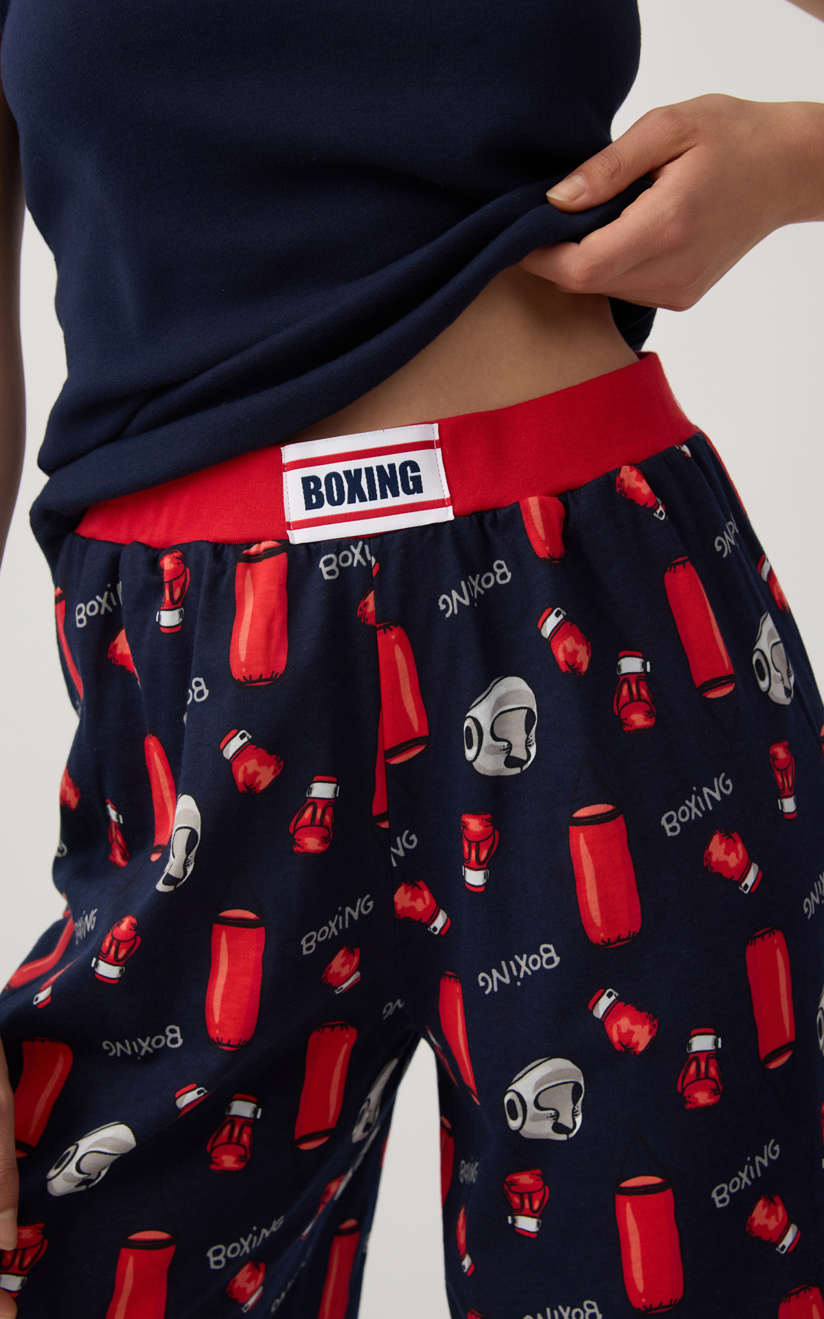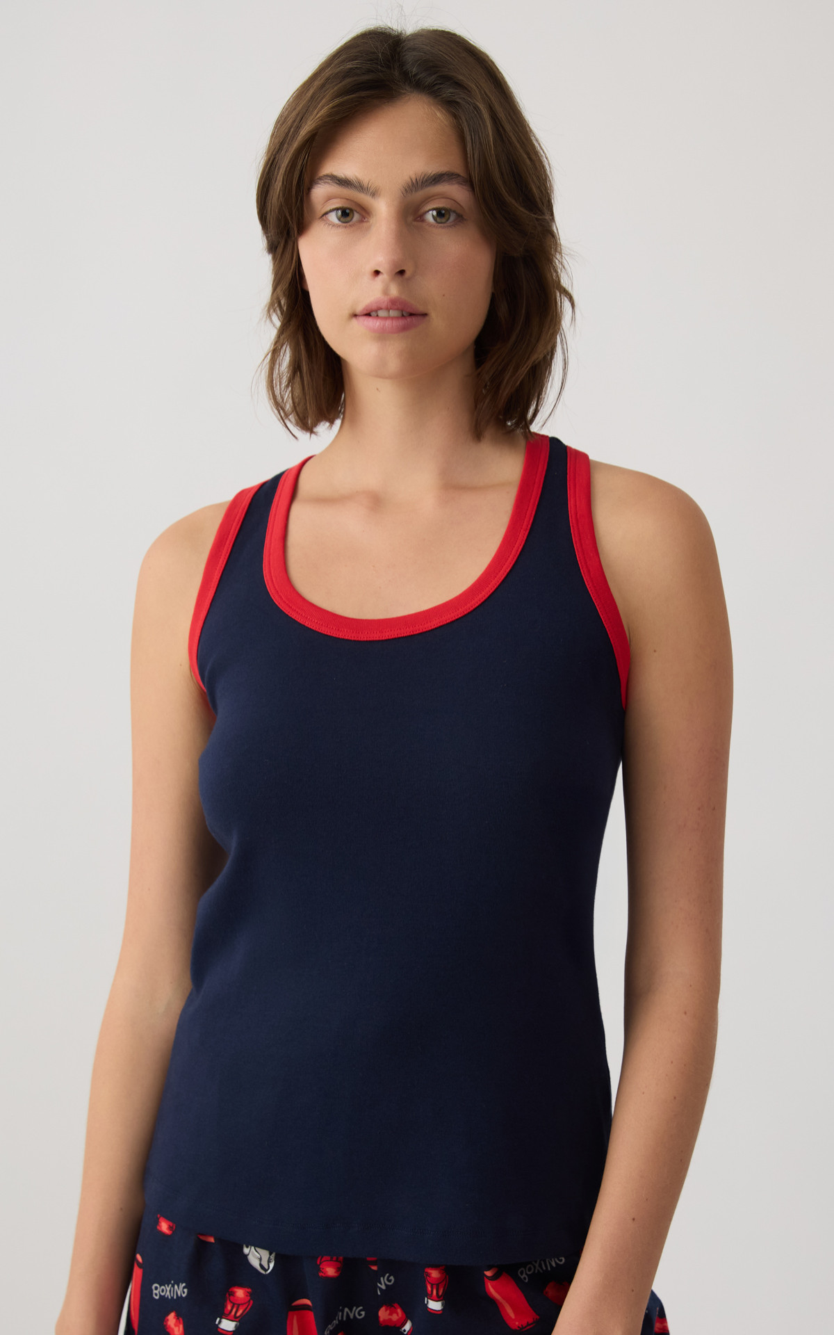 Women's pajamas made from 100% premium-quality cotton for a soft feel and all-day comfort. The set includes a sleeveless athletic-style top and long printed shorts with a wide elastic waistband for a secure and comfortable fit. Ideal for restful sleep and relaxing moments at home.