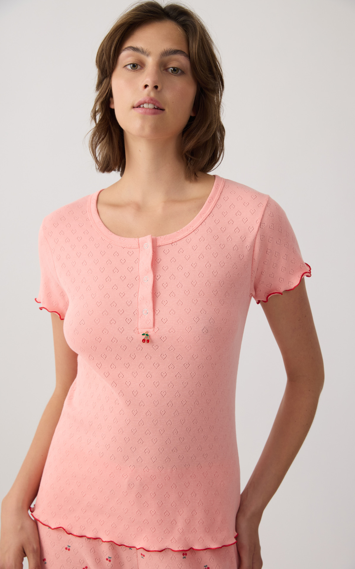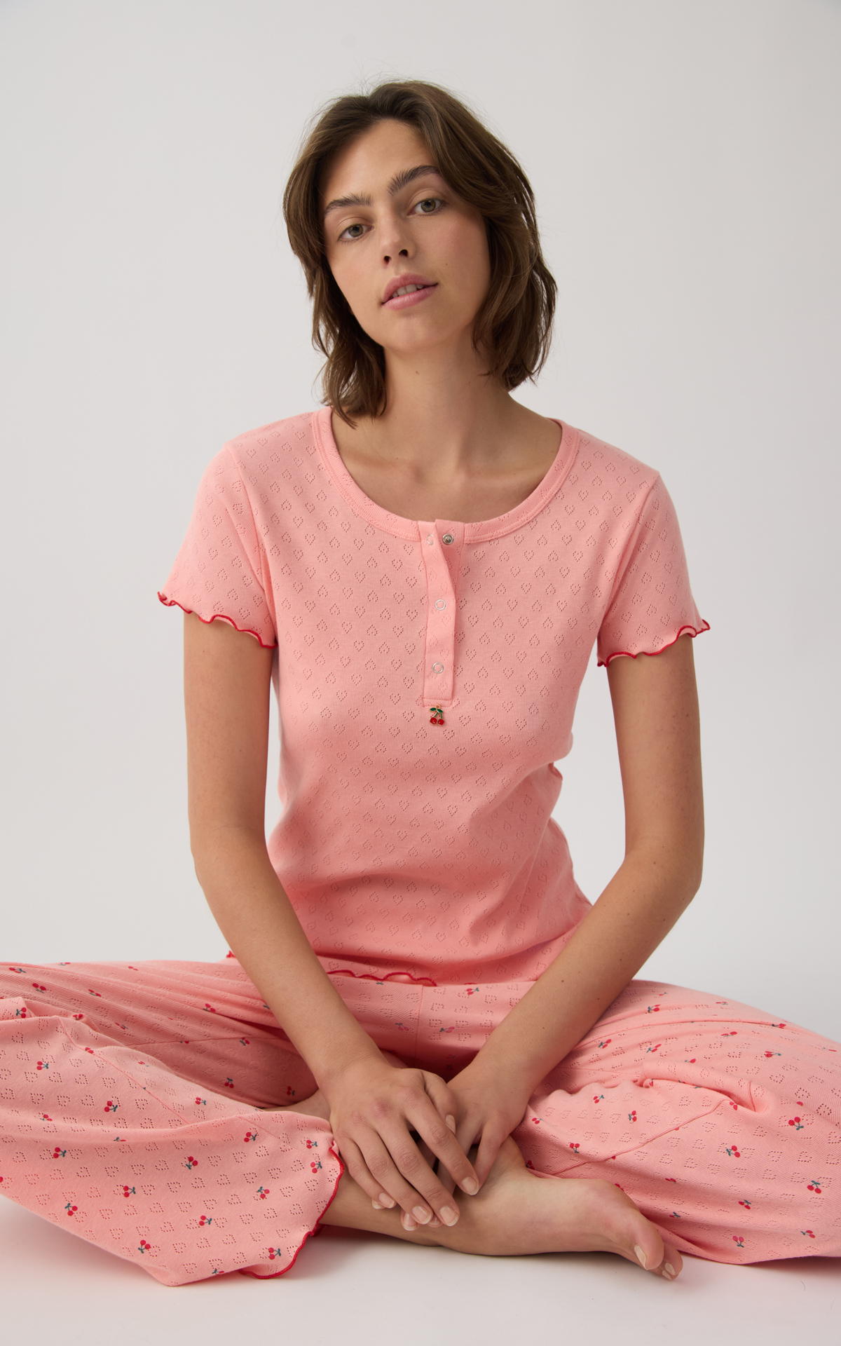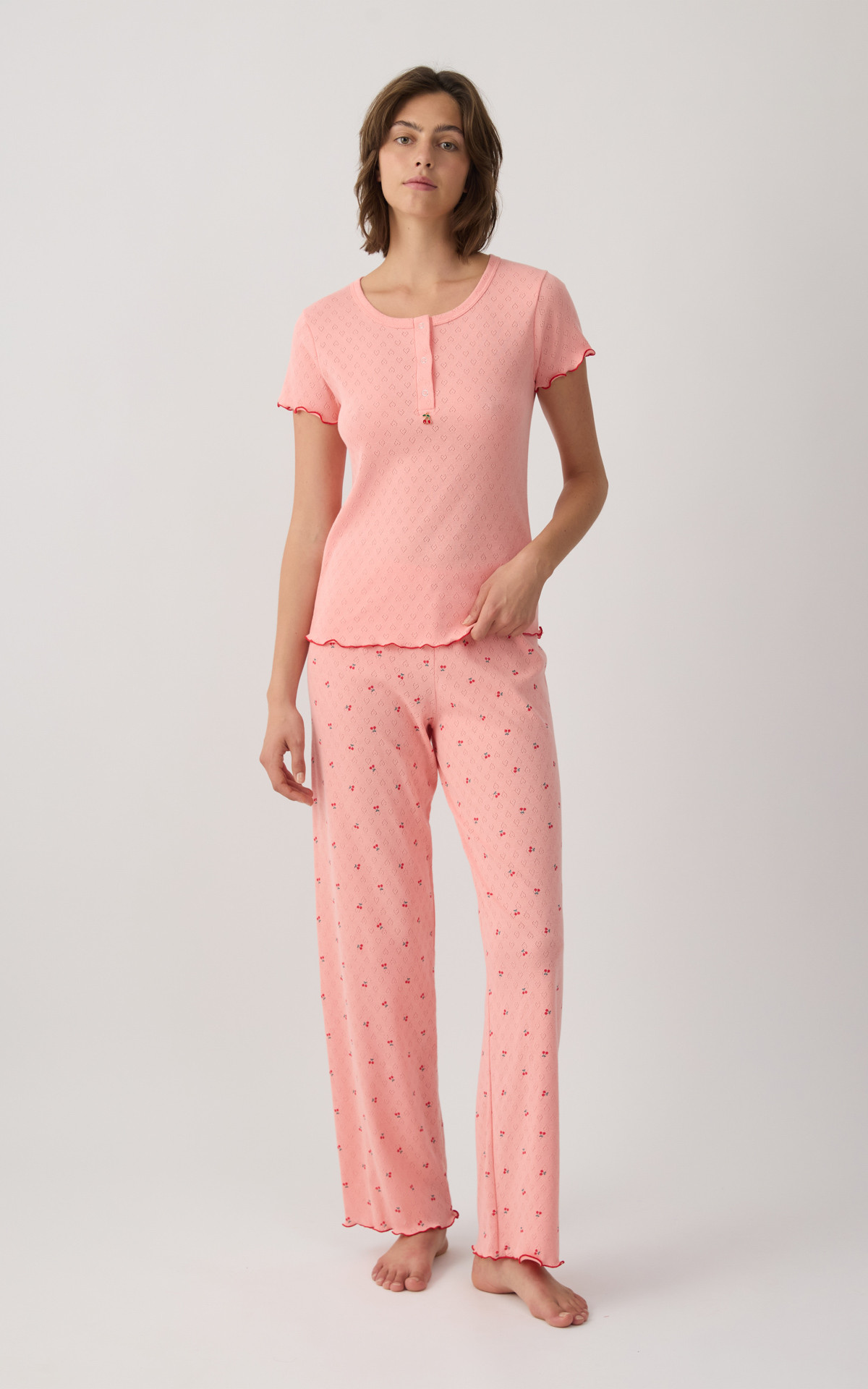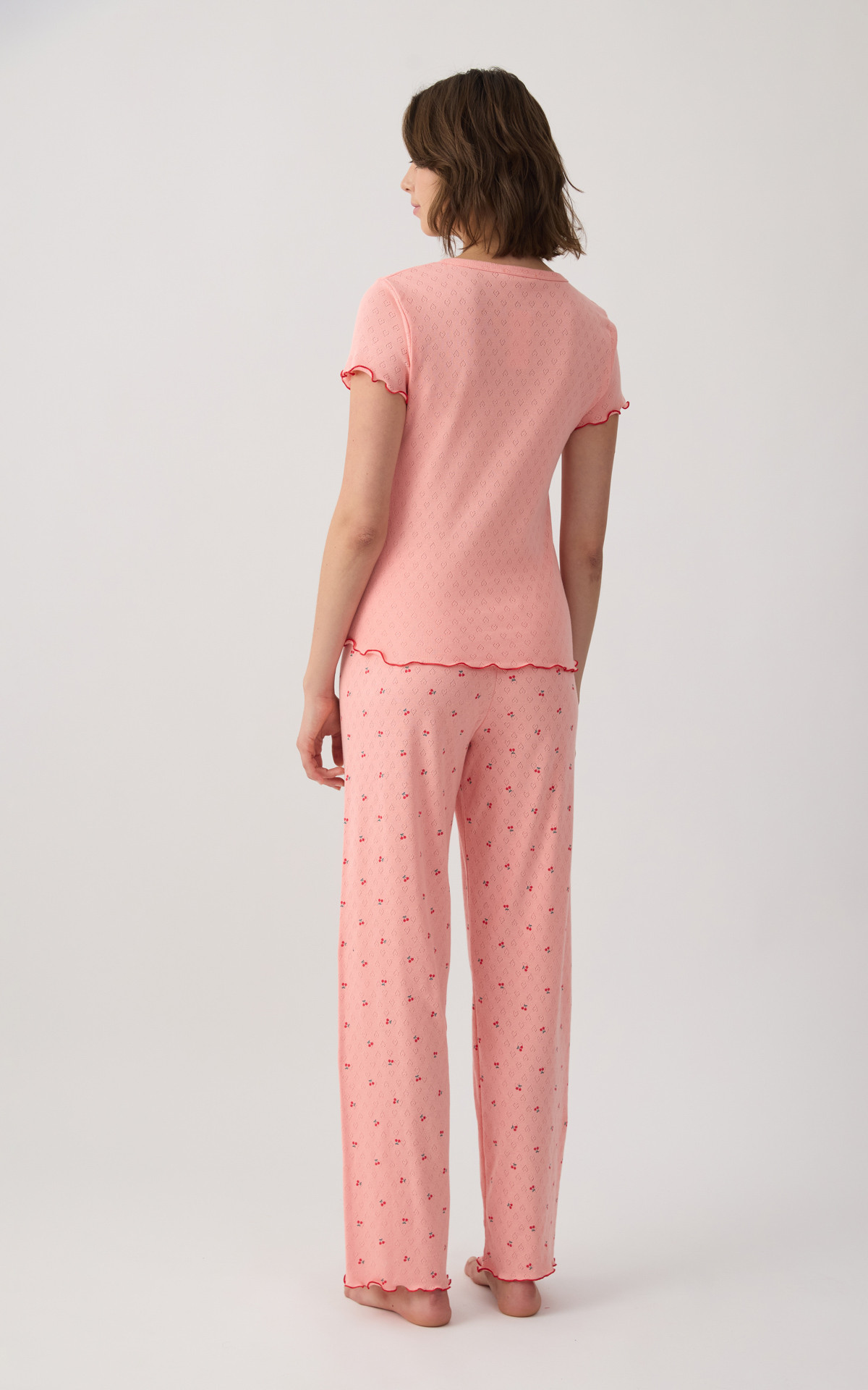 Women's pajama set made from 100% cotton in a delicate pointelle knit. The set includes a short-sleeve top with a round neckline and button placket, paired with long pants, finished with red details.