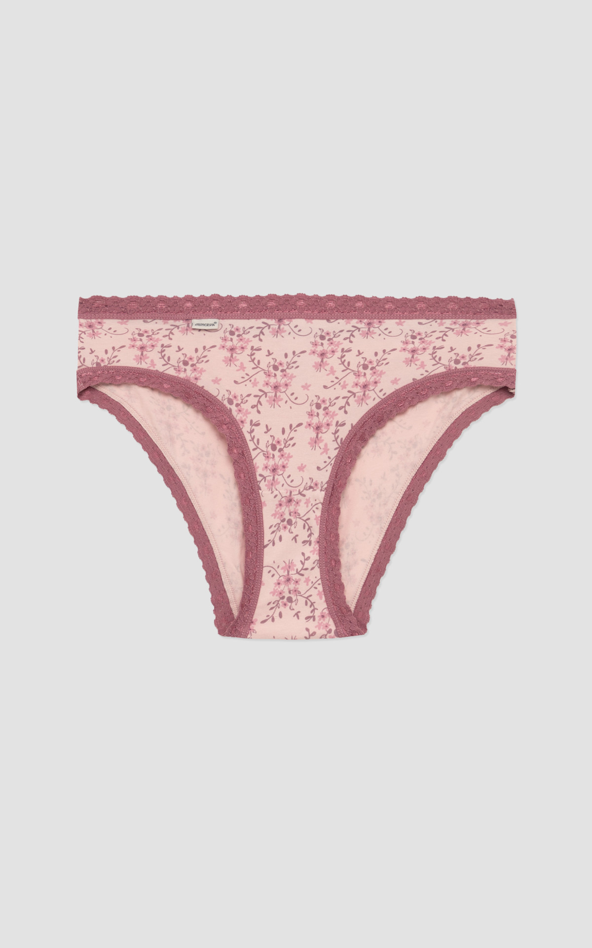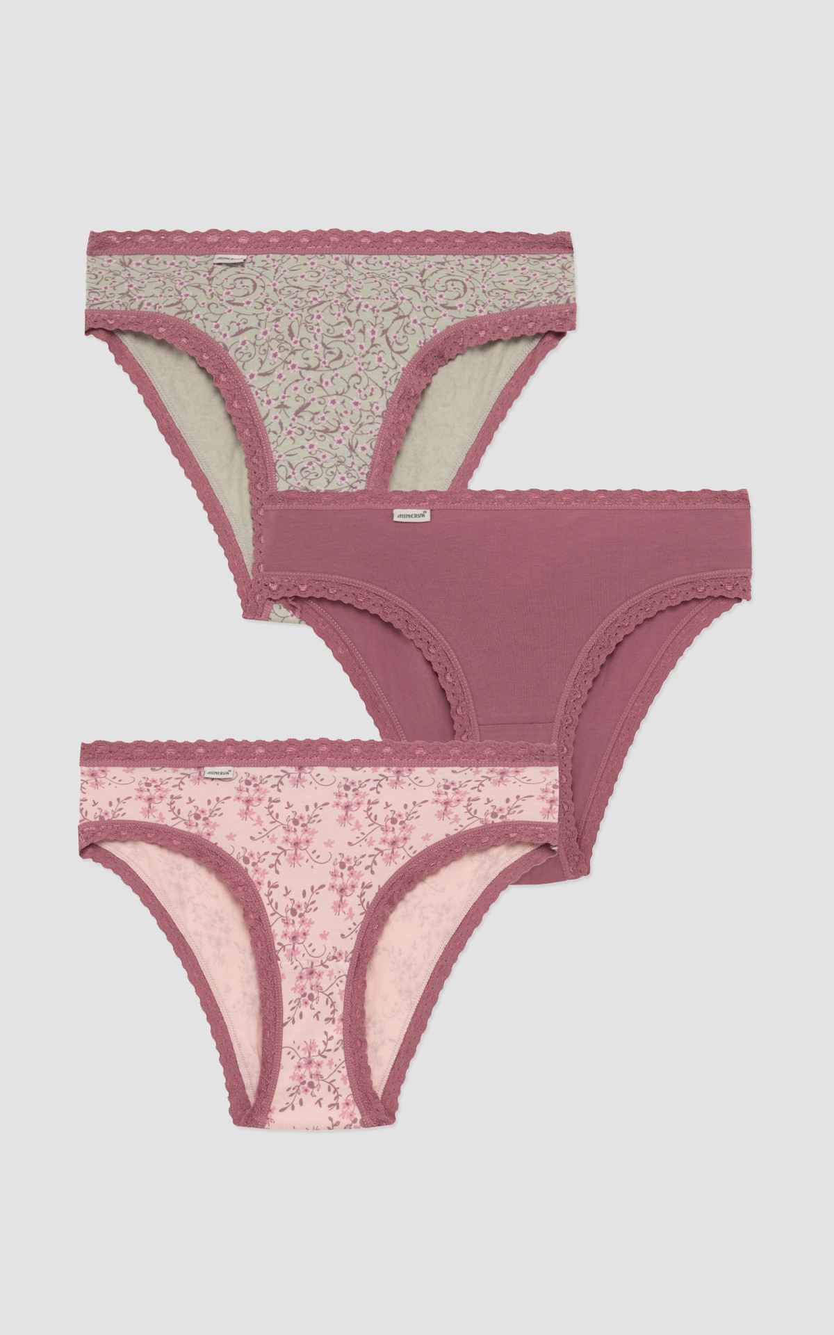 Cotton Touch Lace women's Brazil panties 3-pack, made from 95% high-quality cotton and 5% elastane for lasting comfort and flexibility throughout the day. Featuring delicate lace trim around the edges, they offer an elegant and feminine touch with a soft feel against the skin. The pack includes two printed and one solid design, perfect for everyday comfort with refined style.