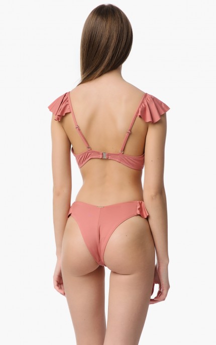 One colour rio brazilian bikini bottom with decorative side ruffles. Combine it with the matching Delphi triangle wired volan, bralette, bandeau, triangle wired or bralette triangle bikini tops for a complete look.