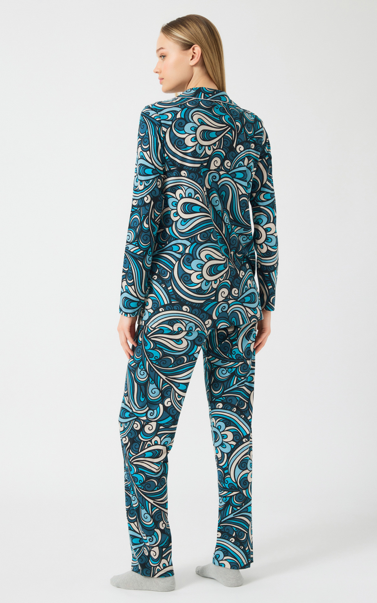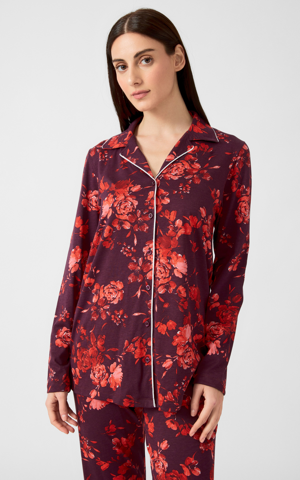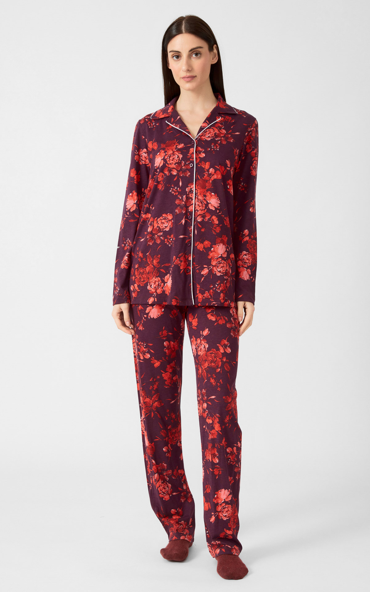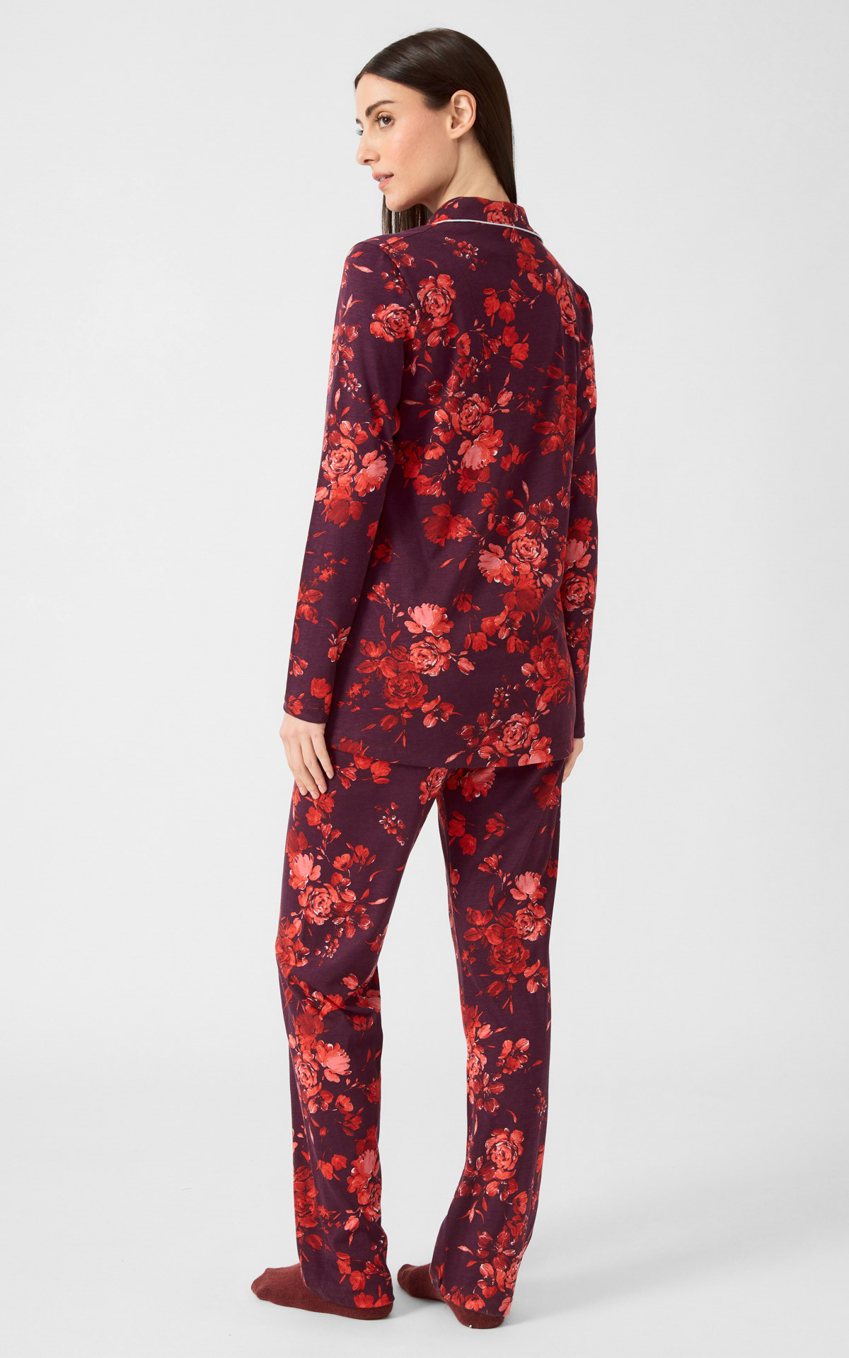 Winter pajama made of 50% TENCEL™ Modal & 50% cotton, high quality, printed all over. The blend of these two natural fibers provides an excellent result, ideal for pajamas and comfortable wear. The set includes a button-up shirt in a straight cut, with a collar and lapel buttons, contrast trim, and long straight pants.