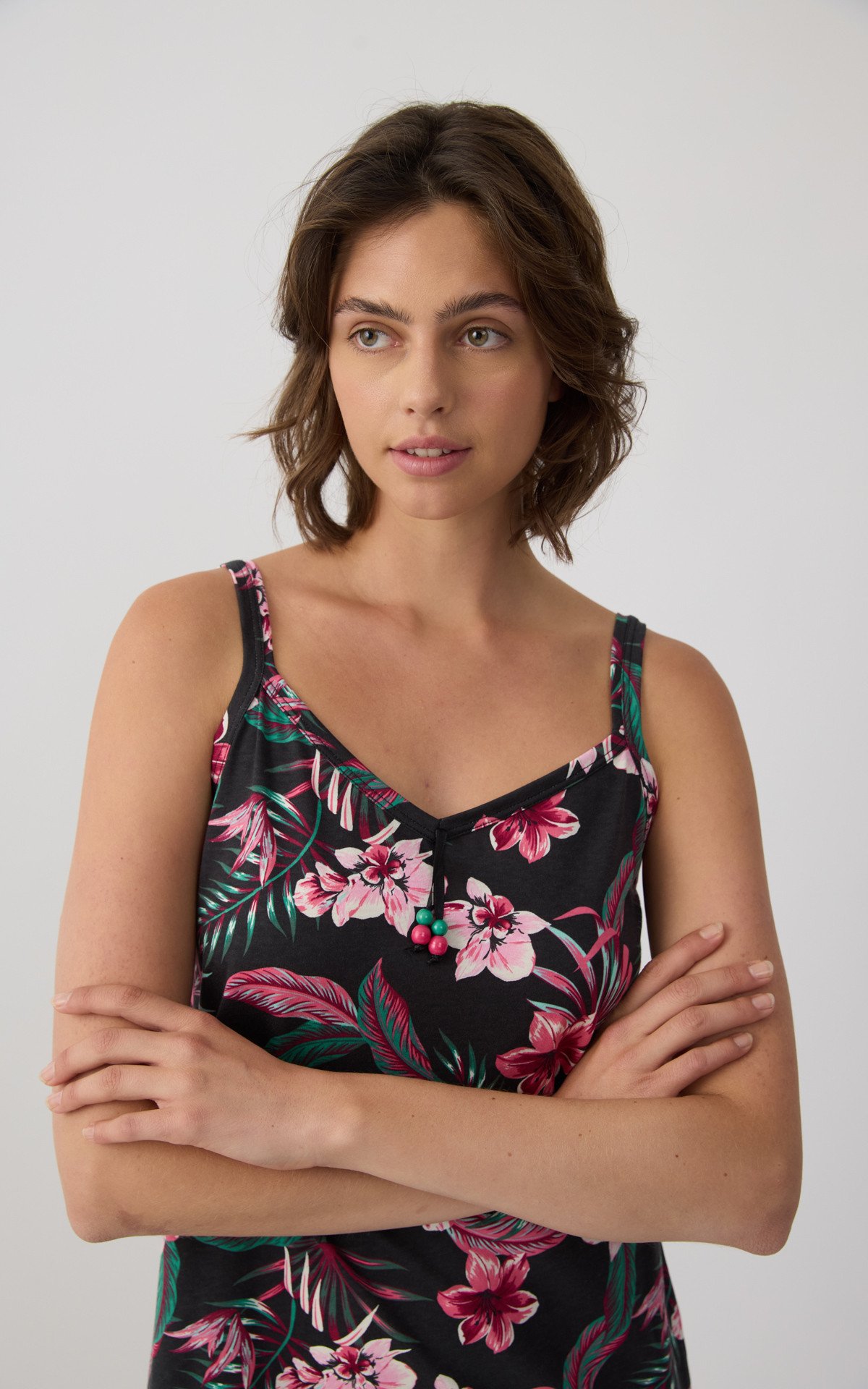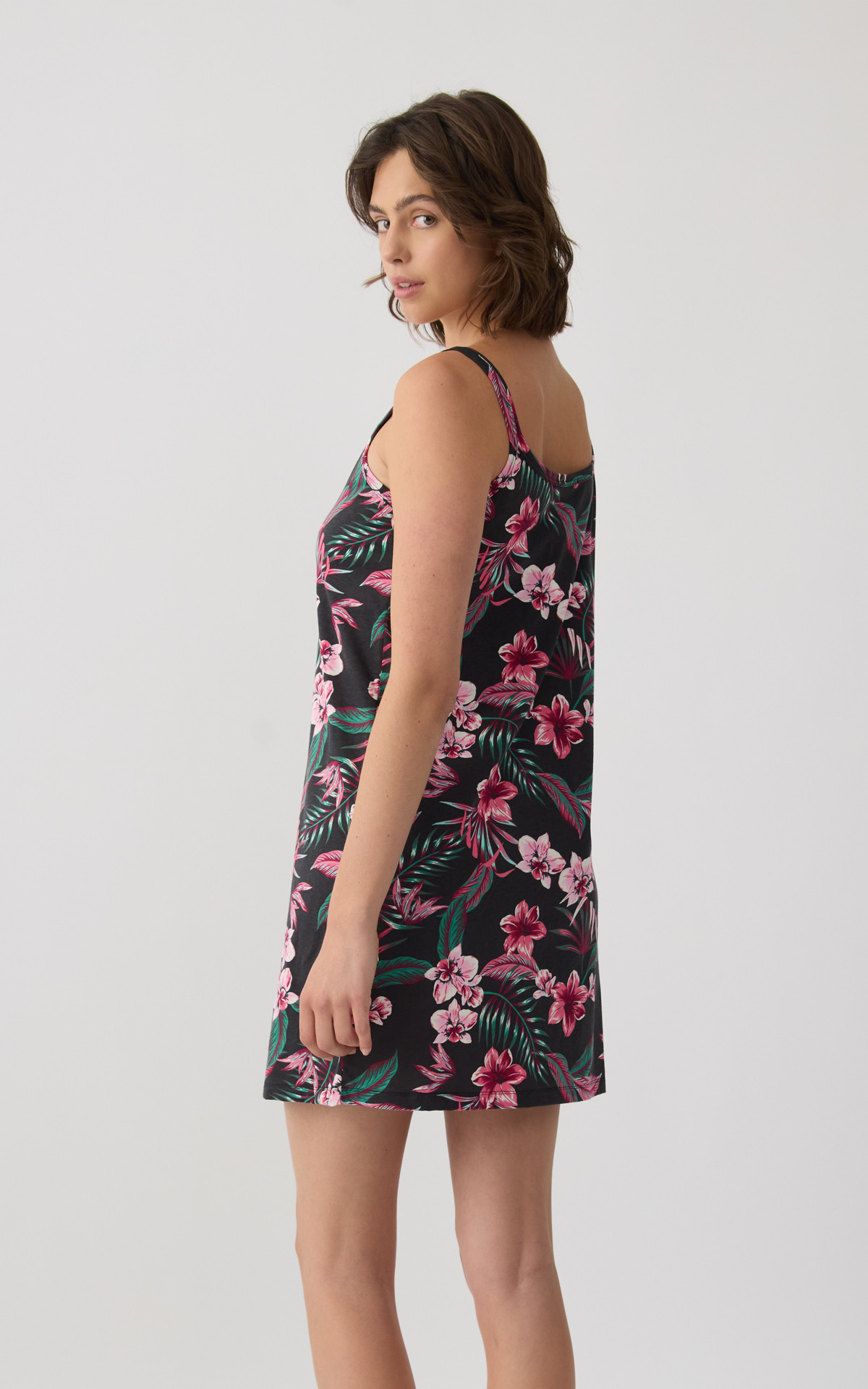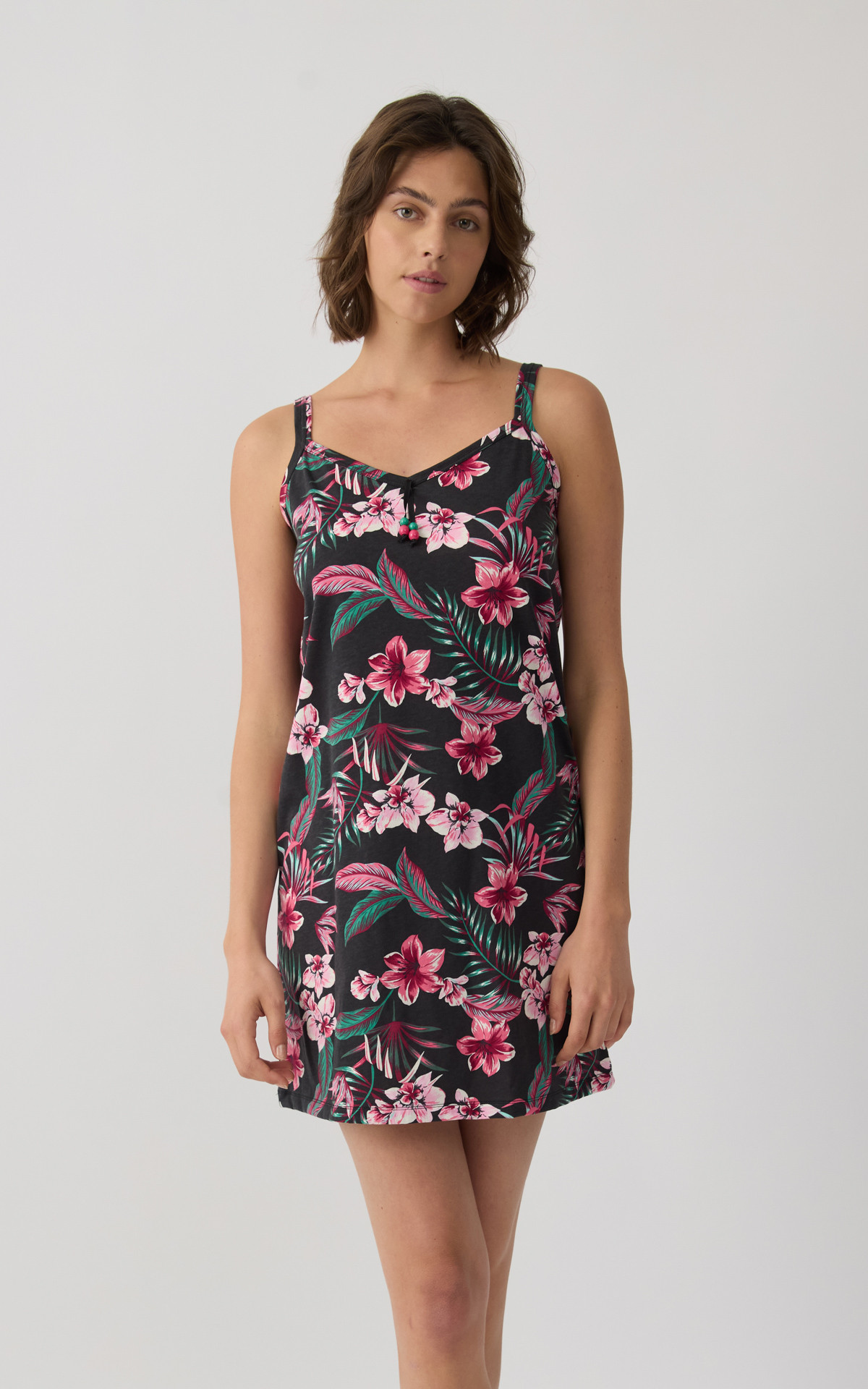 Short nightdress with thin straps and an all-over floral print that adds a feminine and summery touch. Made from 100% premium-quality cotton, it offers a soft feel, breathable comfort, and a lightweight fit throughout the night.
