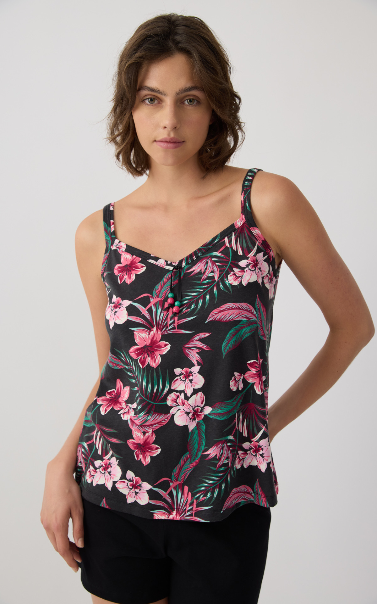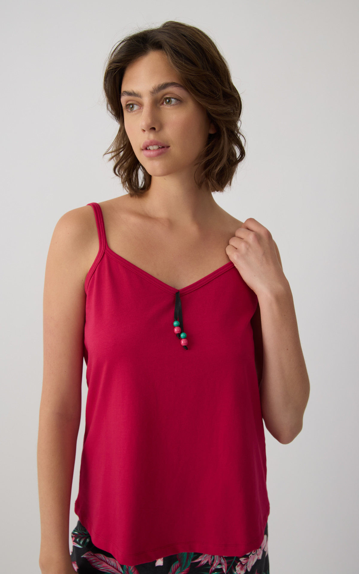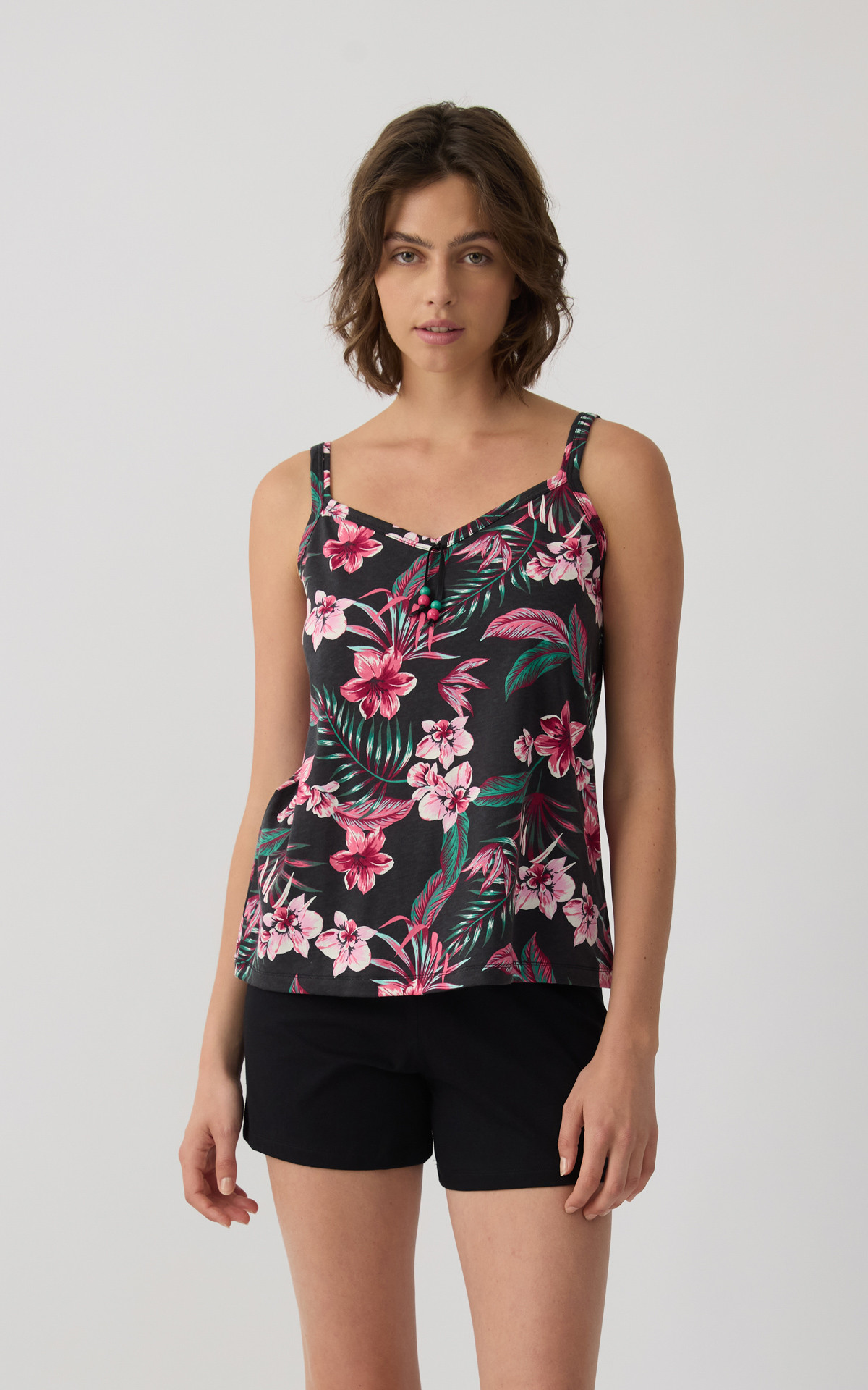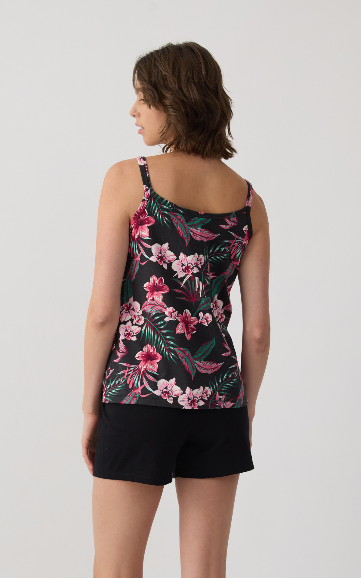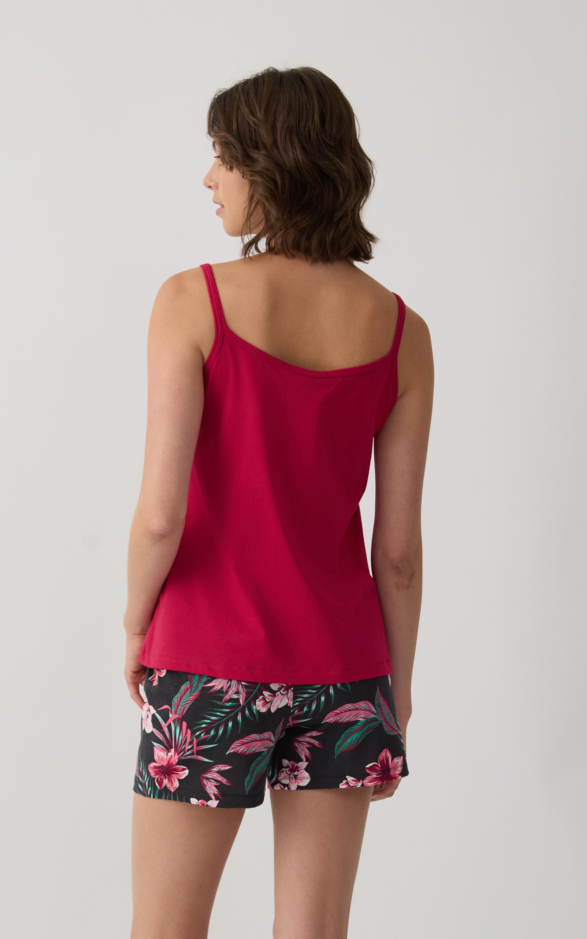 Pyjama set made from 100% premium-quality cotton, offering a soft feel and comfortable wear during sleep. The set includes a solid-colored camisole-style top with thin straps, paired with printed short shorts featuring an elastic waistband for a comfortable and secure fit. An ideal choice for cool and relaxed summer nights.