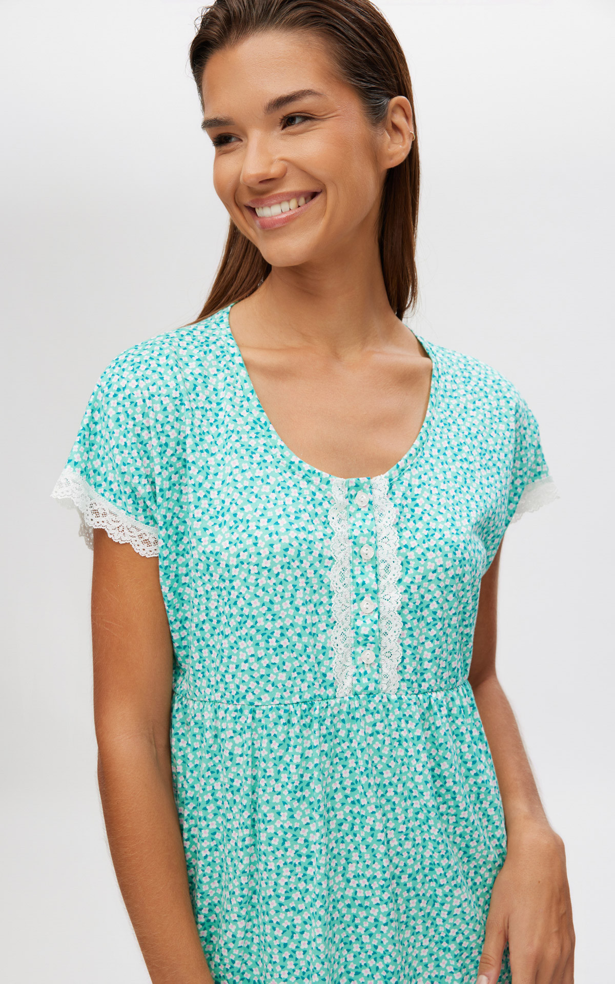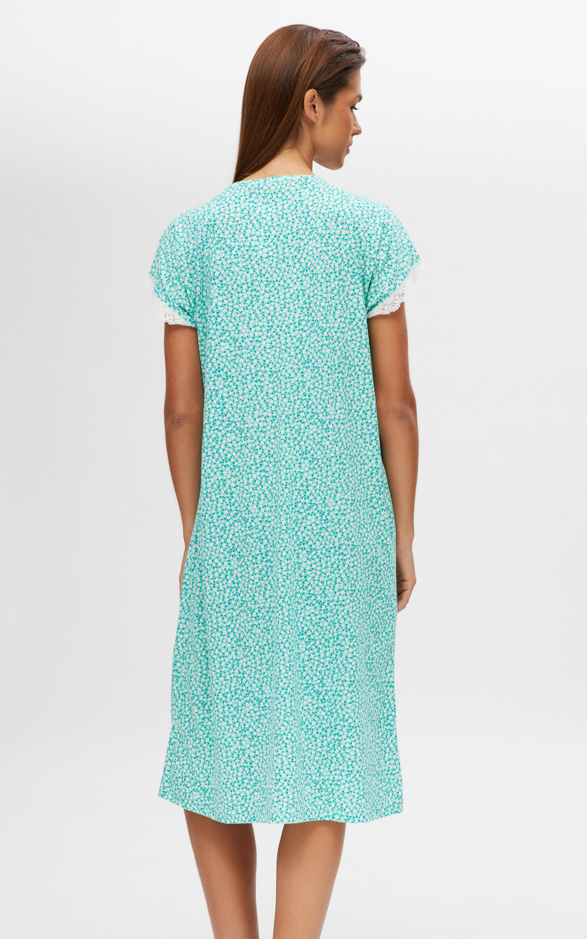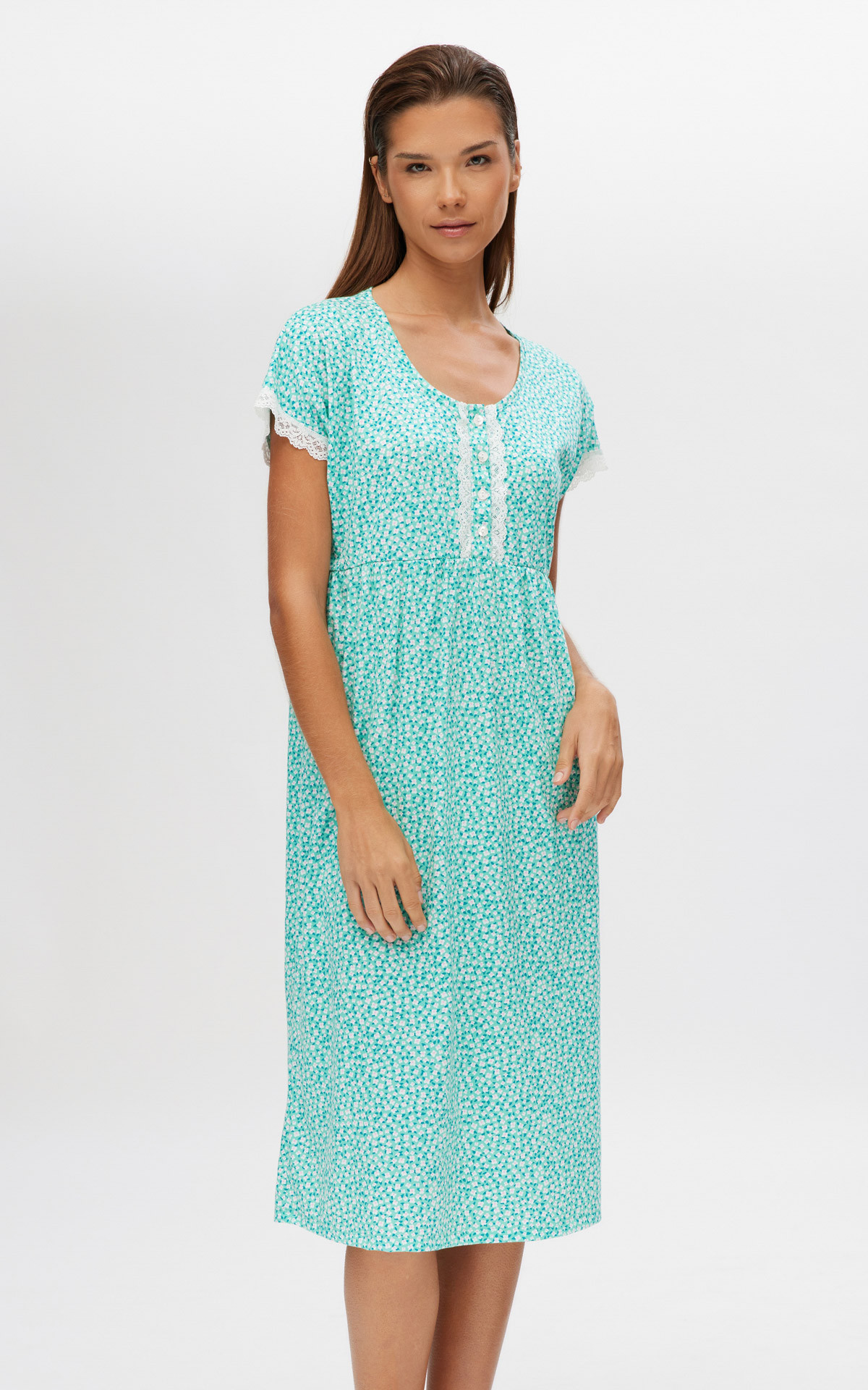 Long nightdress below the knee, made of 100% cotton of exceptional quality. In floral print, with a placket and lace around the zappone sleeves.