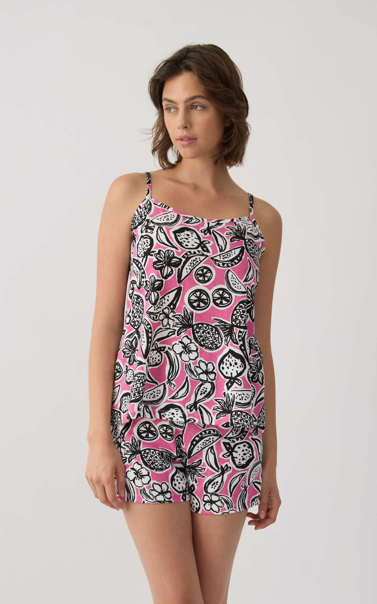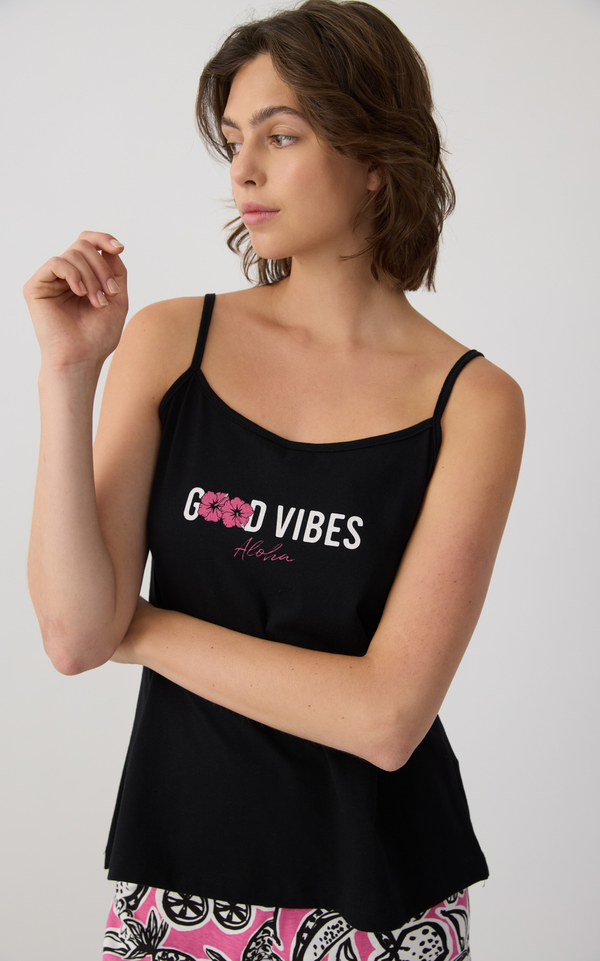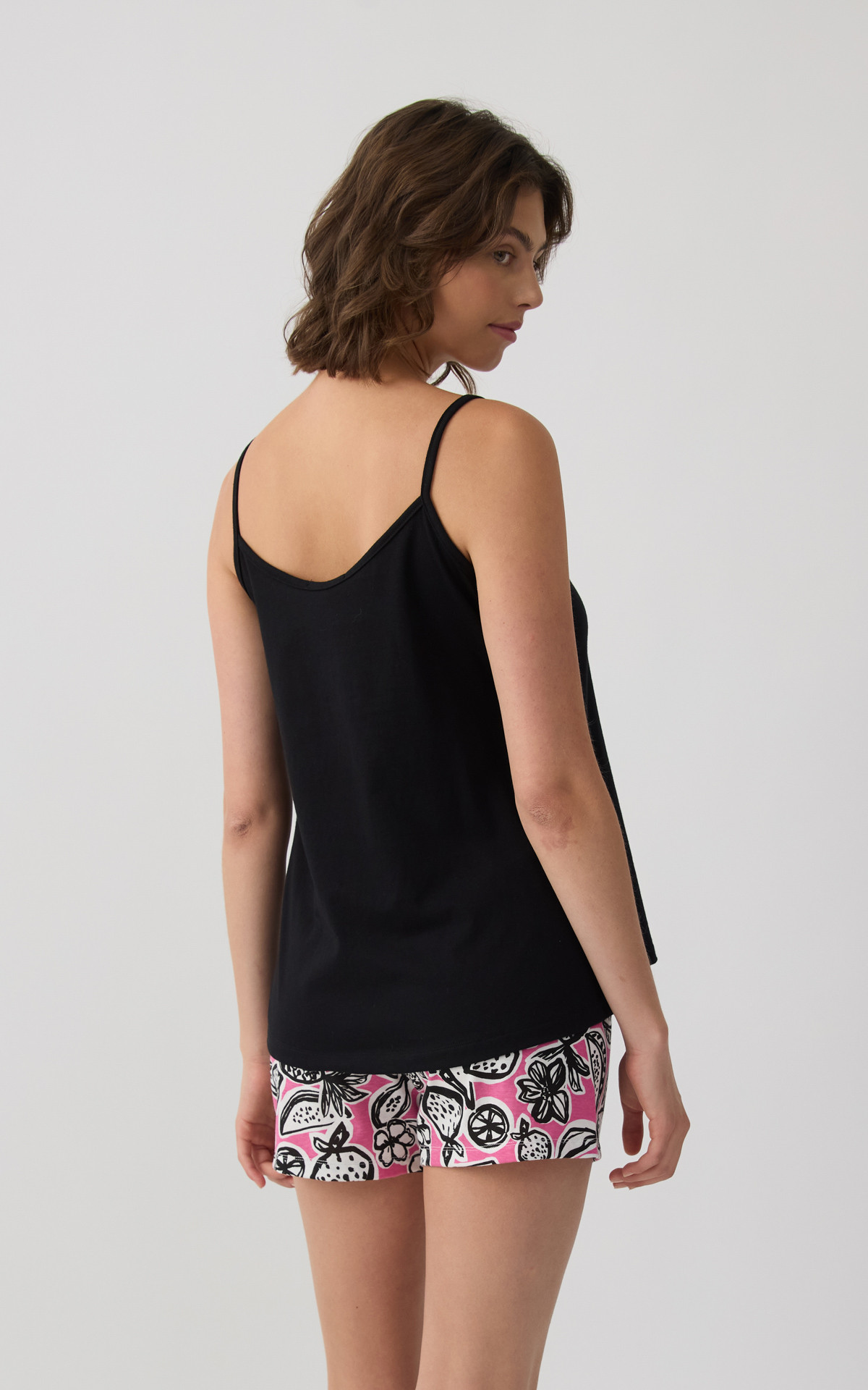 Pyjama set made from 100% premium-quality cotton, offering a soft feel and comfortable wear during sleep. The set consists of top with thin straps and a decorative chest print, paired with printed short shorts featuring an elastic waistband for a secure and comfortable fit. An ideal choice for cool and comfortable summer nights.
