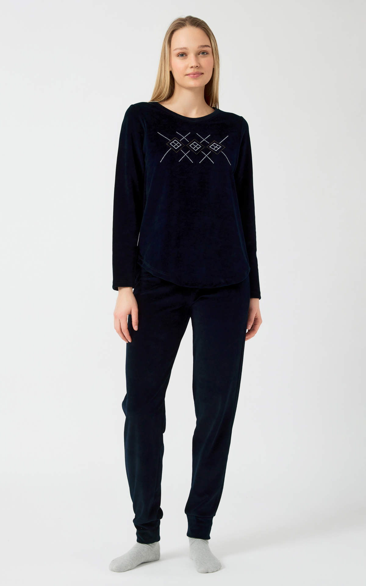 Winter velvety pajamas made of 80% cotton and 20% polyester, high-quality fabric. The set includes a sweatshirt with a print on the chest and solid color pants with ribbing at the cuffs.
