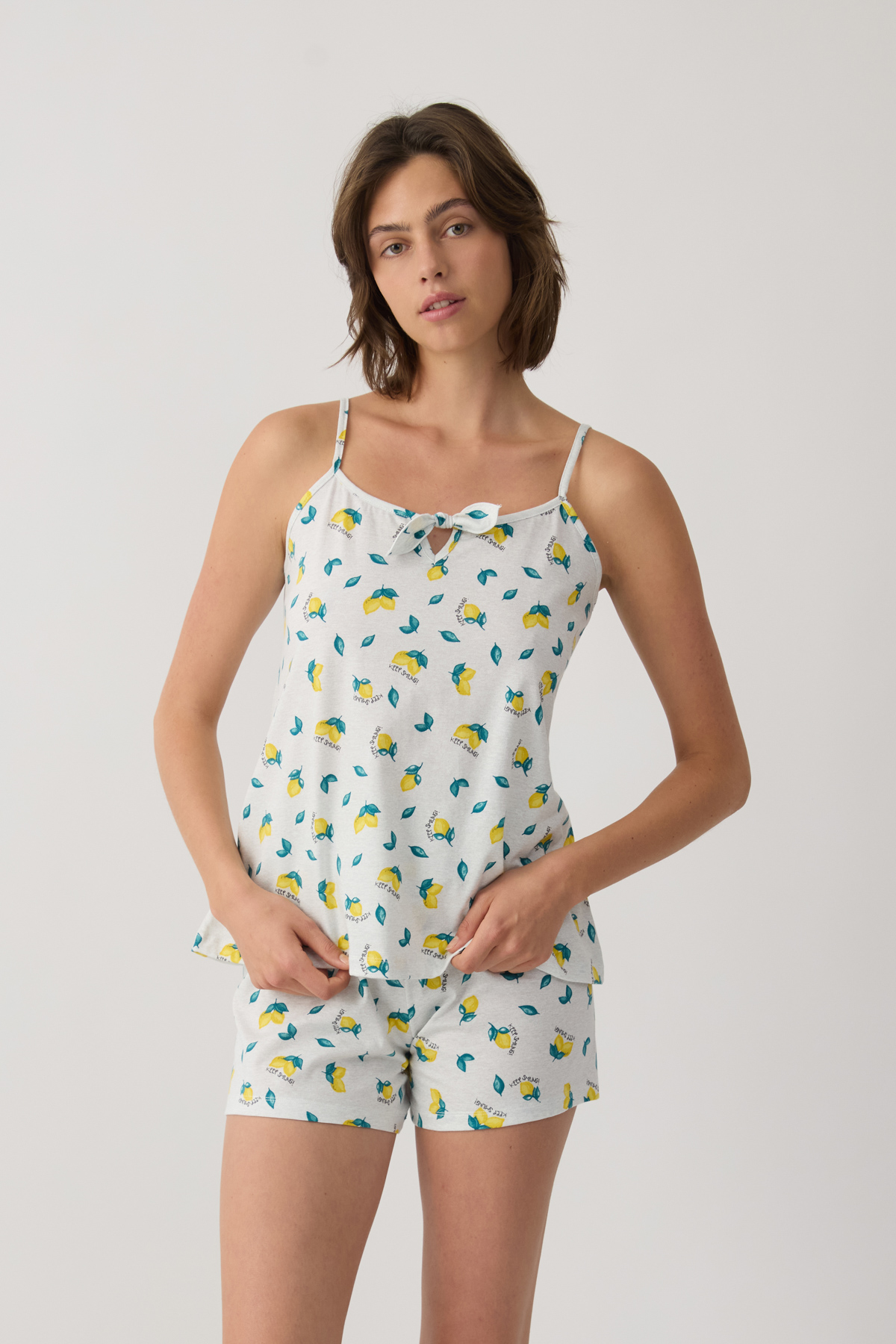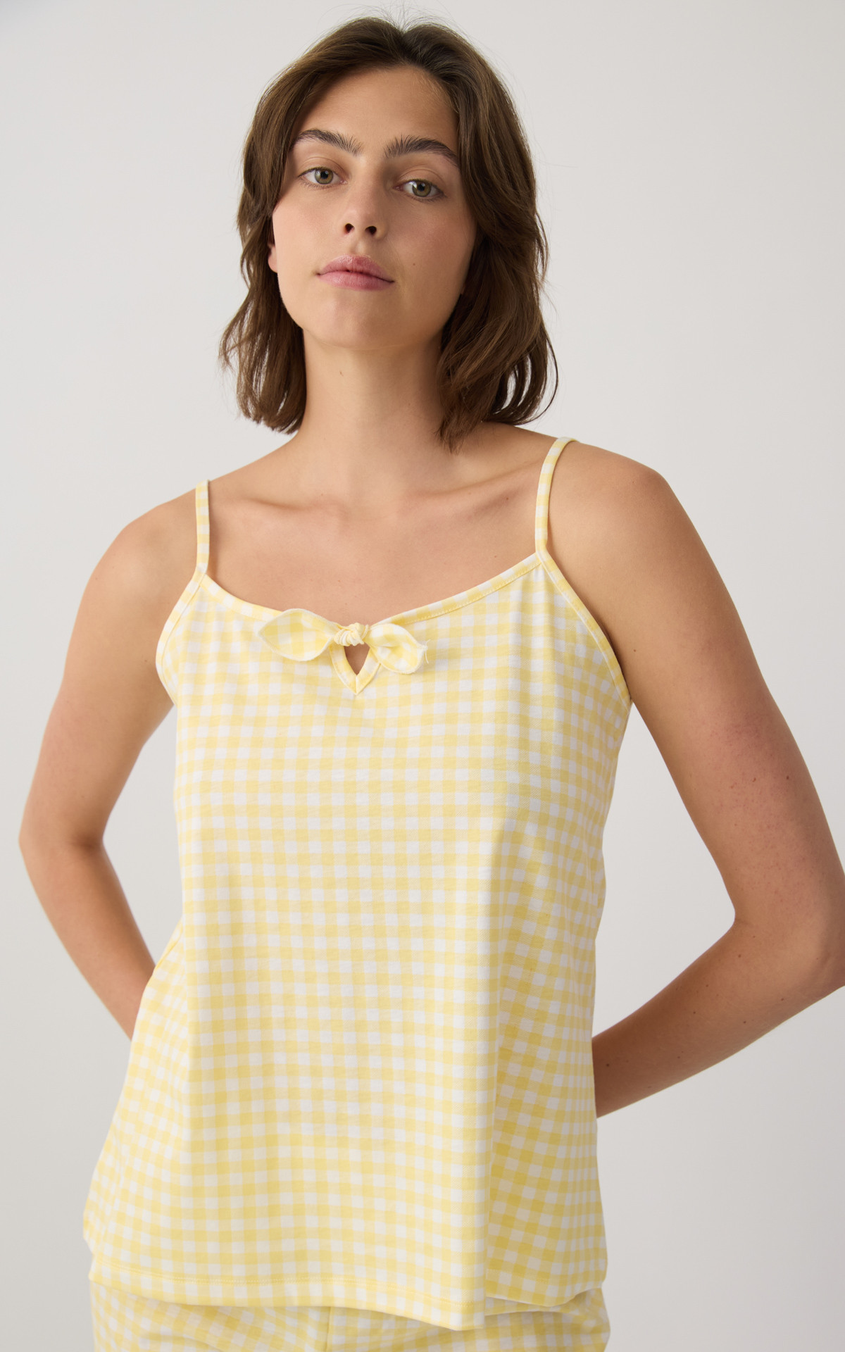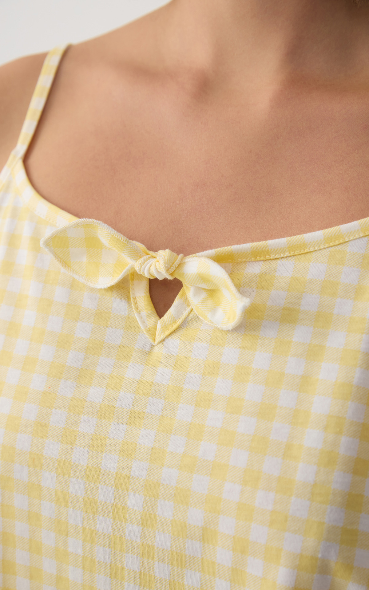 Women's pajama set made from 100% premium-quality cotton with a soft checkered pattern, available in two color combinations. The set includes a camisole-style top with thin straps and a decorative bow at the neckline, paired with short shorts featuring an elastic waistband for a comfortable fit.