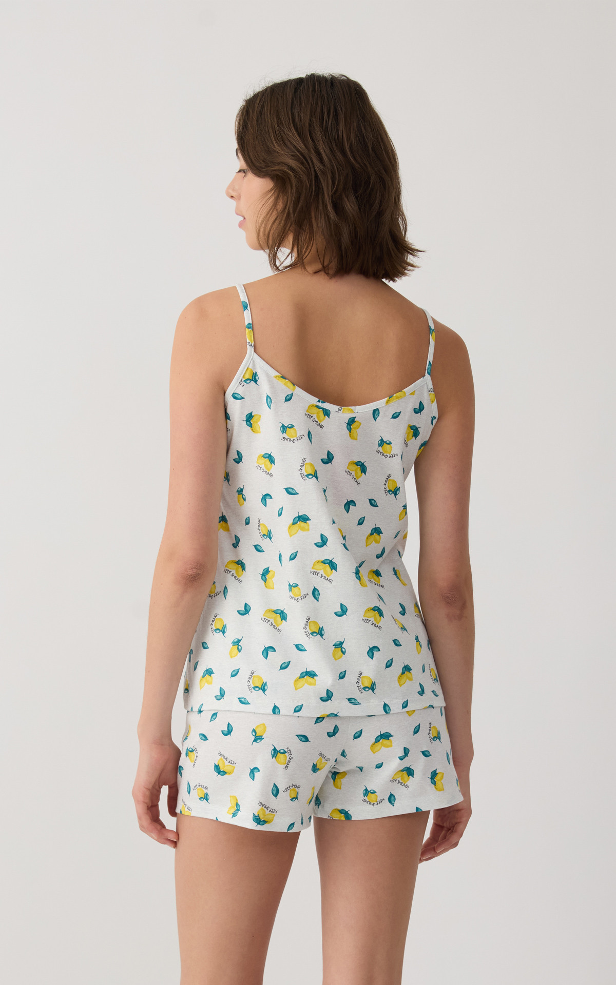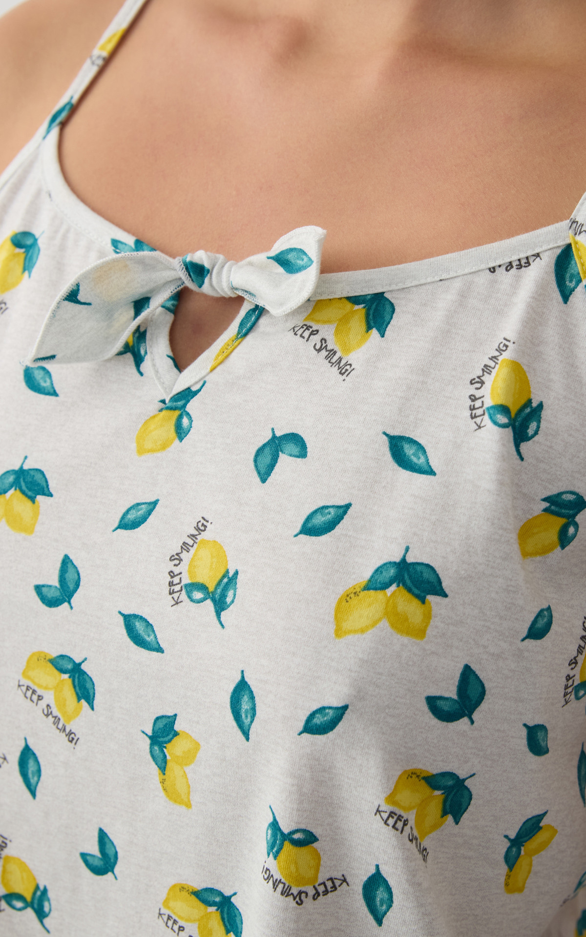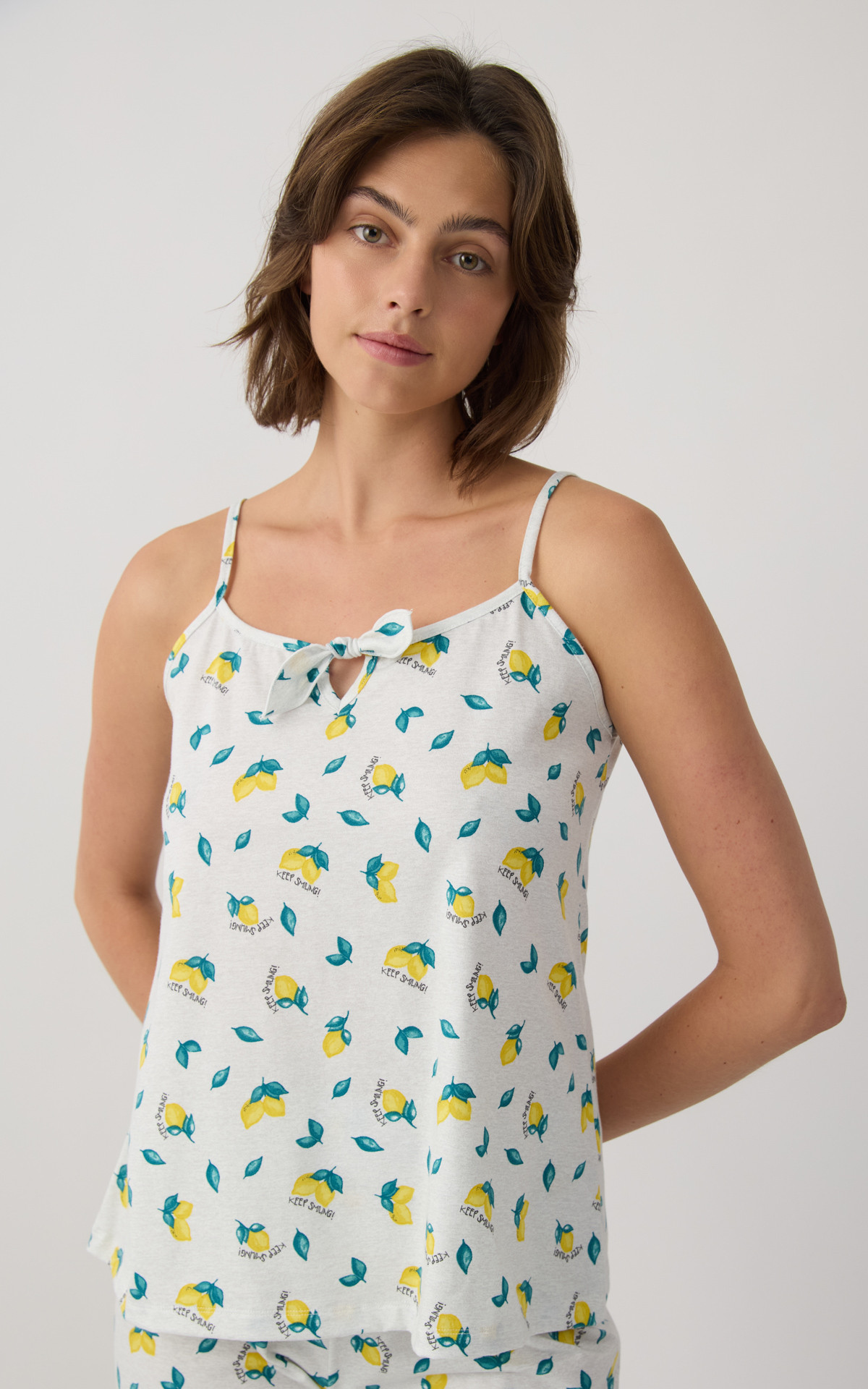 Women's pajama set made from 100% premium-quality cotton with a soft checkered pattern, available in two color combinations. The set includes a camisole-style top with thin straps and a decorative bow at the neckline, paired with short shorts featuring an elastic waistband for a comfortable fit.