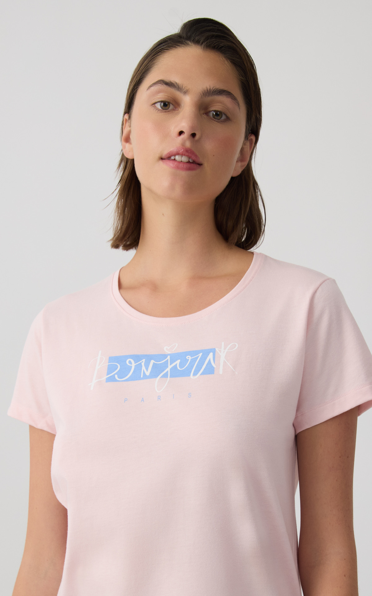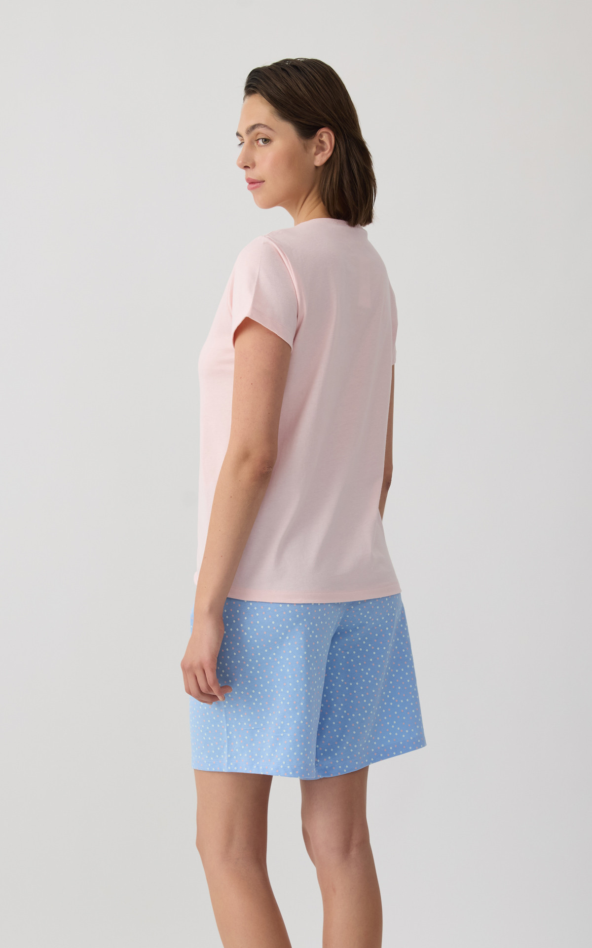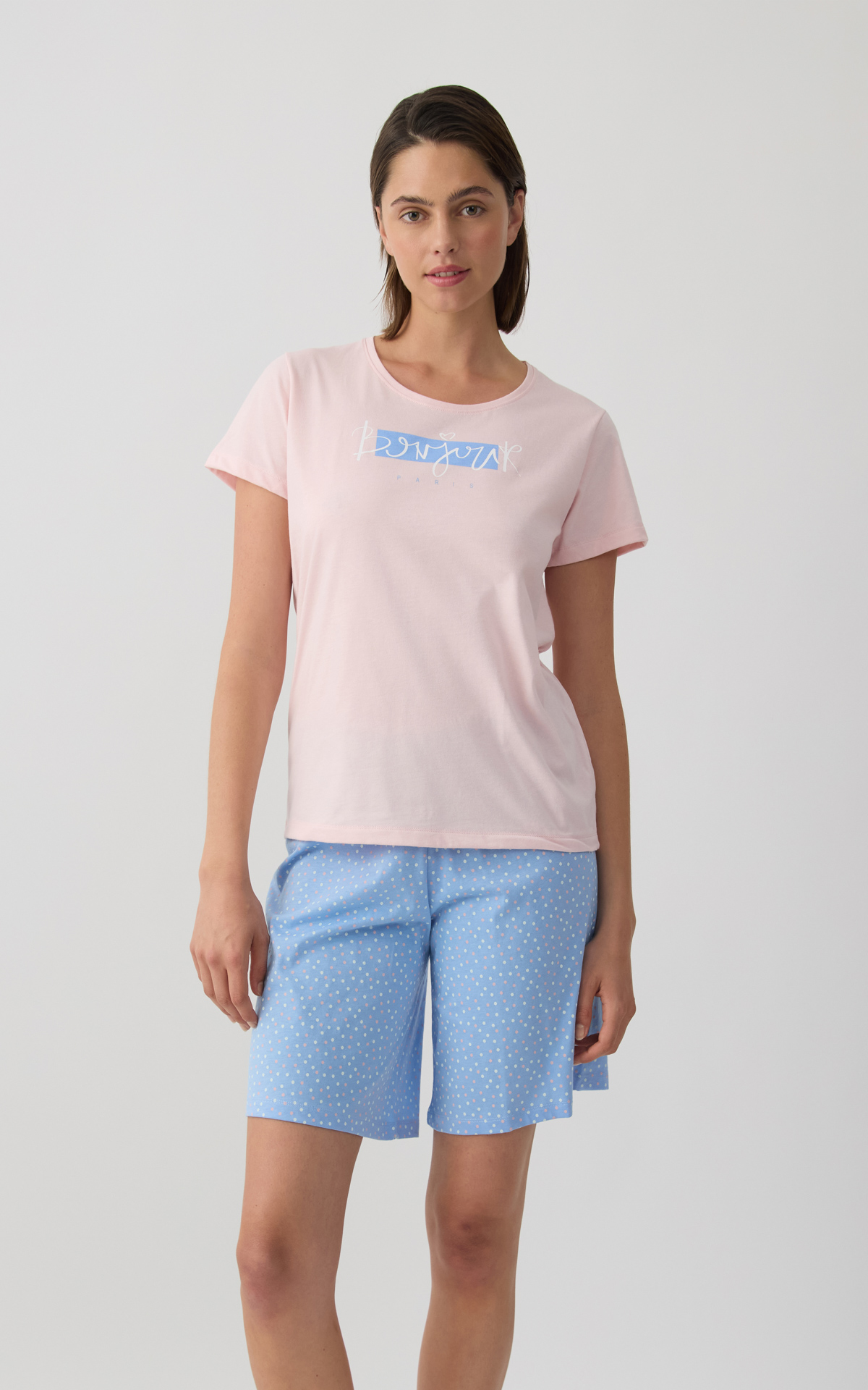 Women's pajama set made from 100% premium-quality cotton fabric, offering softness and comfort throughout the night. The set includes a short-sleeve top with a subtle front print and long printed shorts with an elastic waistband for a comfortable and secure fit.