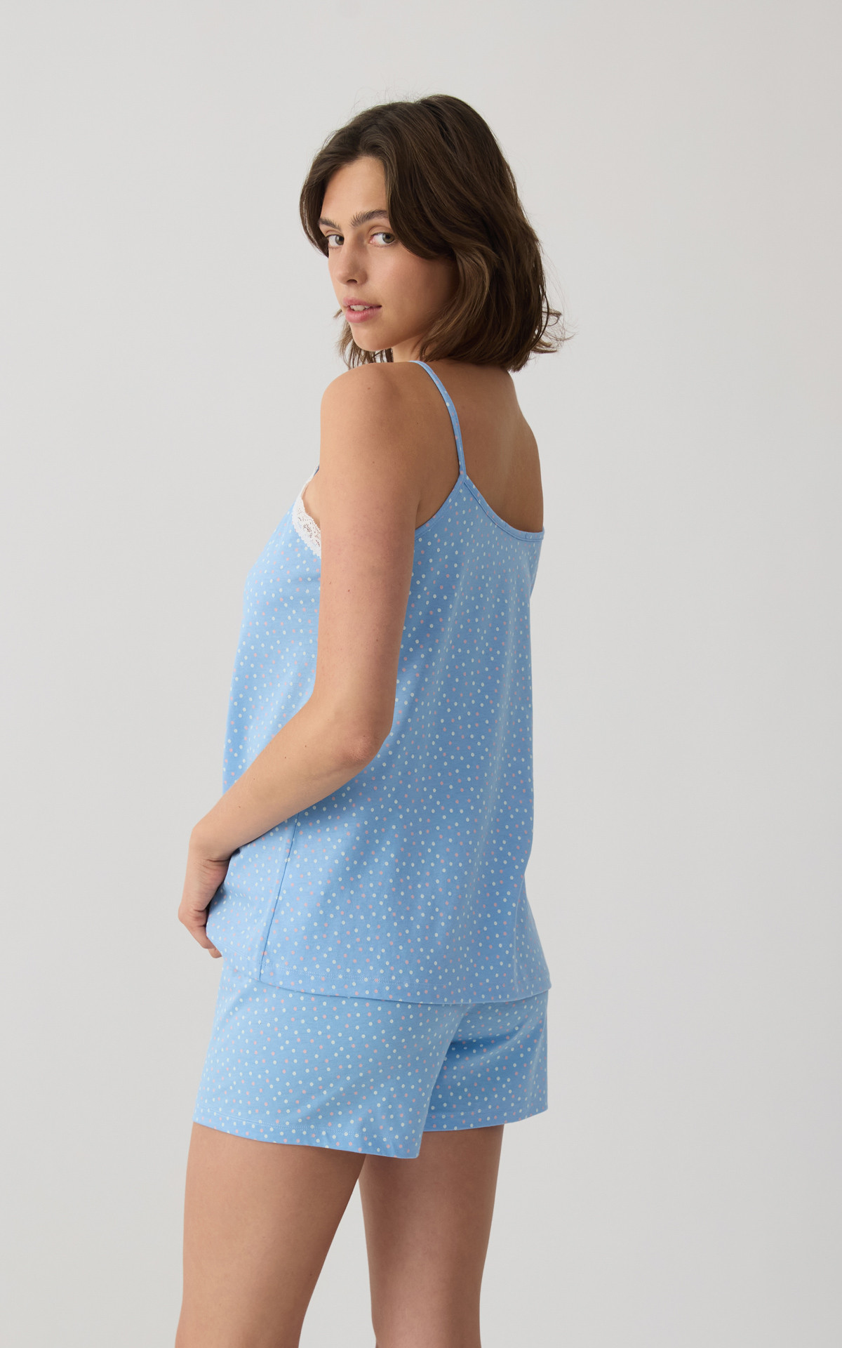 Women's pajama set made from 100% premium-quality cotton with a subtle all-over print. The set includes a camisole-style top with thin straps and delicate lace detail at the neckline, paired with short shorts featuring an elastic waistband for a comfortable and secure fit.