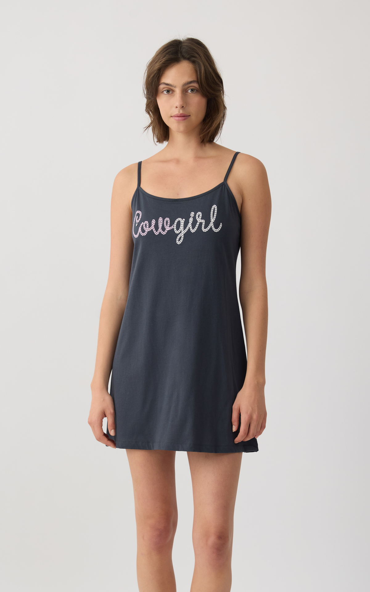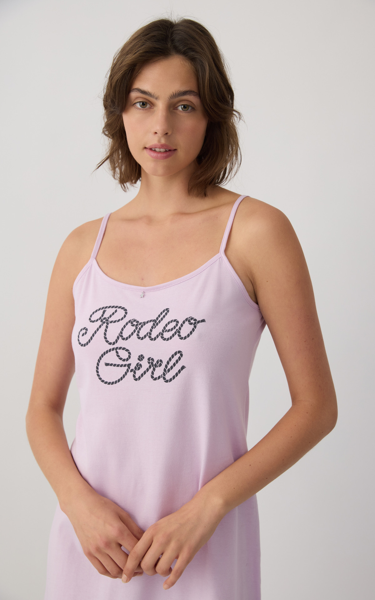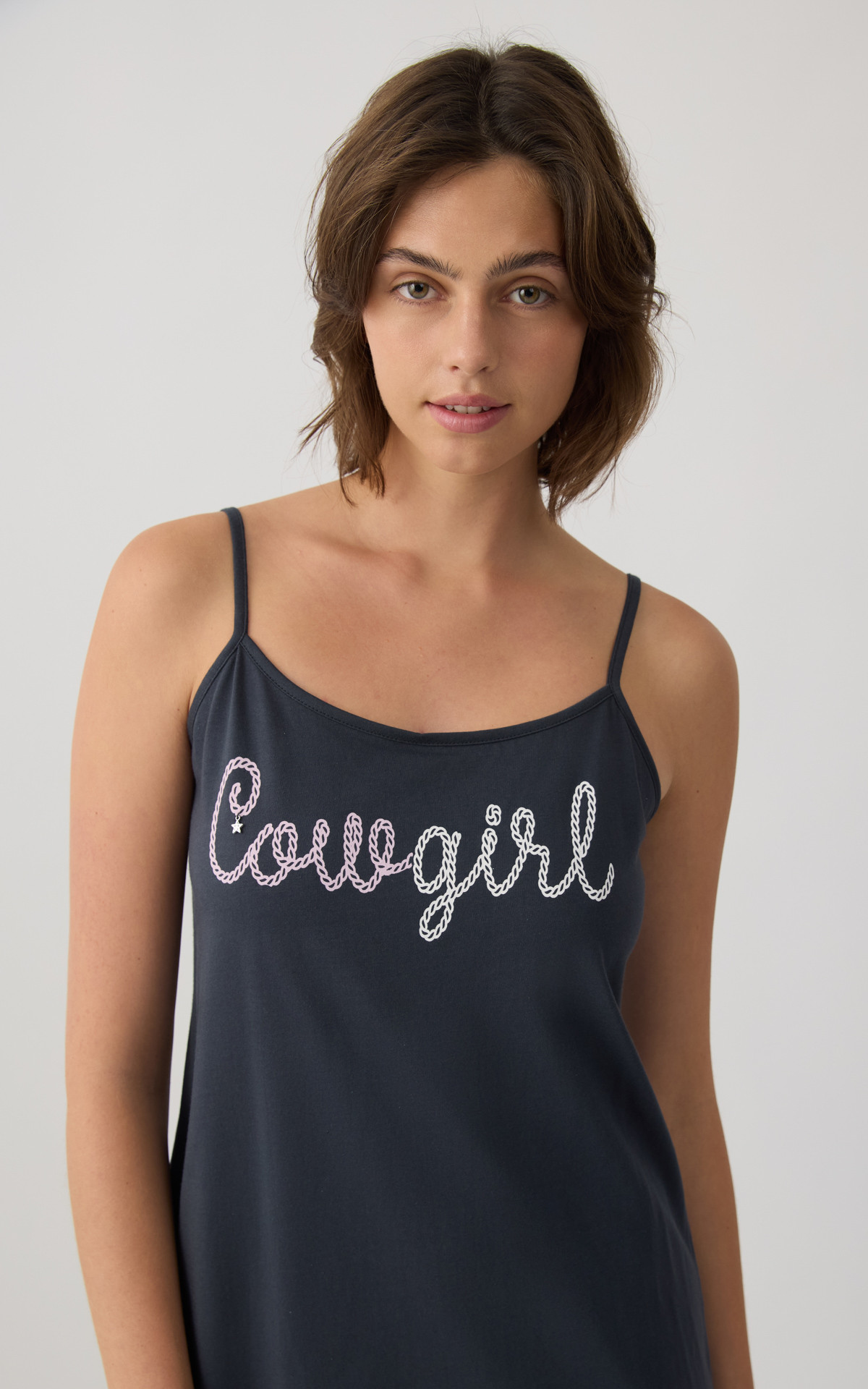 Short nightdress with thin straps and a modern front print that adds a youthful and feminine touch. Made from 100% premium-quality cotton fabric, it offers a soft feel and breathable comfort throughout the night.