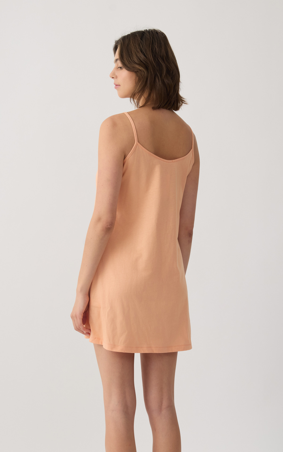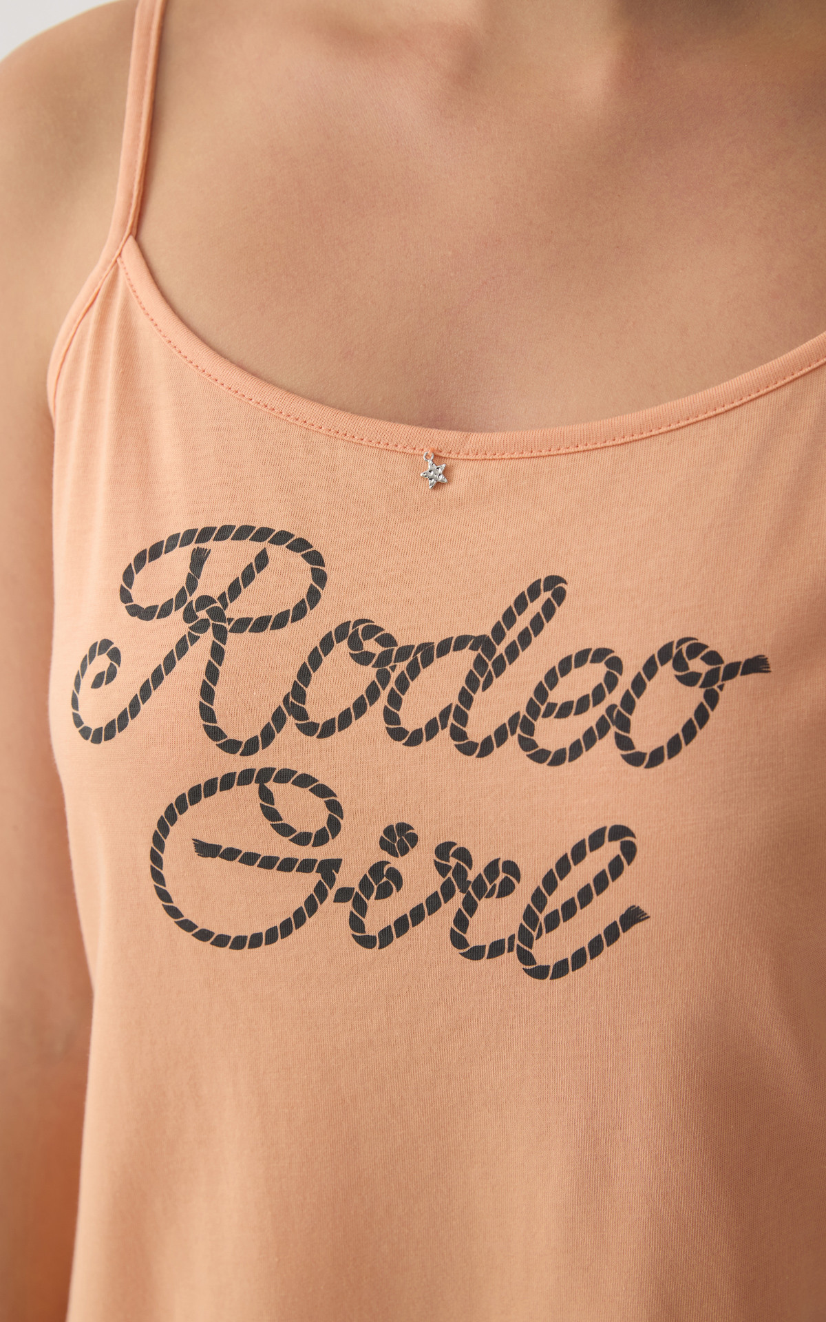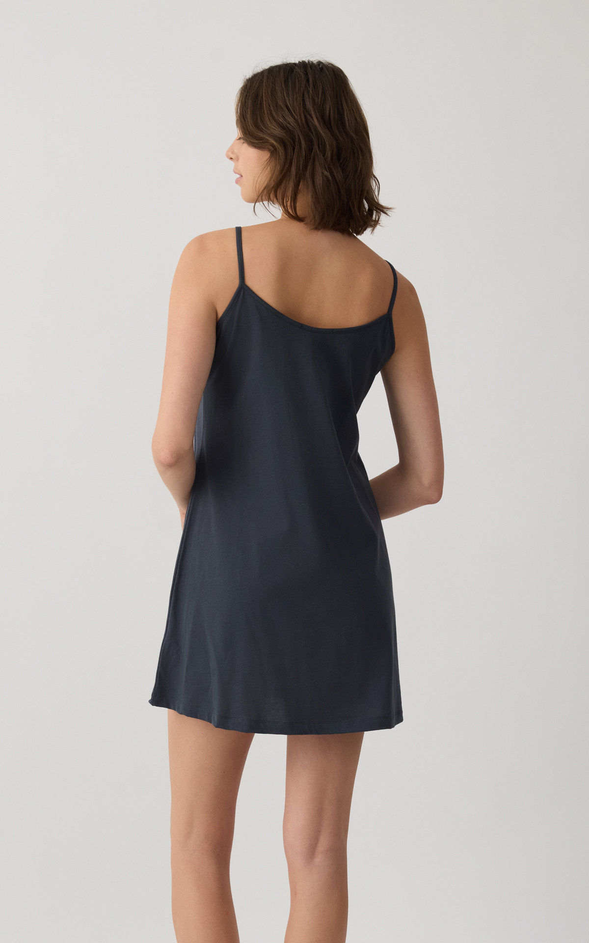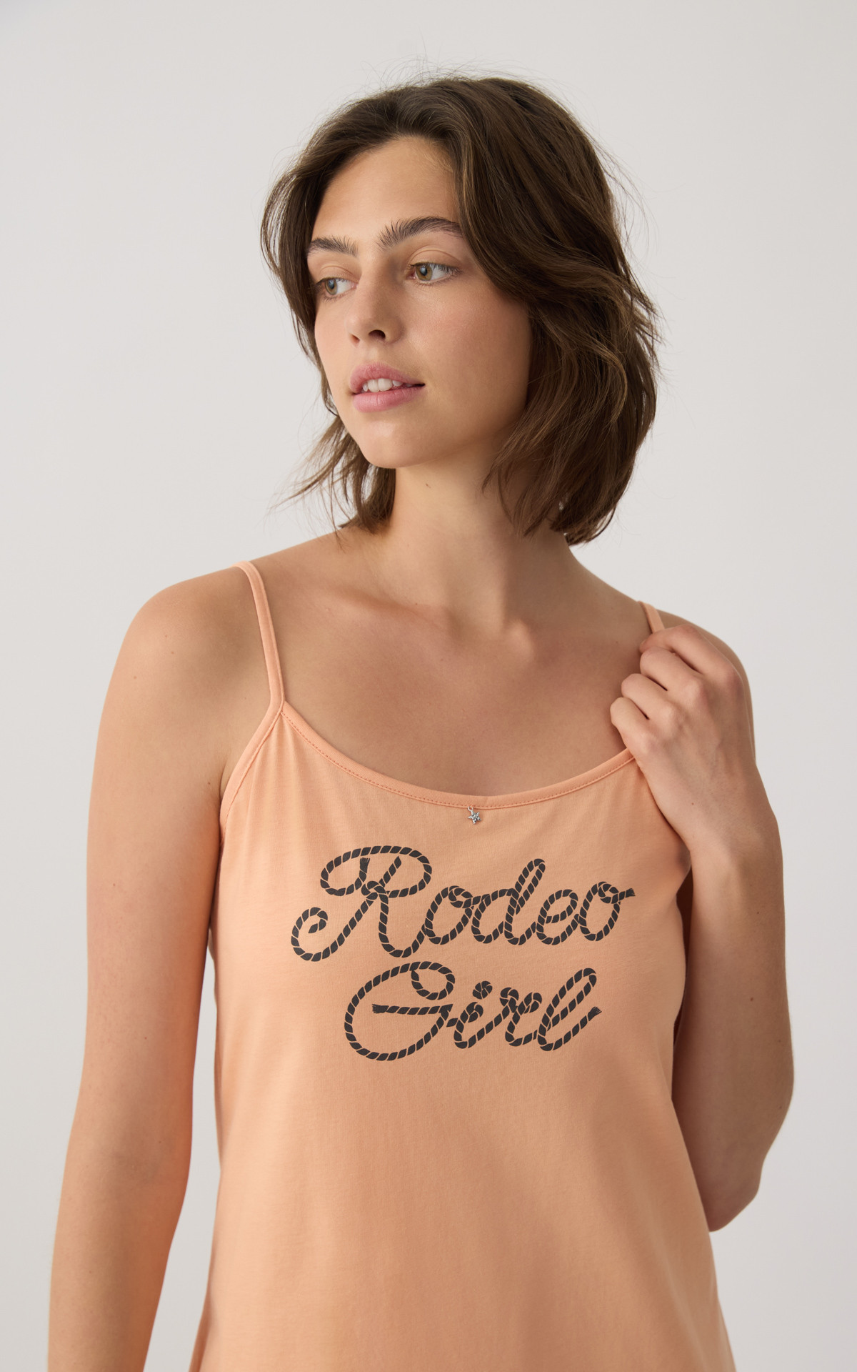 Short nightdress with thin straps and a modern front print that adds a youthful and feminine touch. Made from 100% premium-quality cotton fabric, it offers a soft feel and breathable comfort throughout the night.