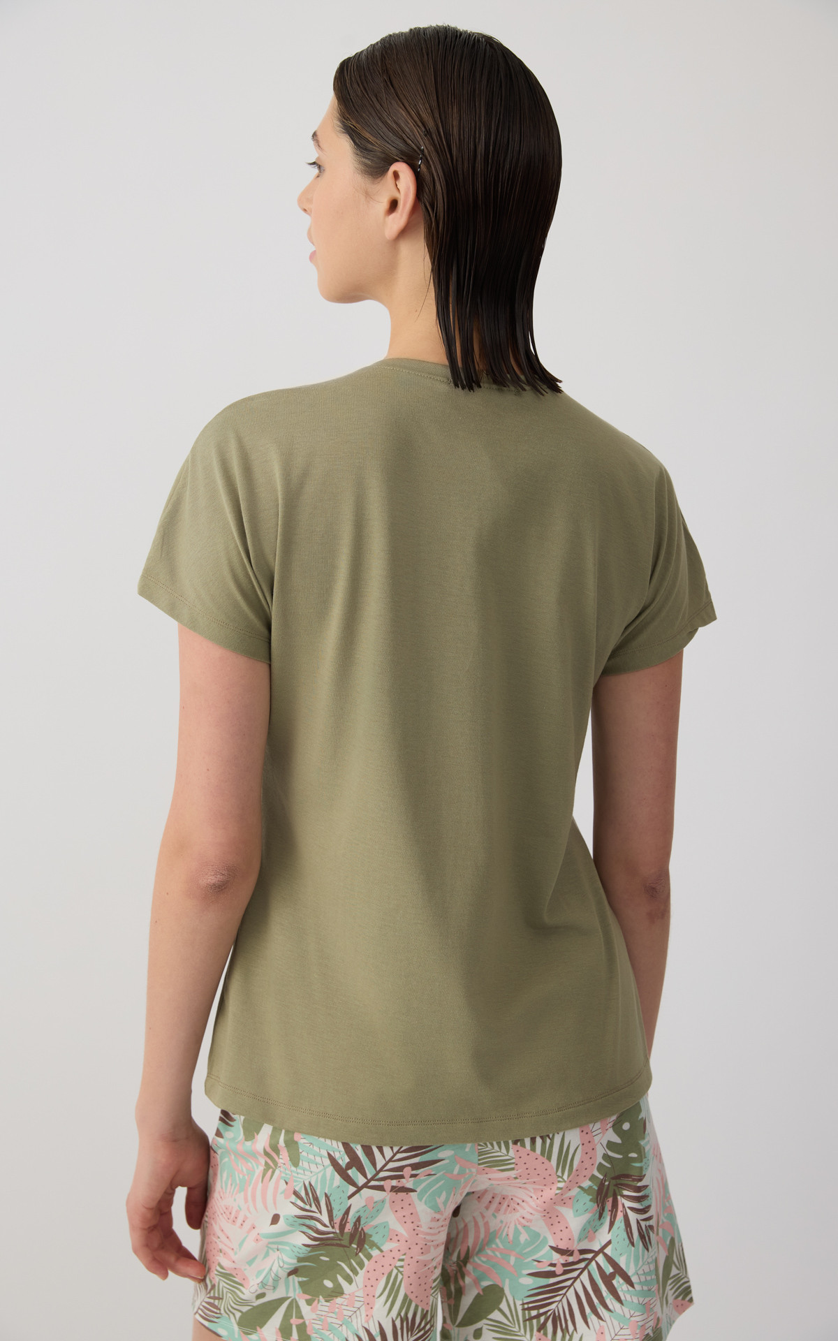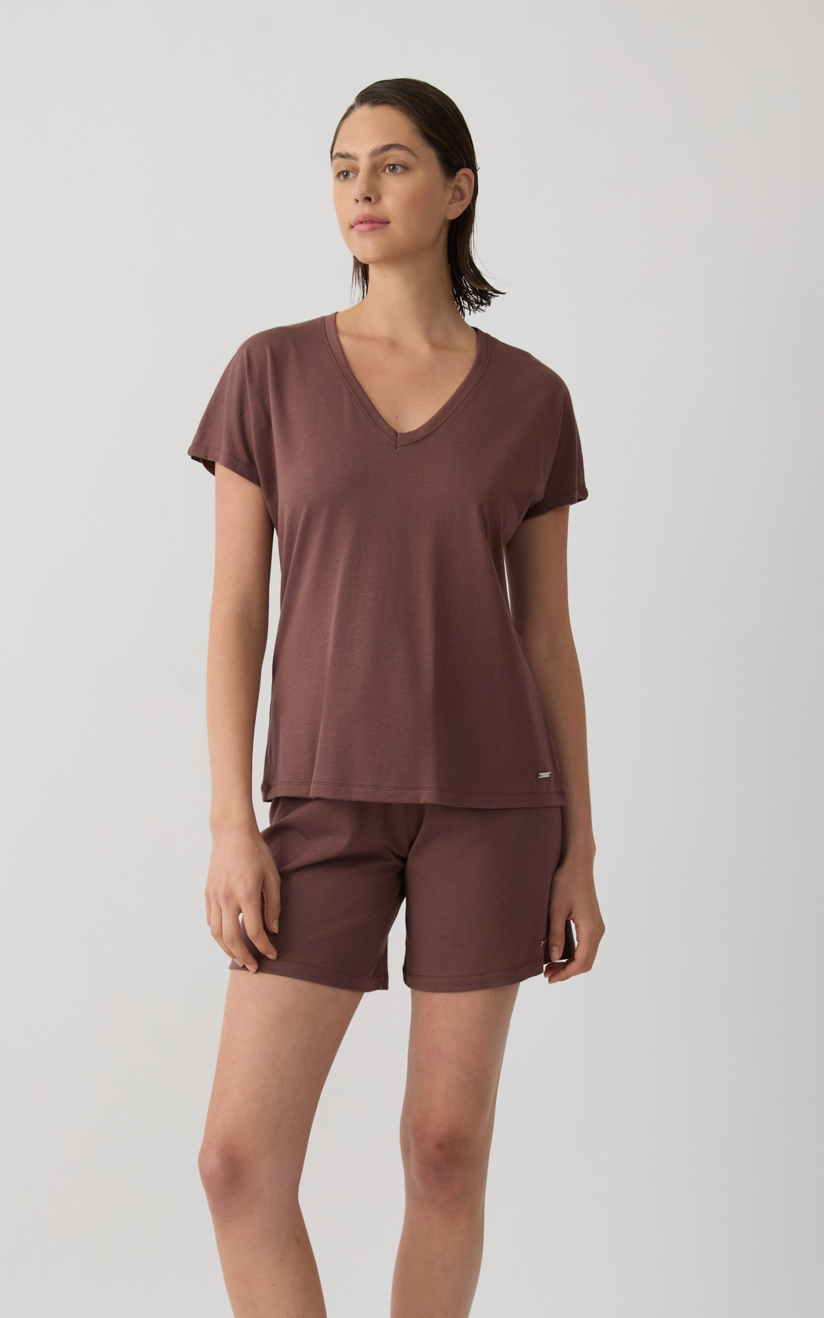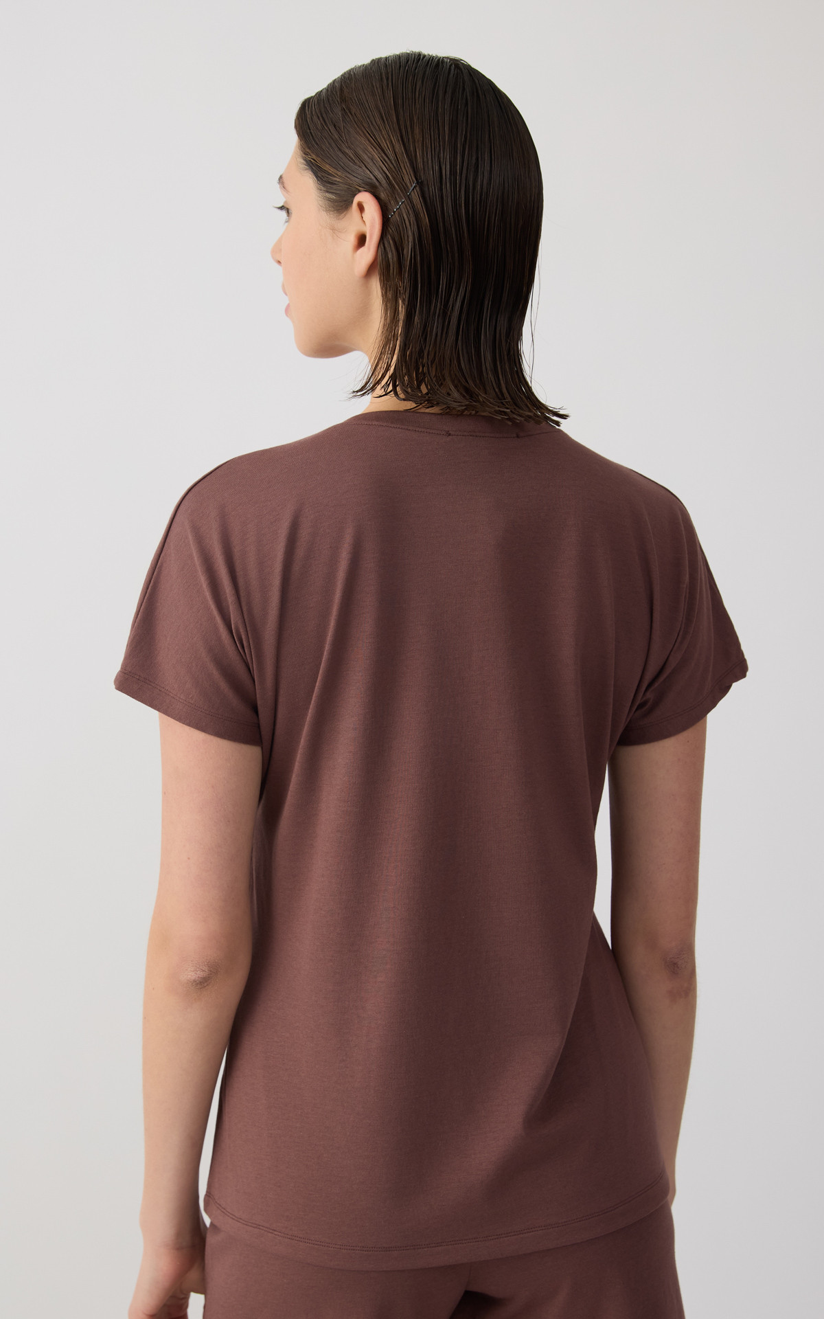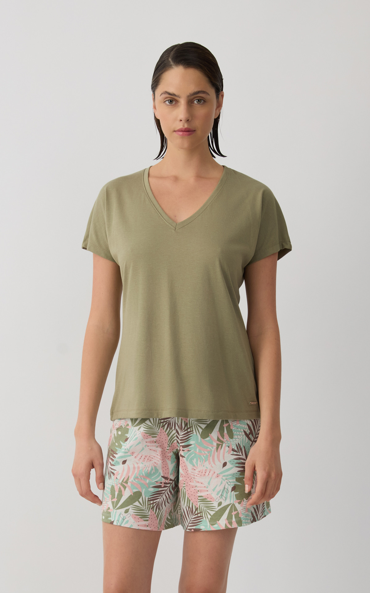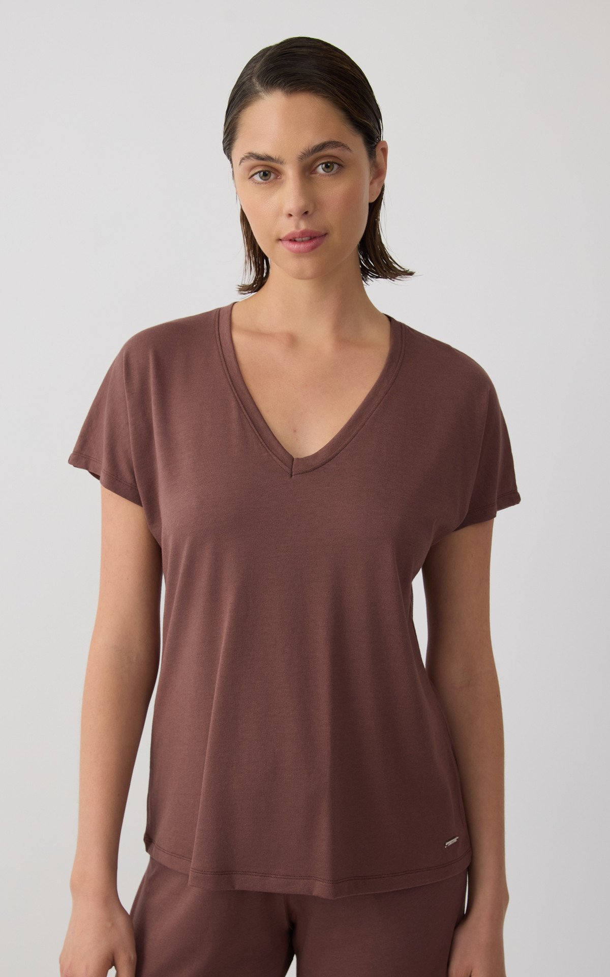 Solid-colored women's top with kimono-style sleeves and a V neckline, offering a relaxed and elegant fit. Made with 50% TENCEL™ Modal, it provides exceptional softness, natural breathability, and a smooth feel against the skin. An ideal choice for comfort and effortless style, perfect for relaxing at home or everyday wear.