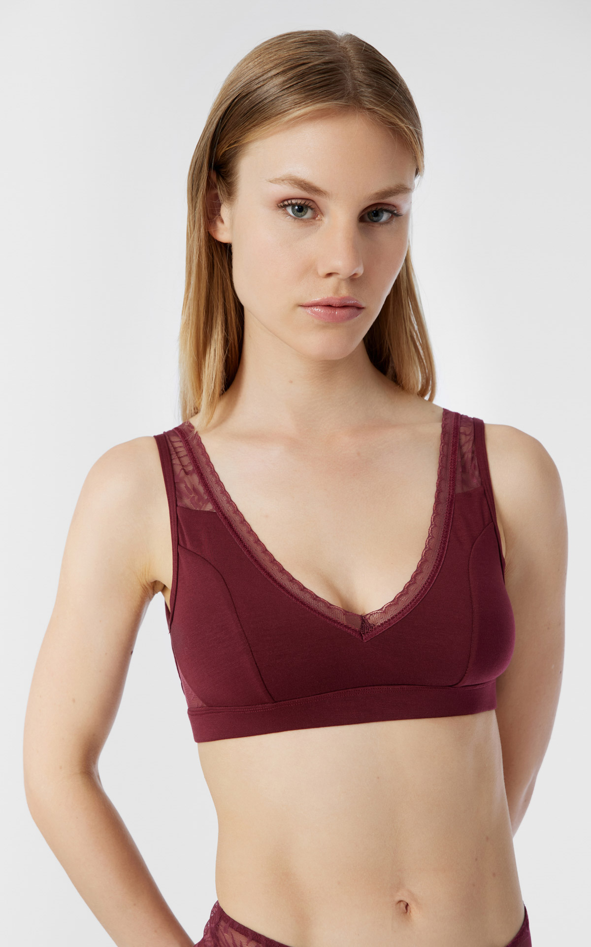 High neck bralette with wide straps and back closure. Made from 95% TENCEL™ Modal fiber and 5% elastane. TENCEL&trade Modal fiber is derived from the natural polymer cellulose, sourced from renewable and sustainable beech wood. It offers softness, unparalleled fit, and vibrant, lustrous colors. Pair it with the matching briefs from the same collection.