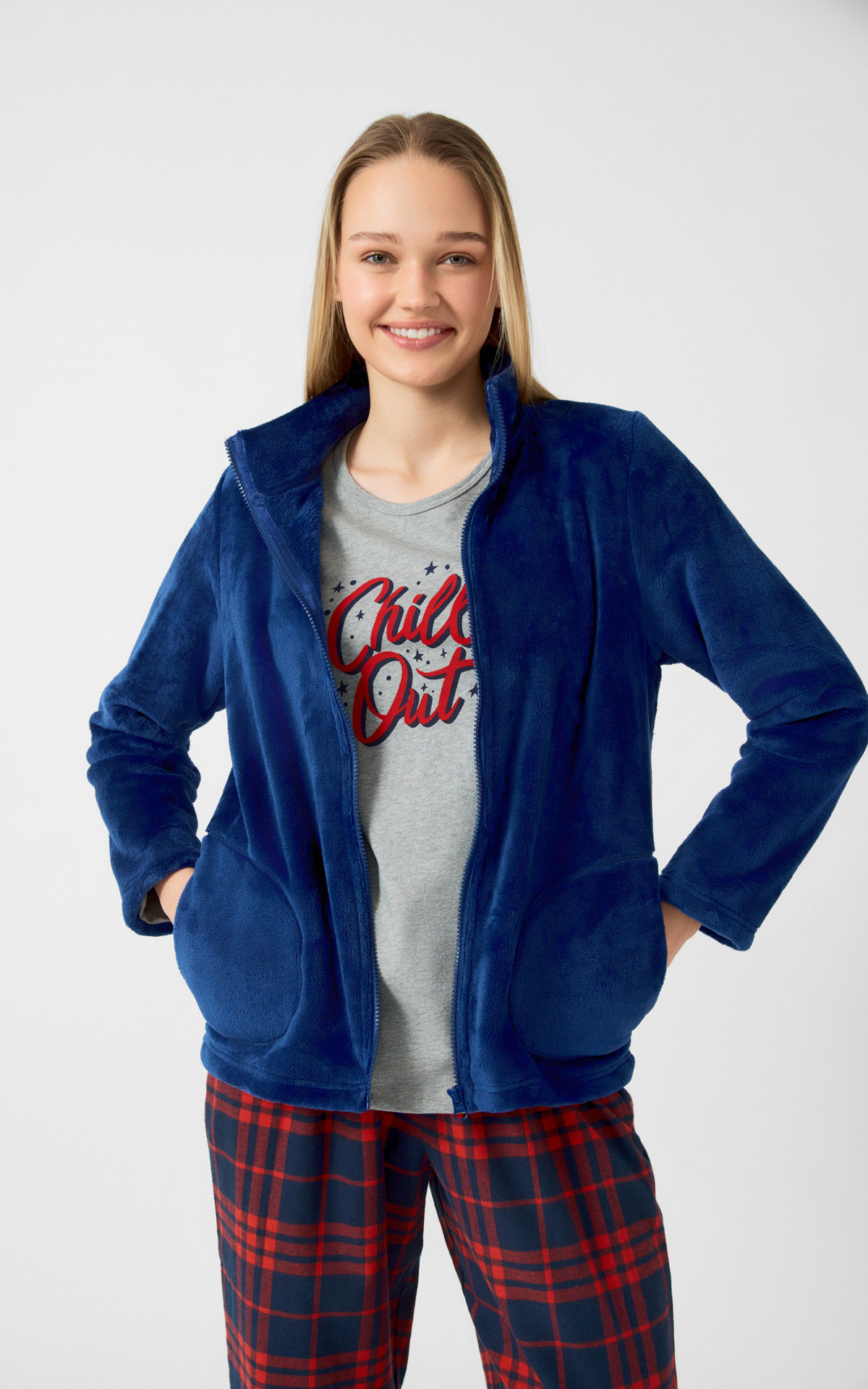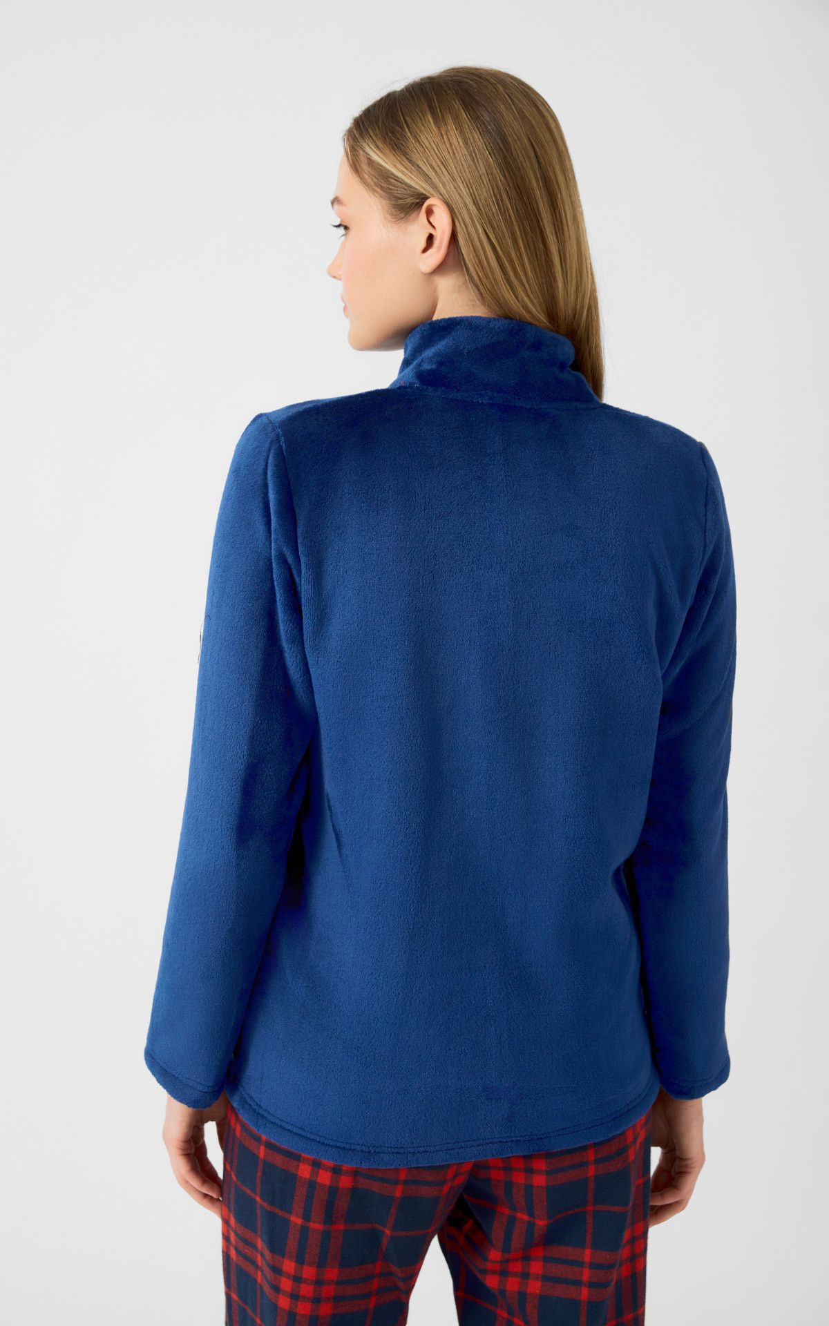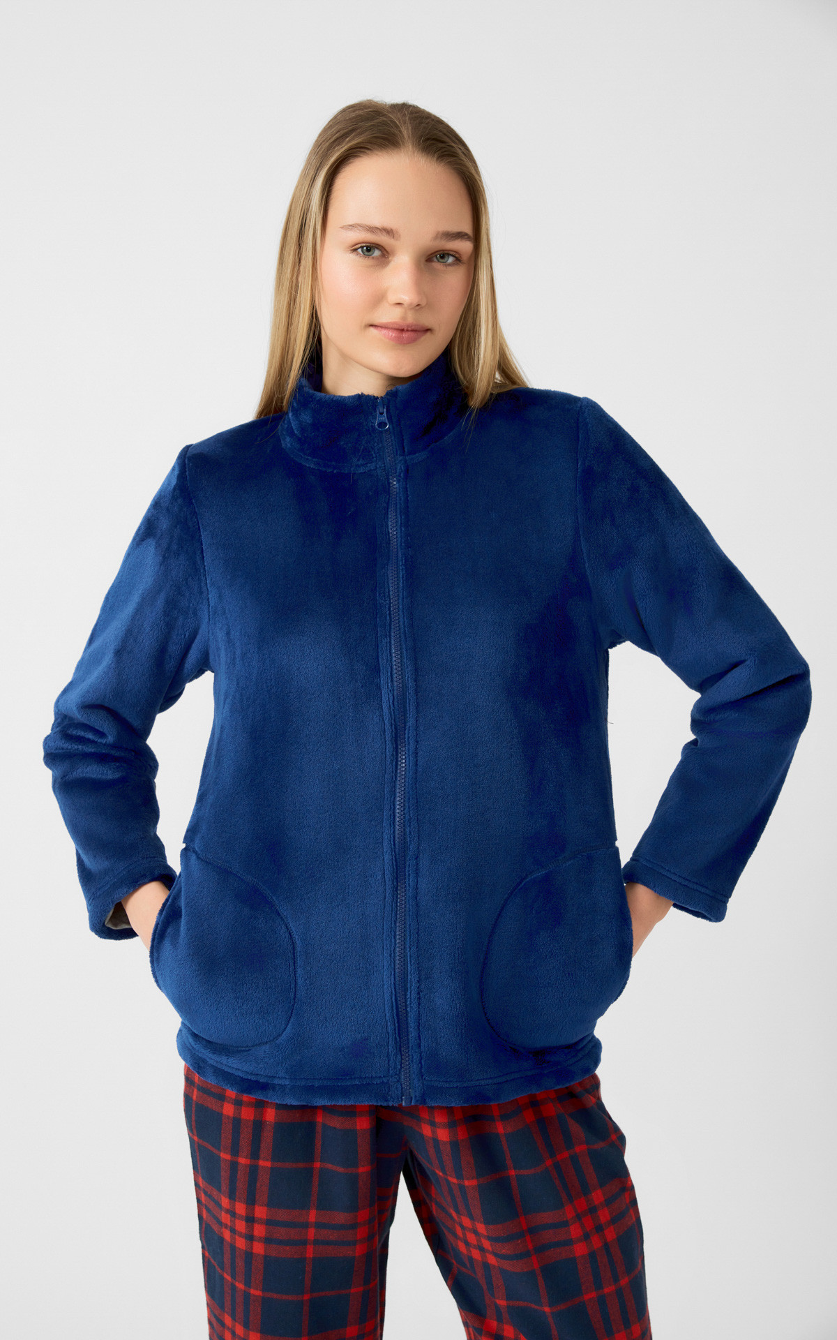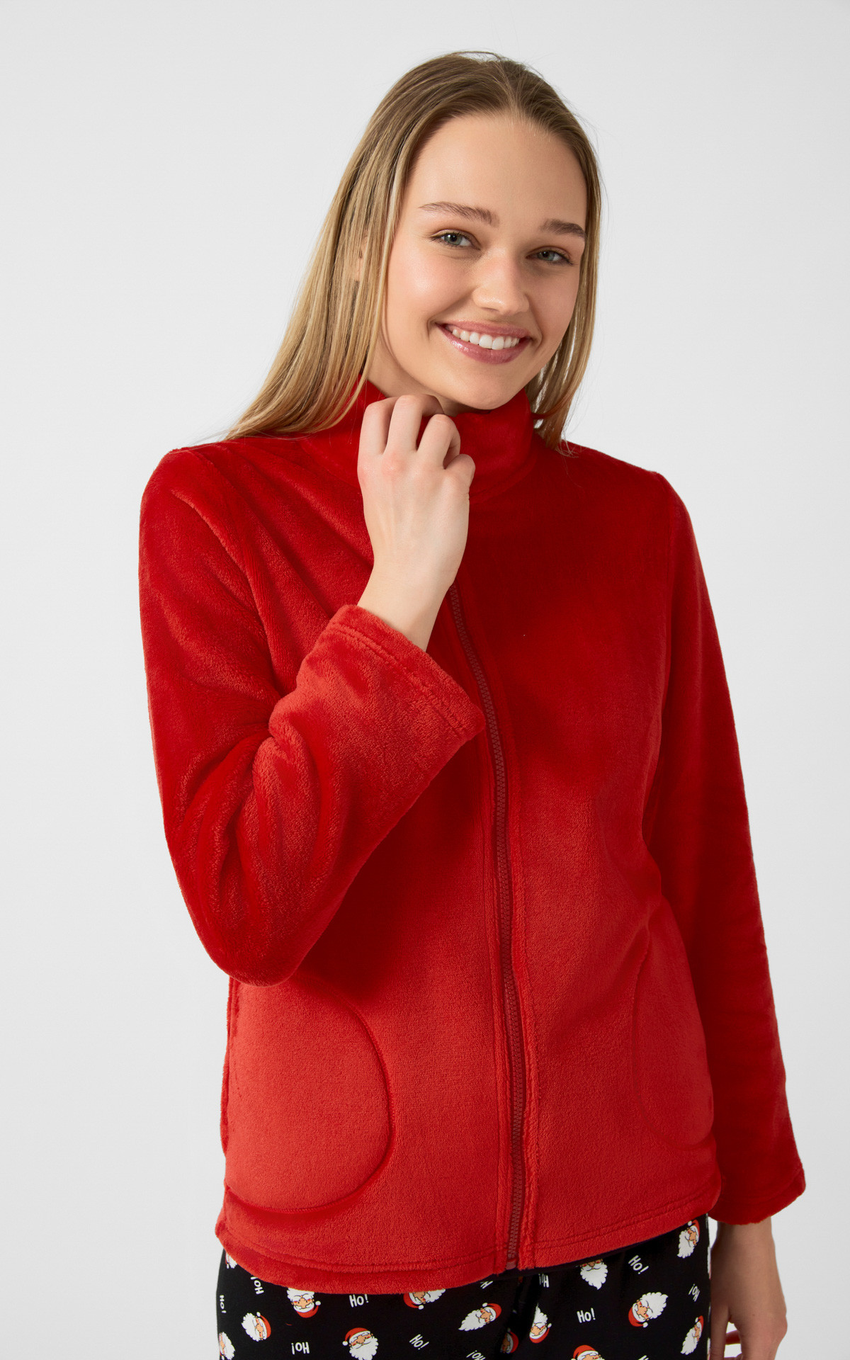 Fleece jacket made of 100% polyester, featuring a stand-up collar, zipper, and pockets. Pair it with the women's pajamas from the same MINERVA collection for your family looks.