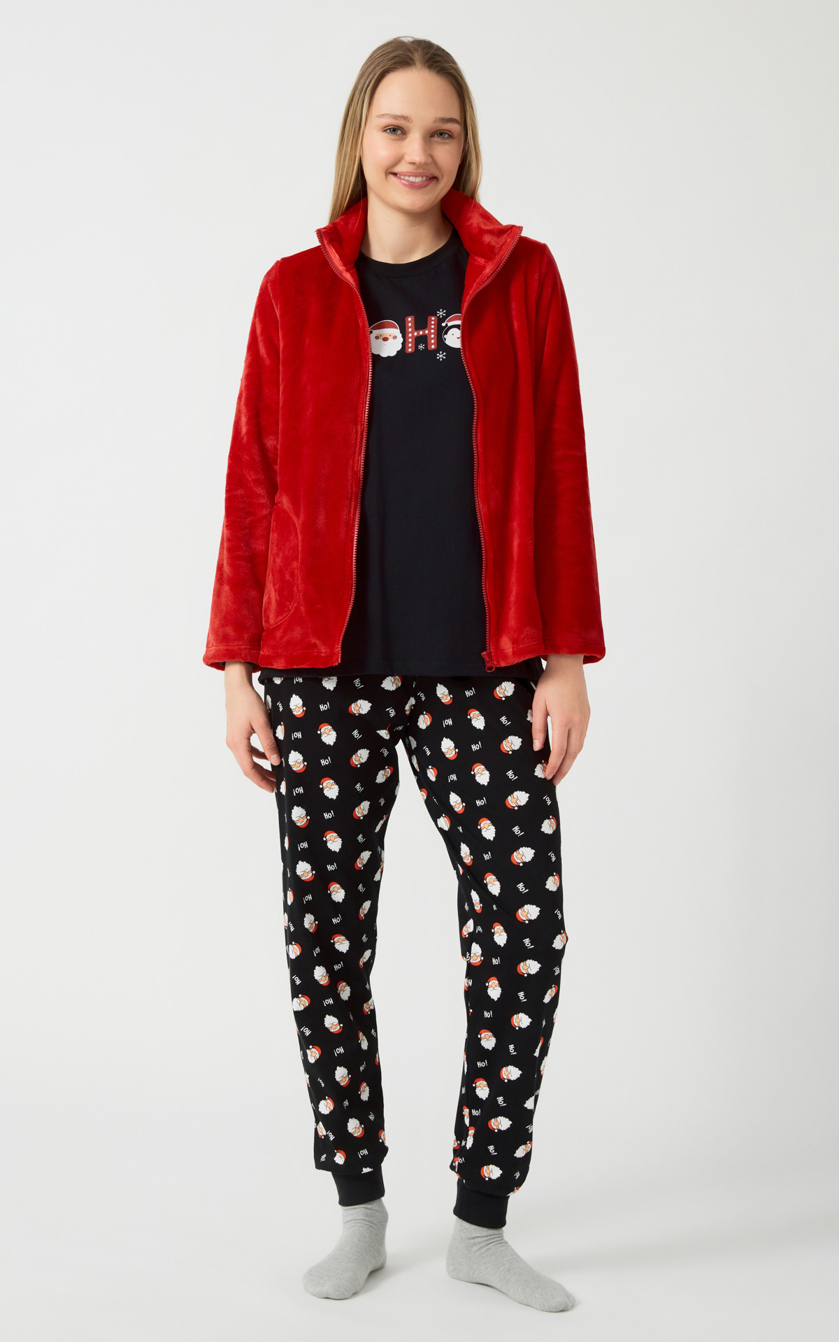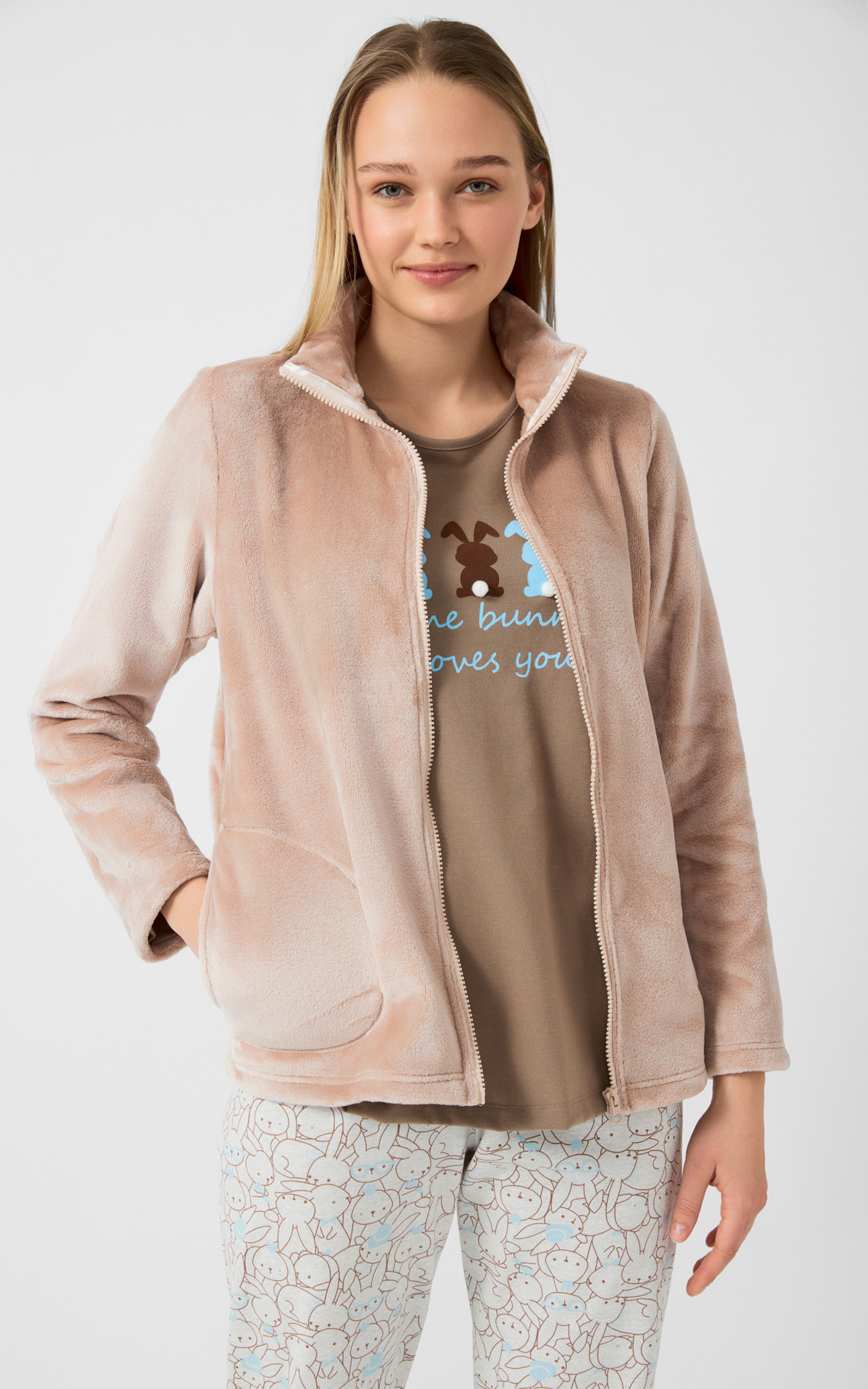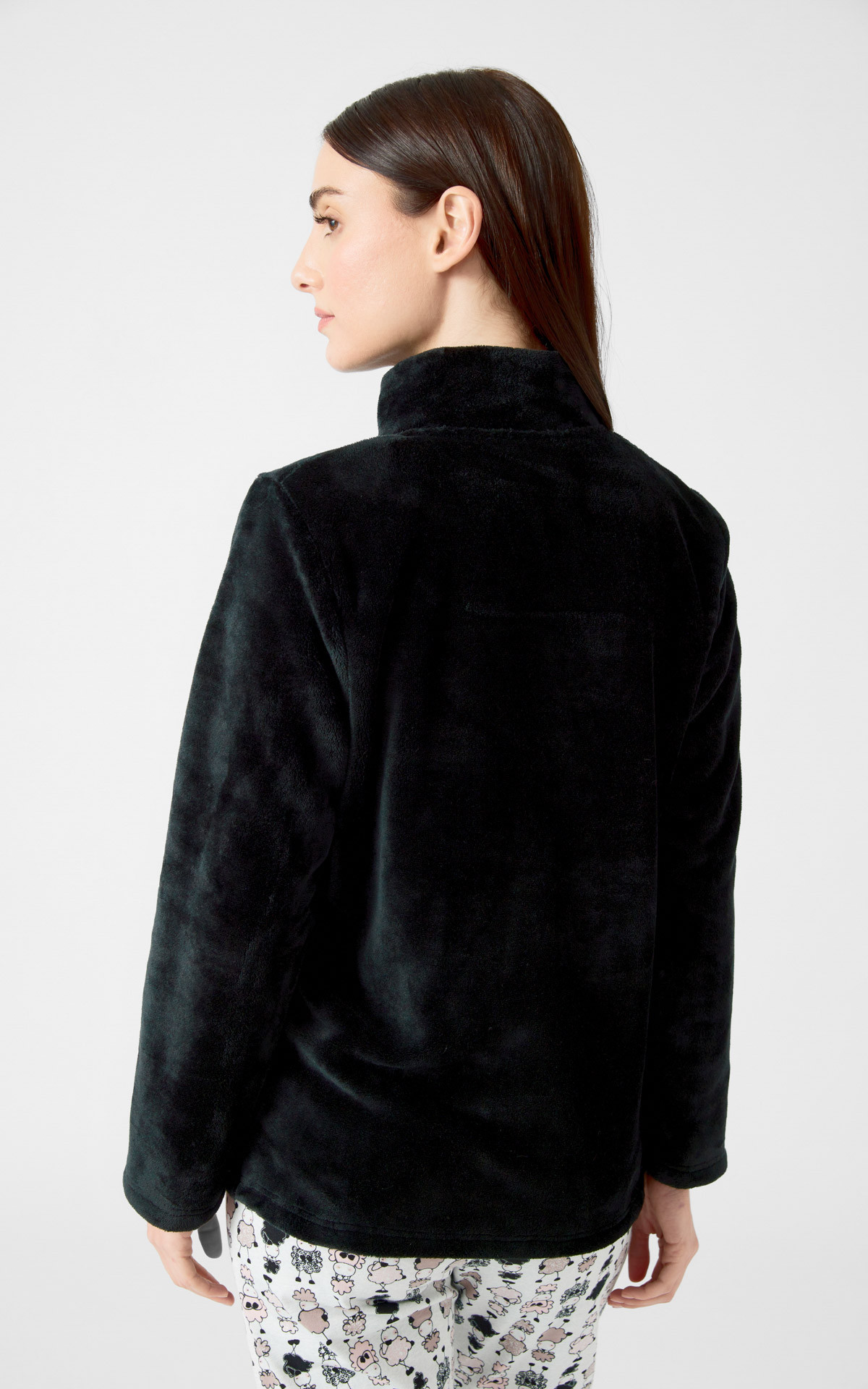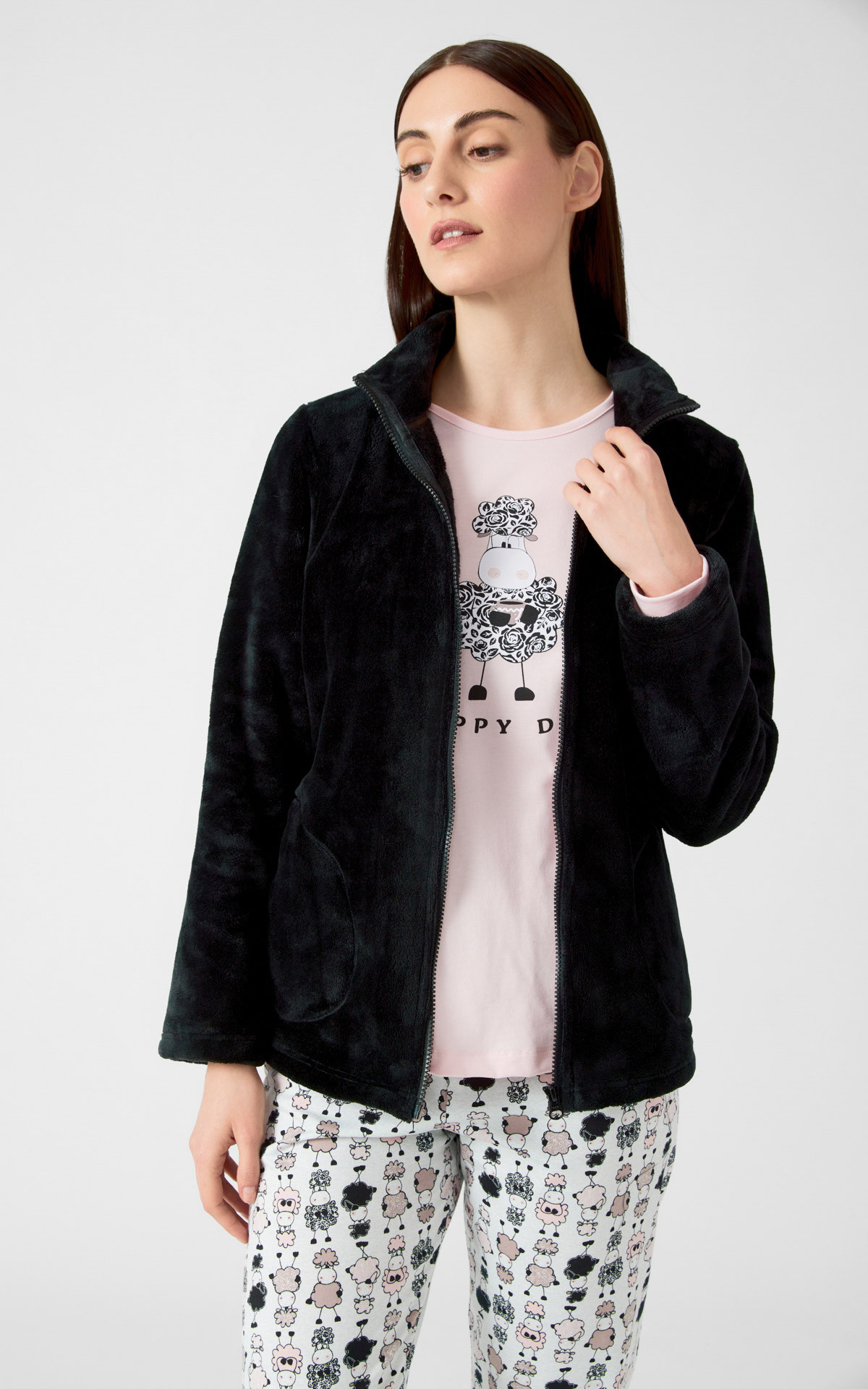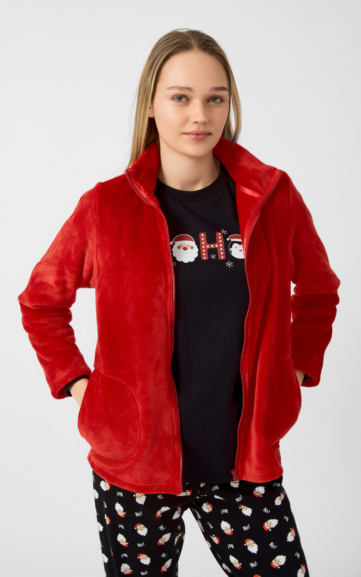 Fleece jacket made of 100% polyester, featuring a stand-up collar, zipper, and pockets. Pair it with the women's pajamas from the same MINERVA collection for your family looks.