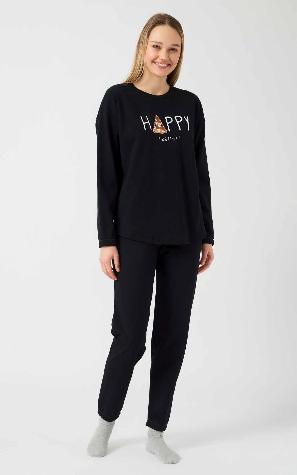 Warm winter pajamas made of 100% high-quality cotton fleece fabric. The set includes a long-sleeve sweatshirt with a chest print and internal elastic at the sleeve cuffs. The pants also feature internal elastic at the cuffs.