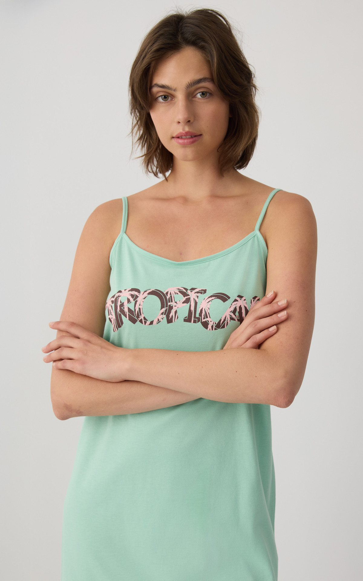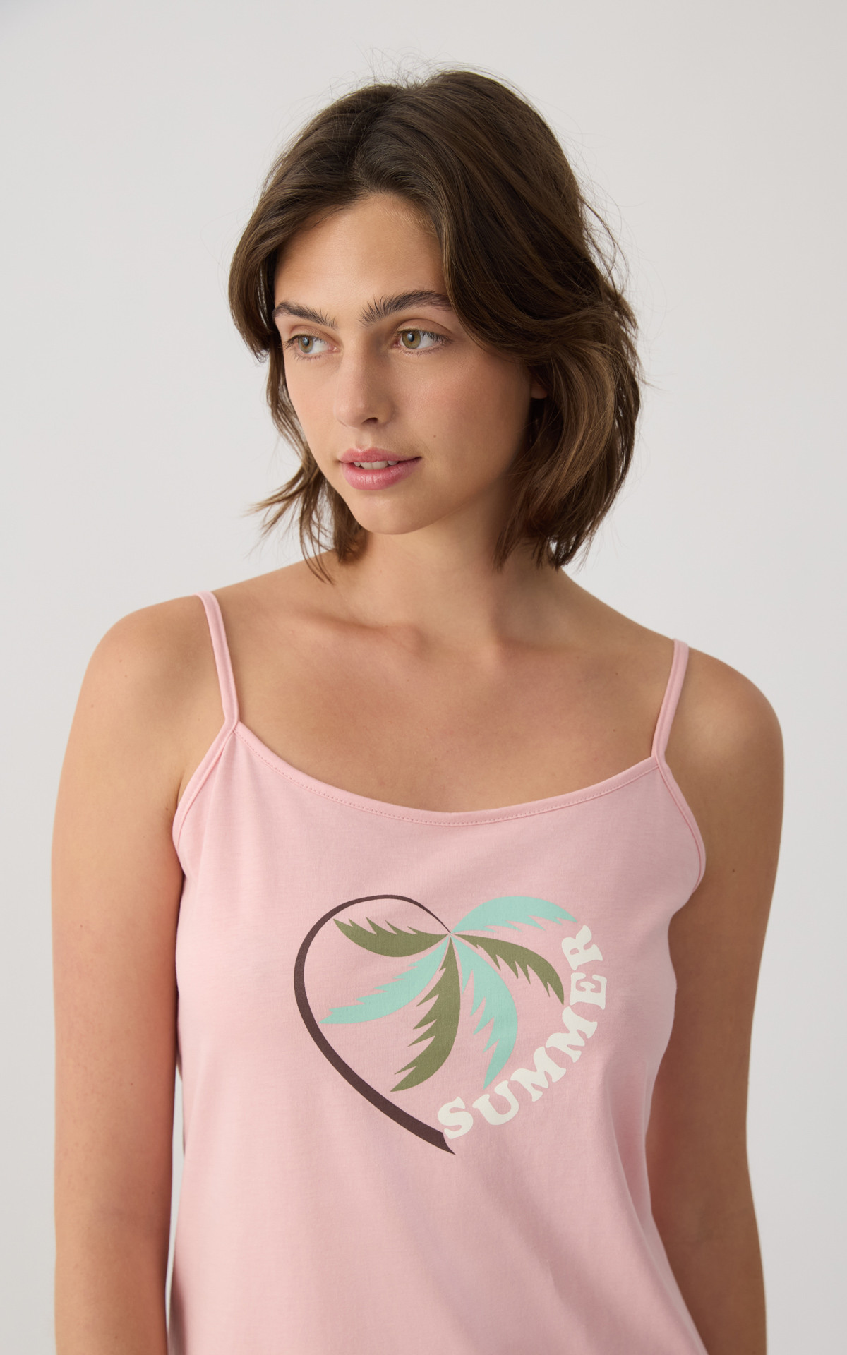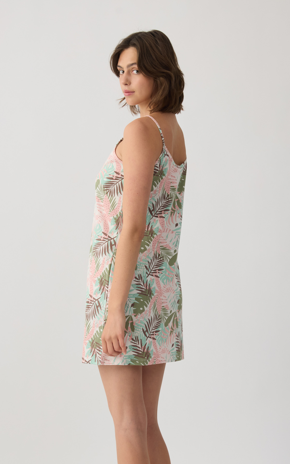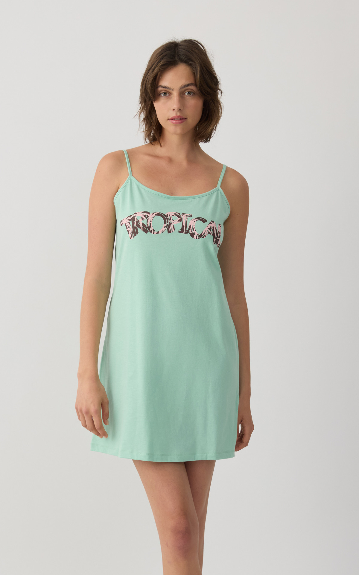 Short nightdress with thin straps and a decorative chest print that adds a modern and summery touch. Made from 100% premium-quality cotton, it offers a soft feel, breathable comfort, and a lightweight fit throughout the night.