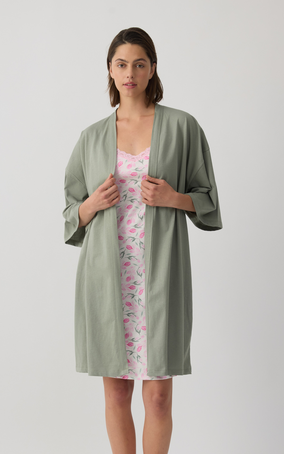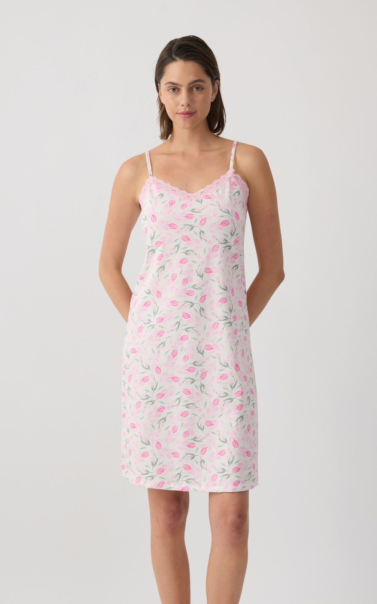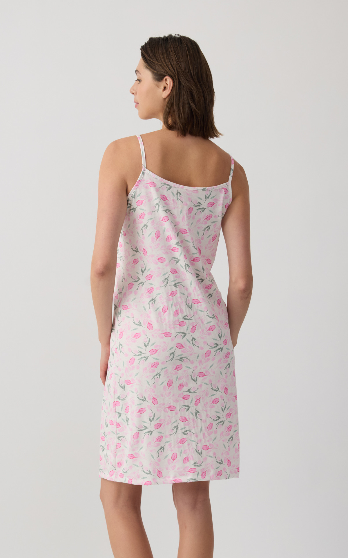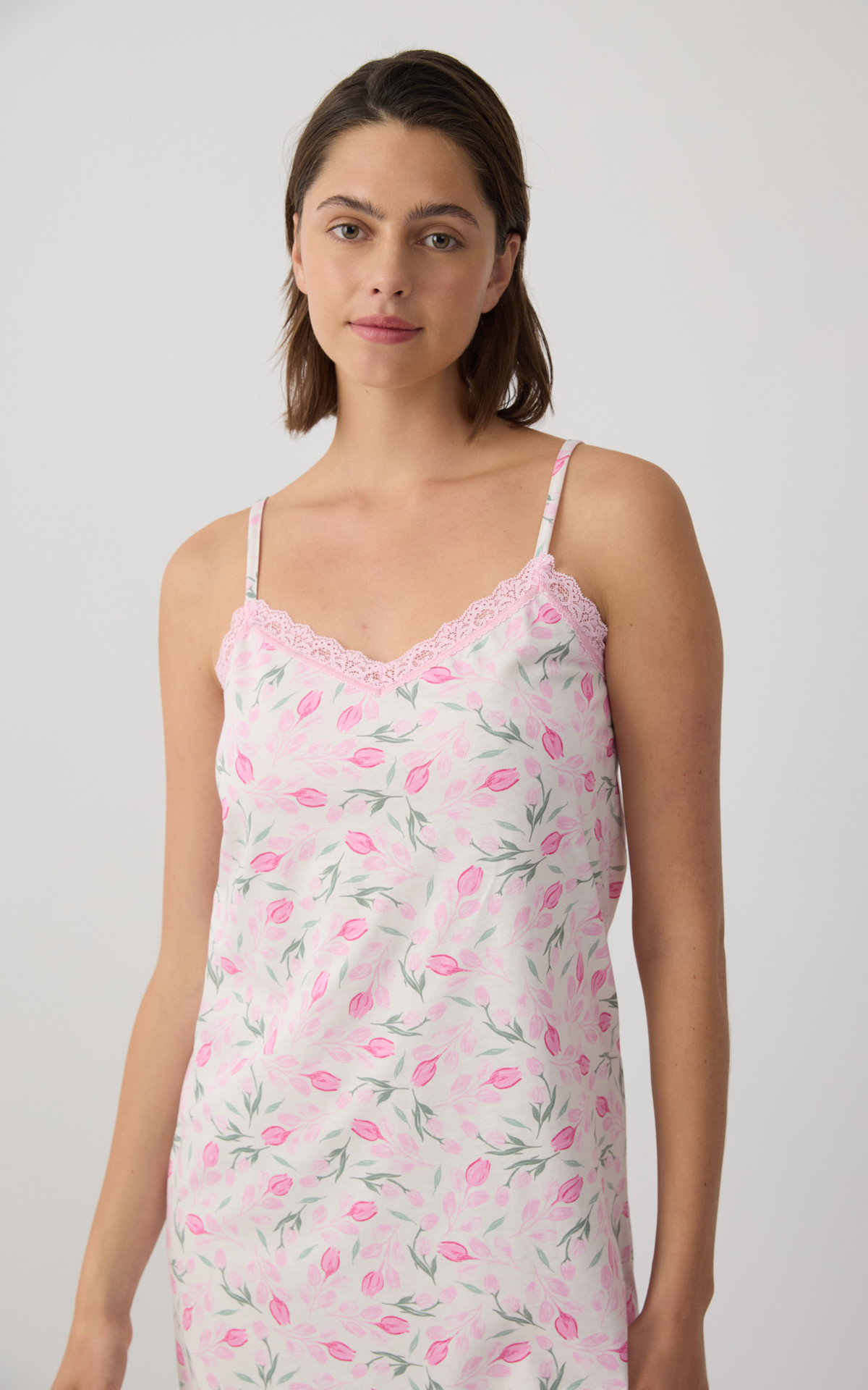 Nightdress with thin straps and an elegant all-over print that adds a feminine and summery touch. Made from 100% premium-quality cotton fabric, it offers a soft feel and breathable comfort throughout the night. It features delicate lace detail at the neckline for an elegant finish, while the relaxed fit ensures freedom of movement.