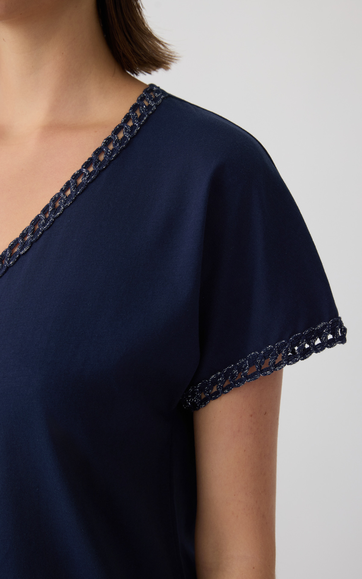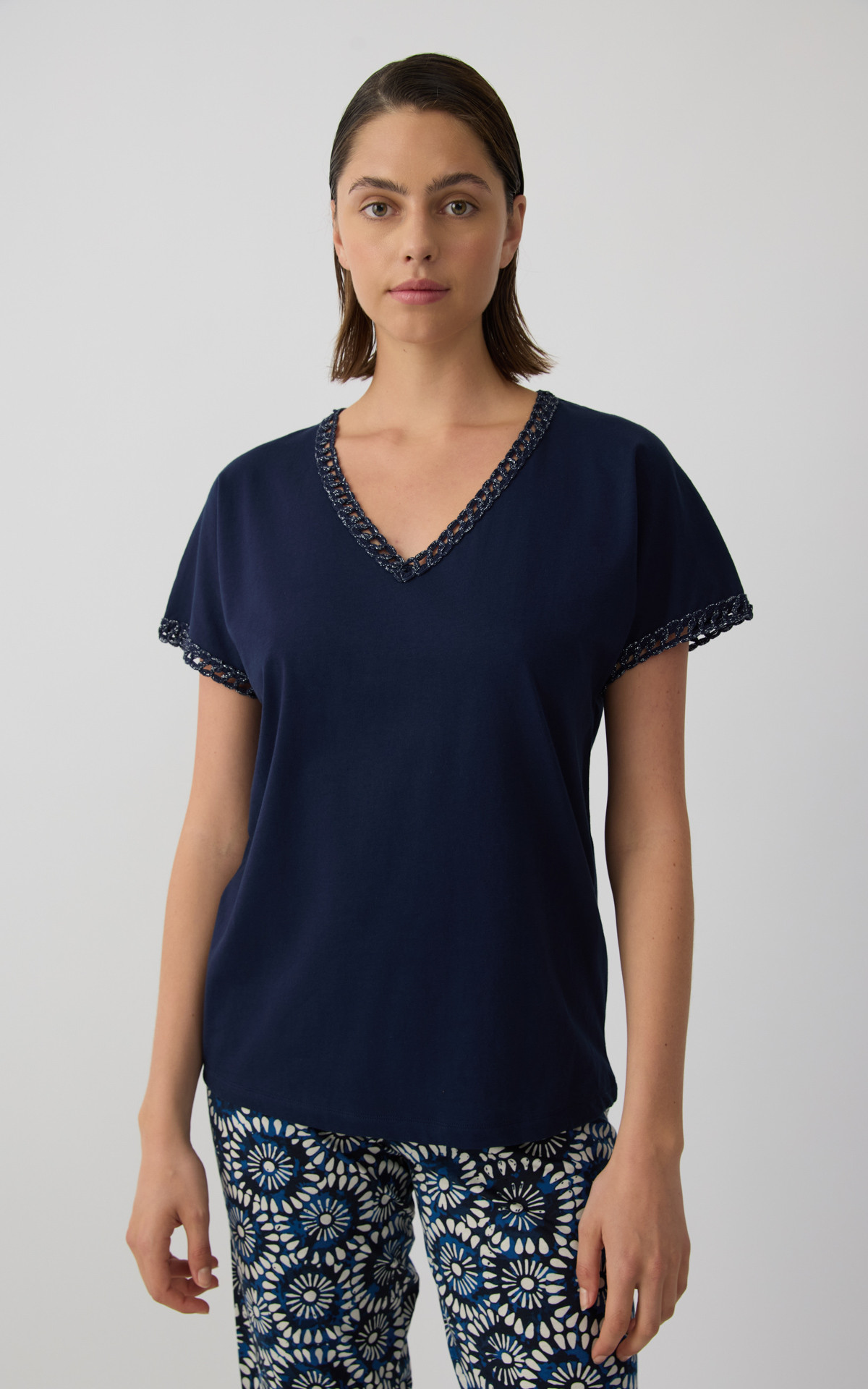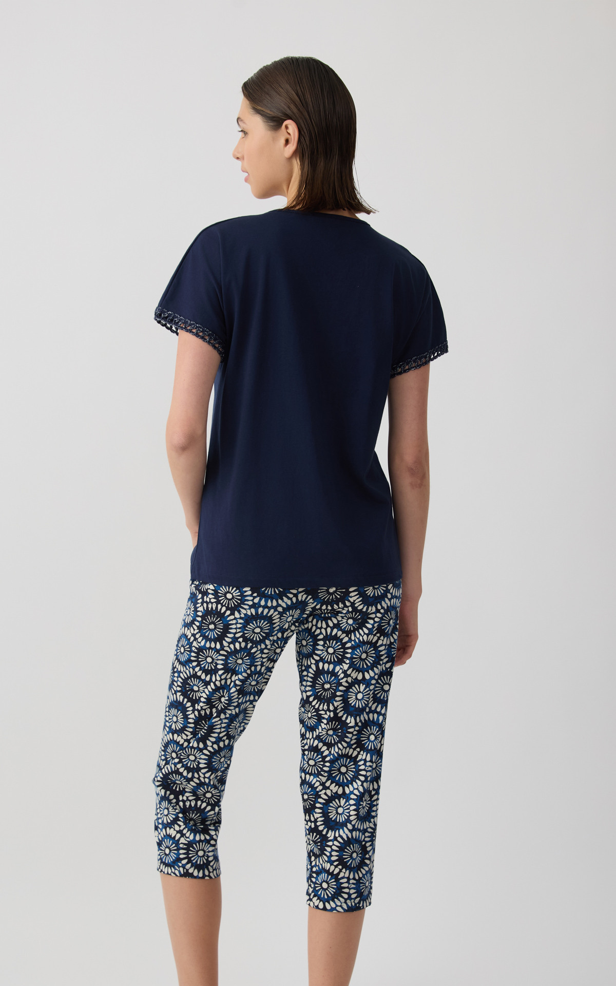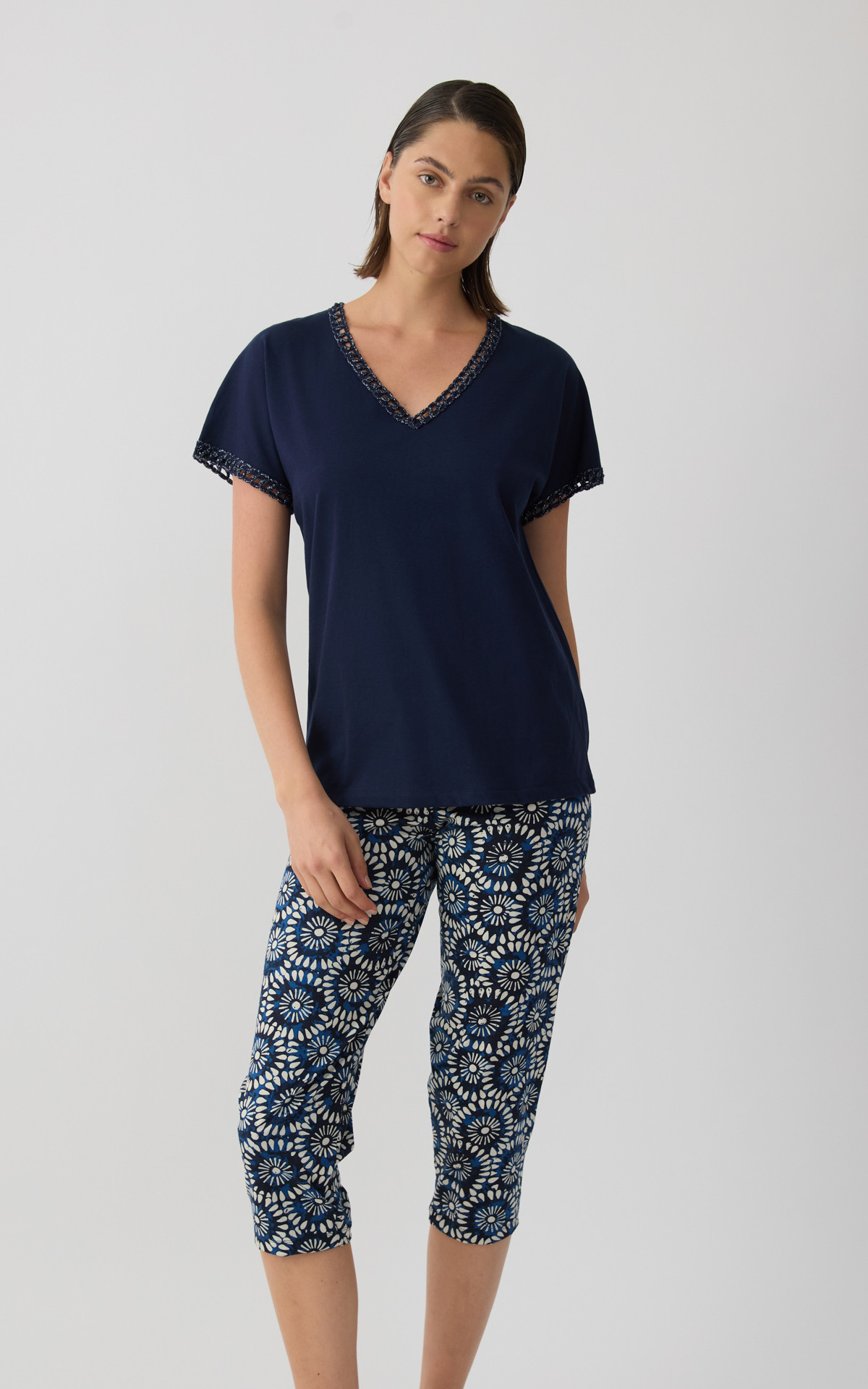 Women's pajama set made from 100% premium-quality cotton fabric, offering softness and comfort throughout the night. The set includes a short-sleeve top with an elegant V-neckline and subtle finishing details, paired with printed capri pants featuring an elastic waistband for a comfortable and secure fit.