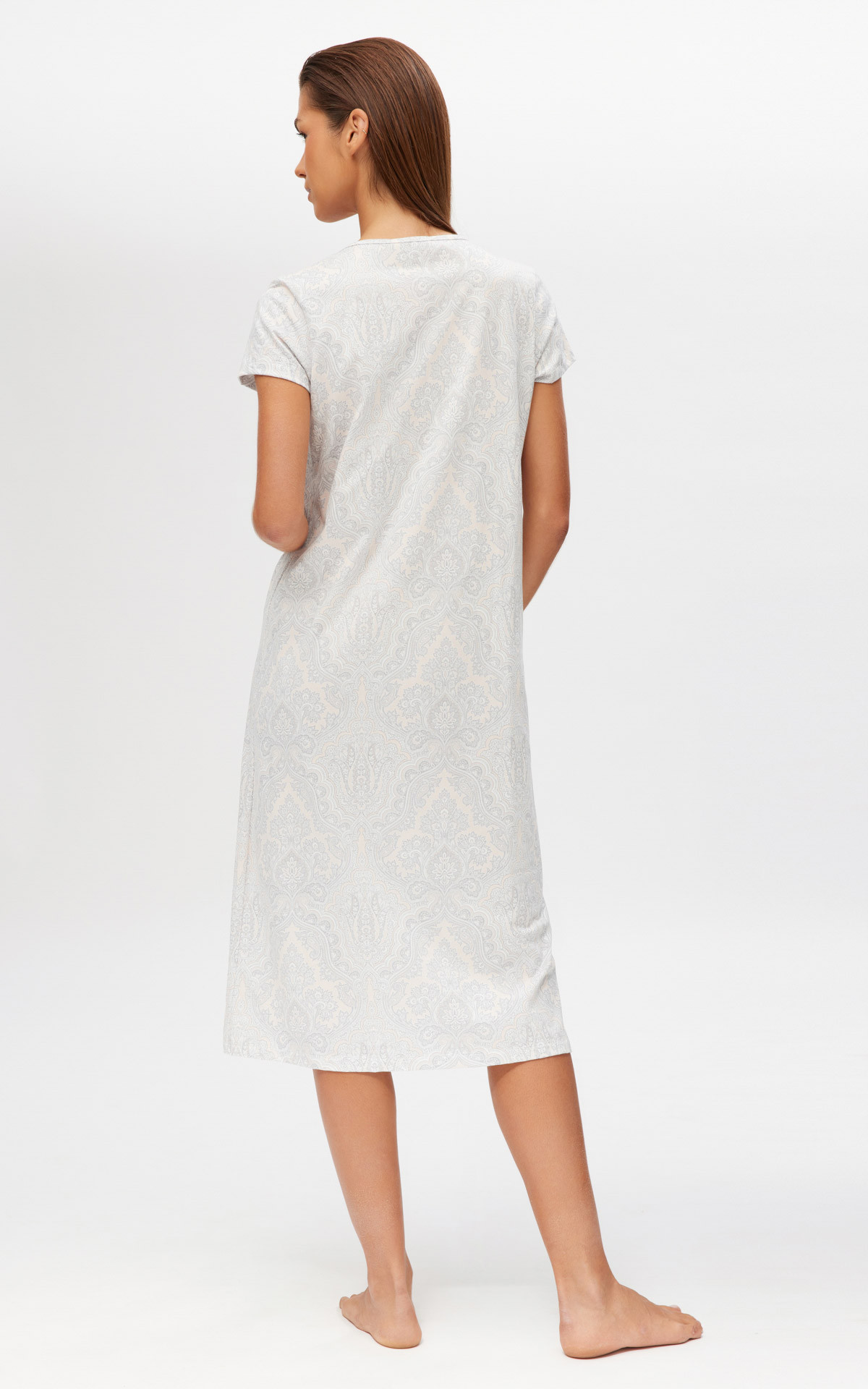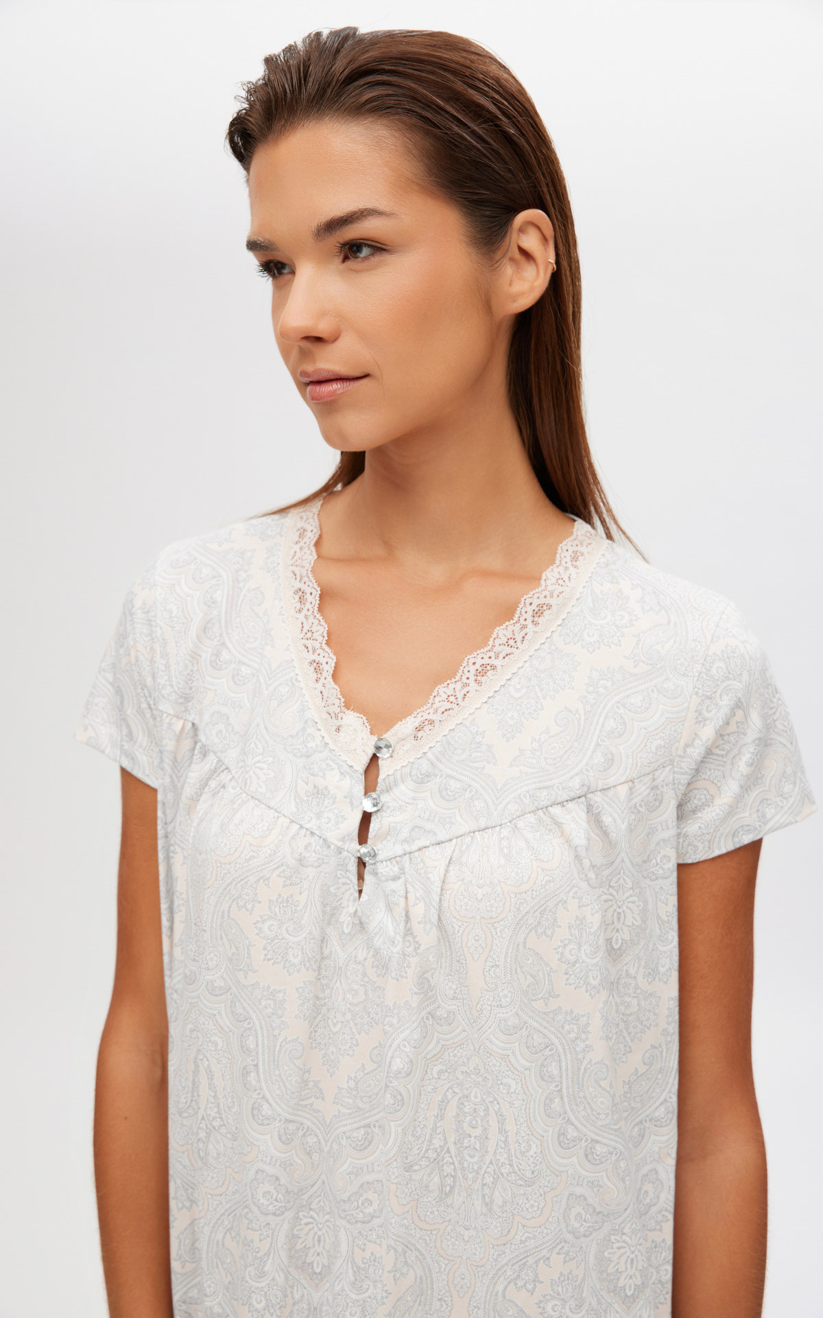 Long nightgown, below the knee, made from 100% high-quality cotton. Features a paisley print, placket, and lace detail on the neckline.